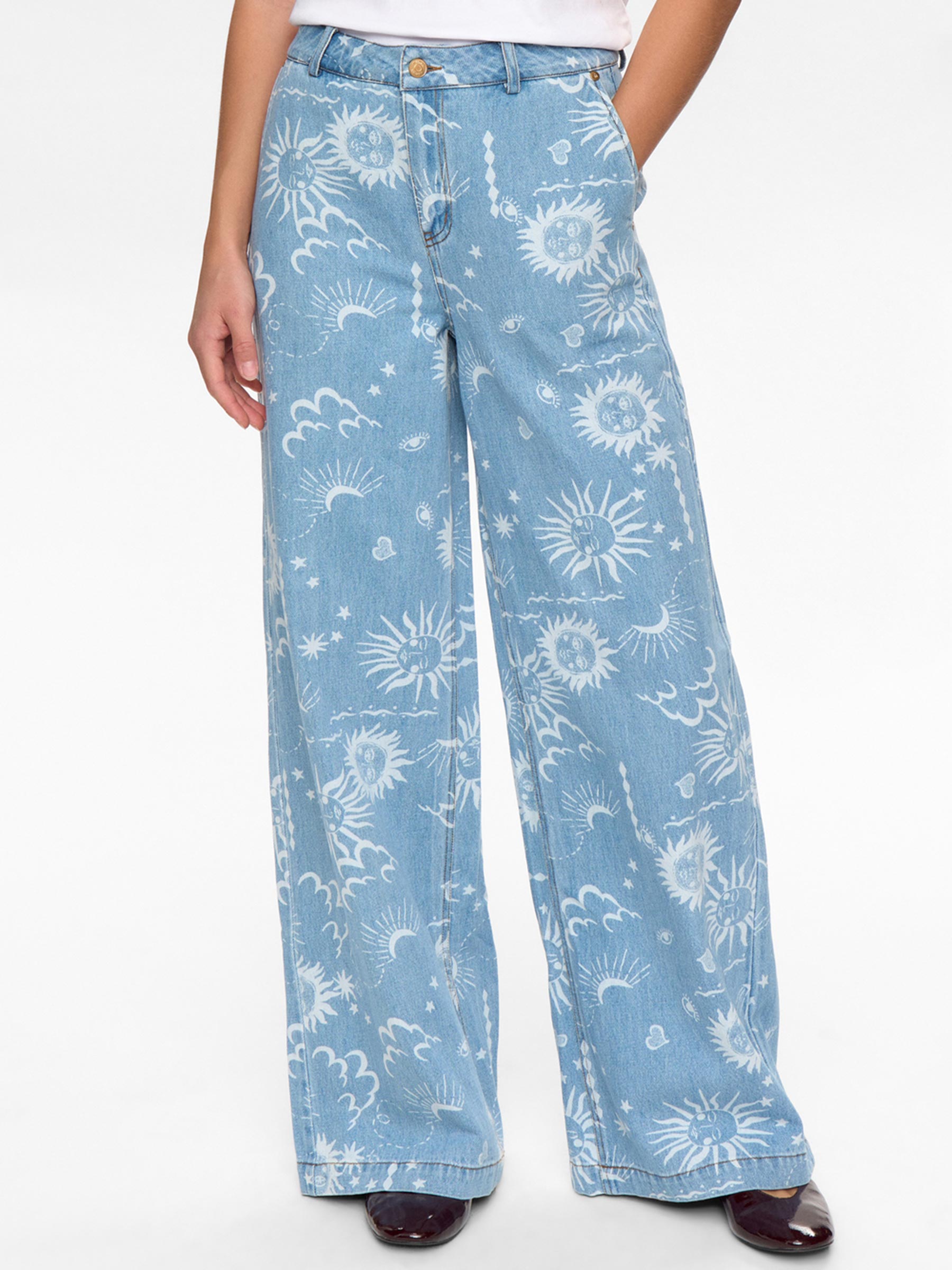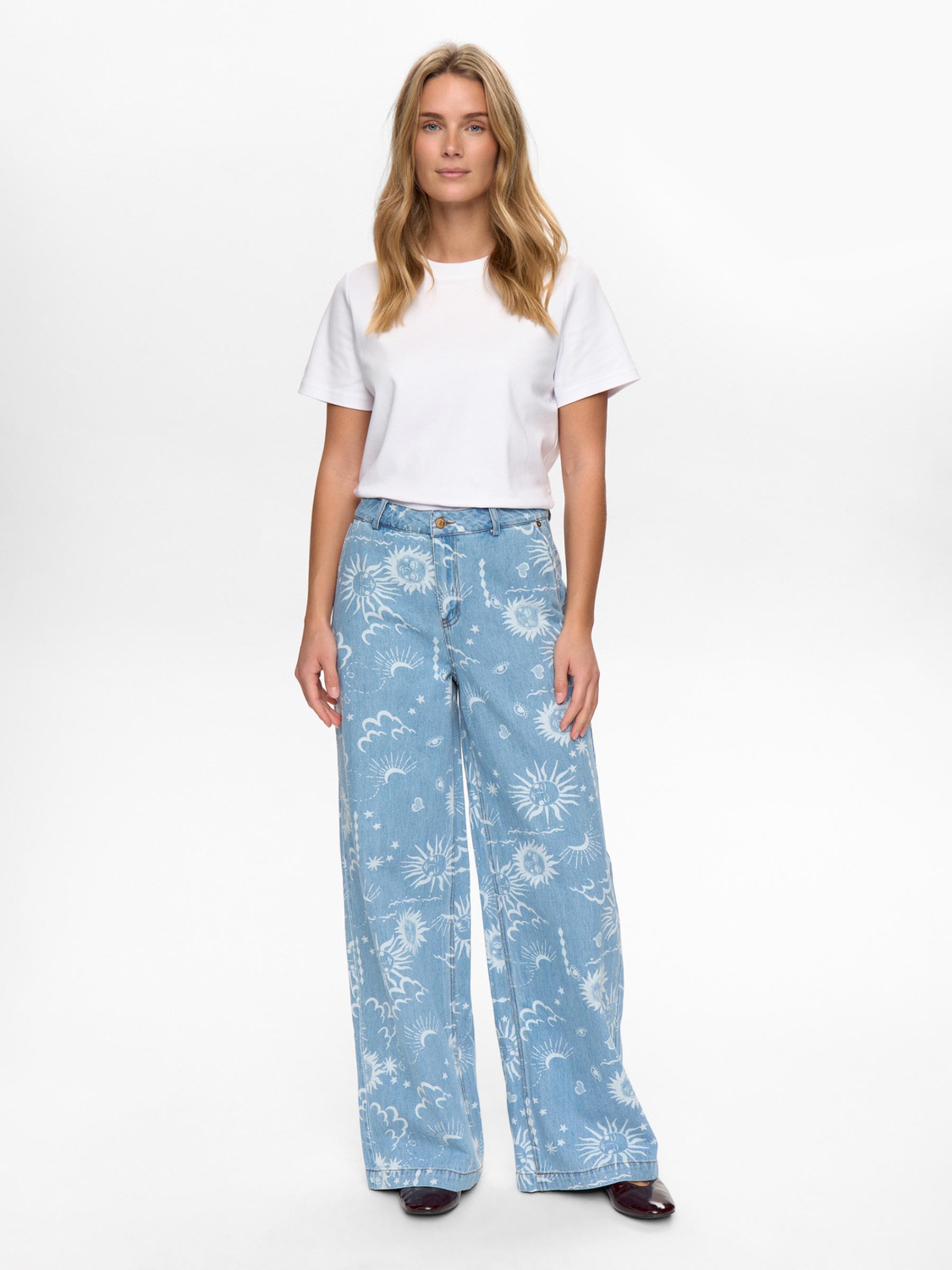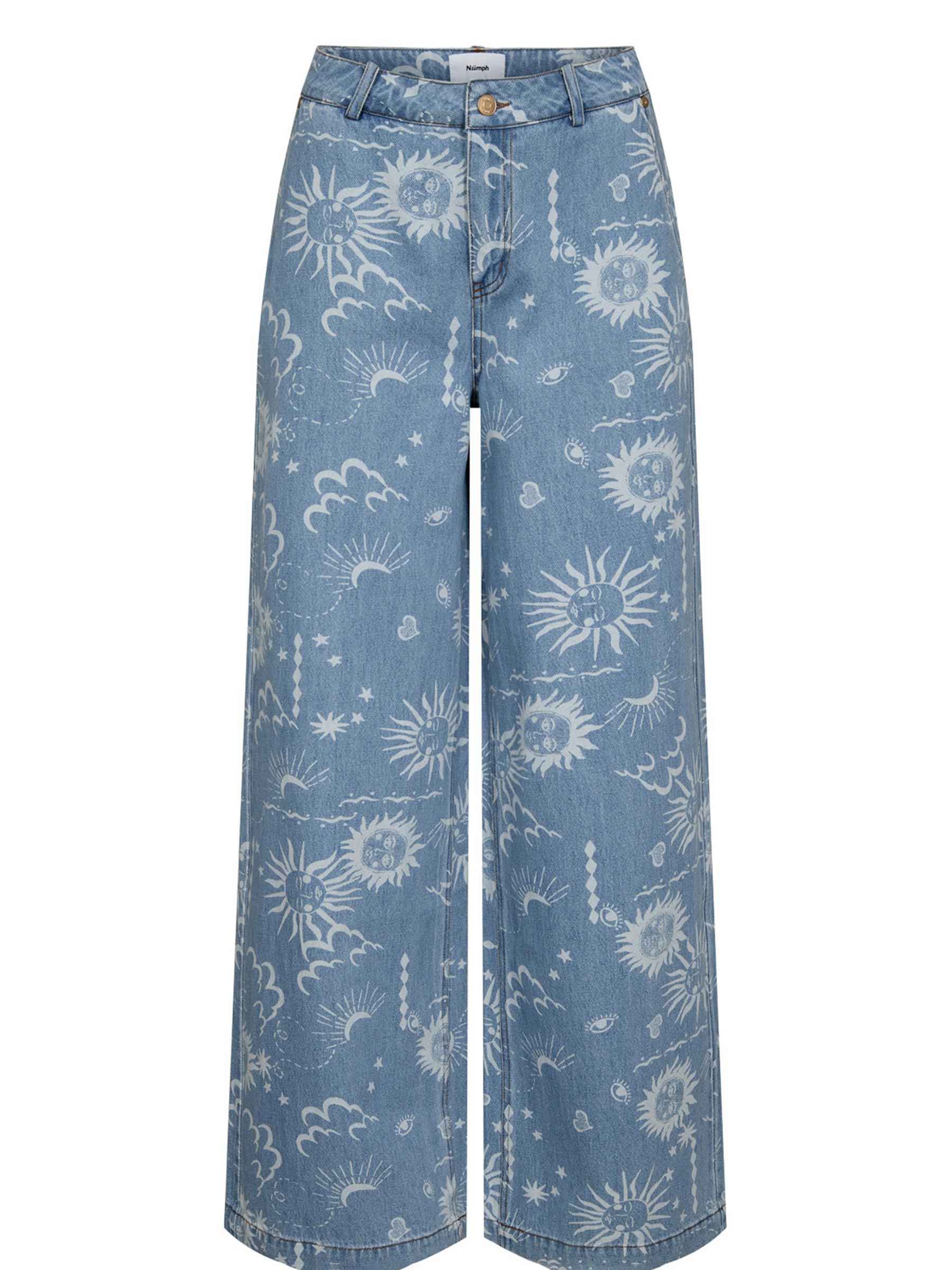 Deze lichte denim jeans van Nümph is een echte blikvanger voor je collectie. De wide leg pasvorm en all-over print geven je outfit meteen een frisse uitstraling en maken elke combinatie net even leuker. Perfect met een simpele top of juist met een opvallende knit voor een outfit die meteen staat.