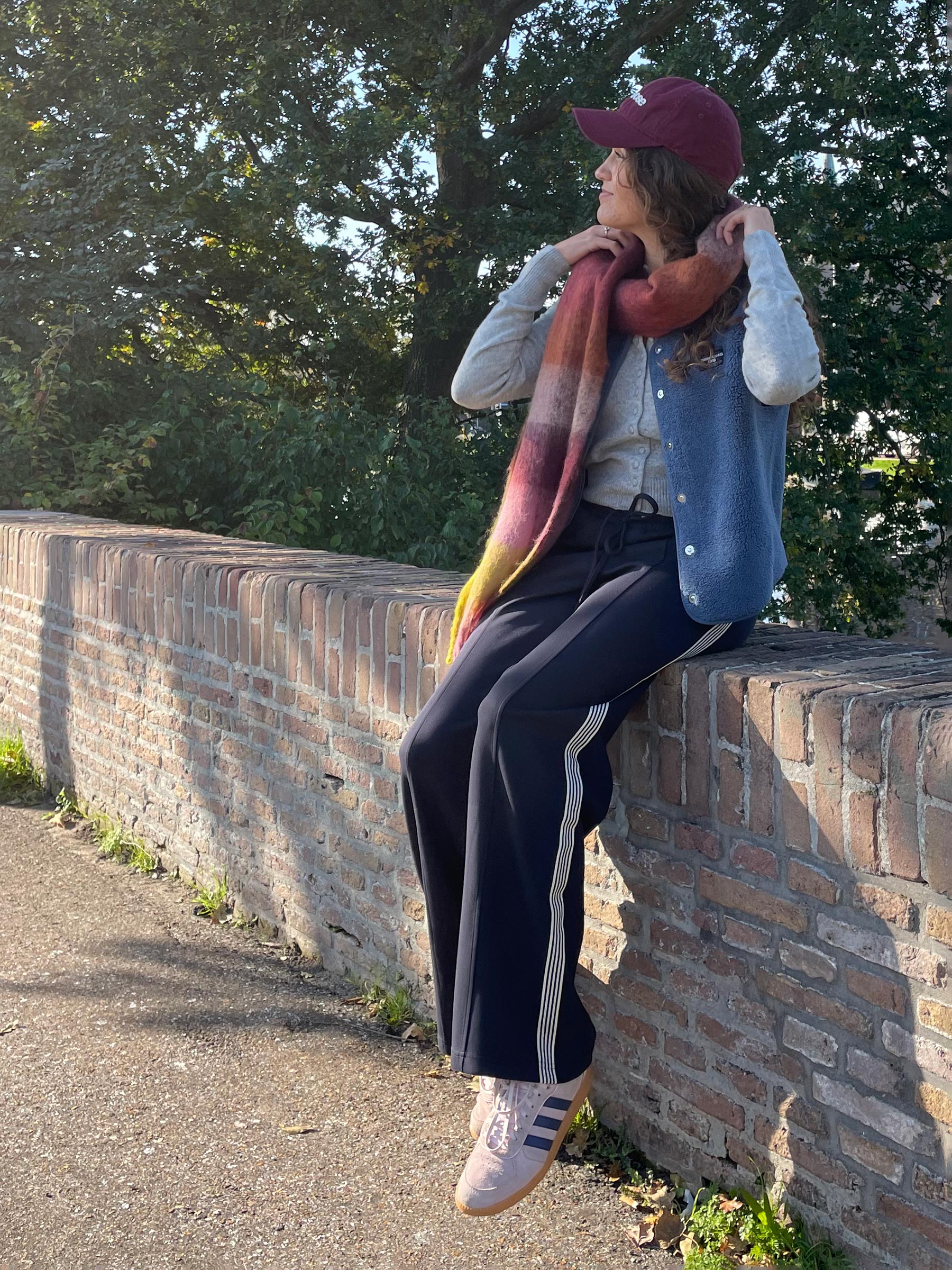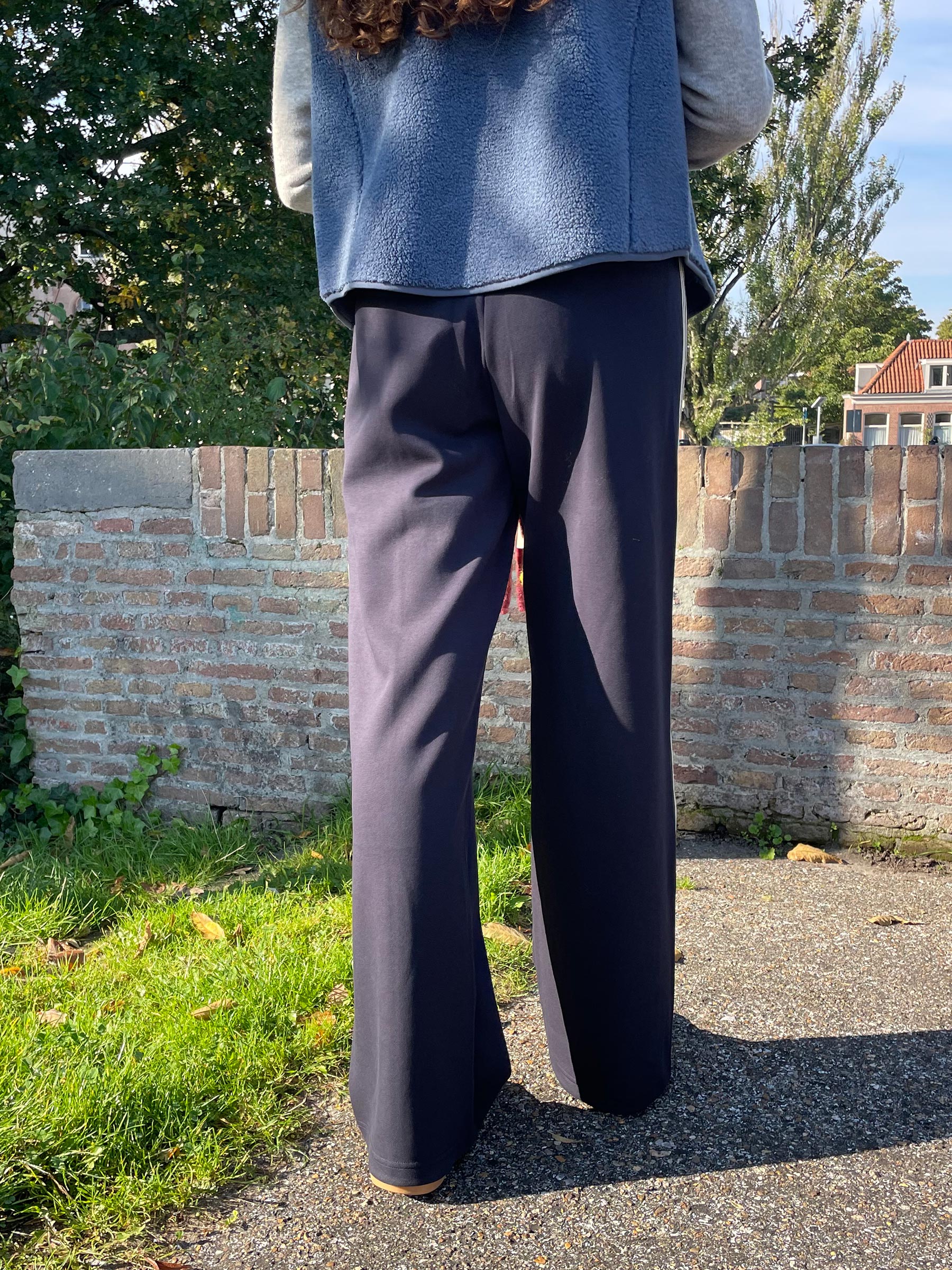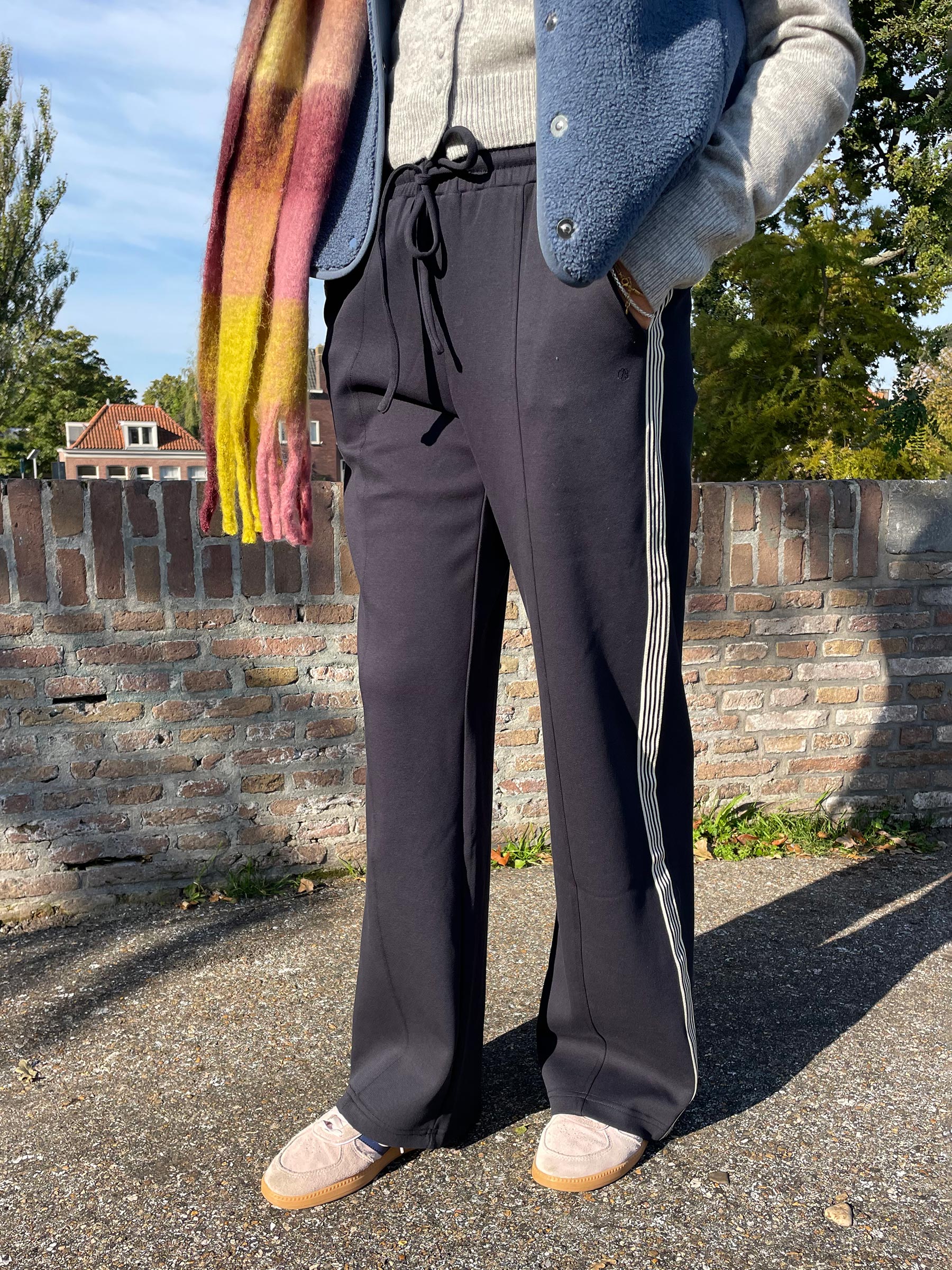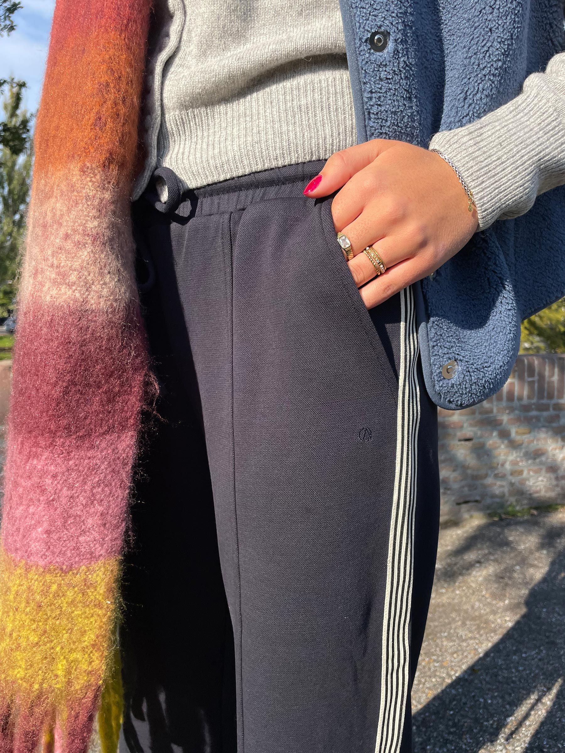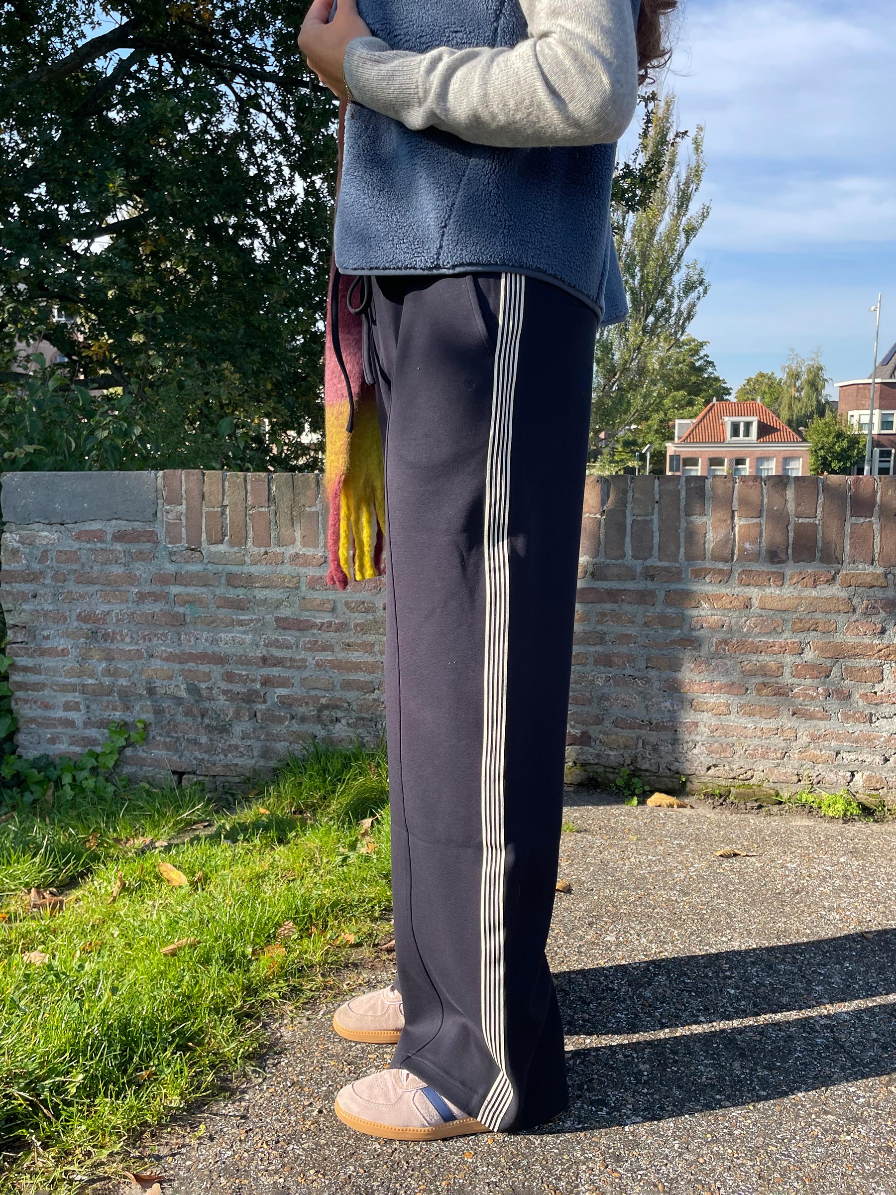 Deze navy broek van Aimee the Label is de perfecte mix van comfort en stijl. De contrasterende strepen langs de zijkant geven hem een frisse en sportieve uitstraling, en de elastische tailleband met strik maakt hem extra relaxed. Combineer casual met sneakers en een T-shirt of met een knit voor comfy chic.