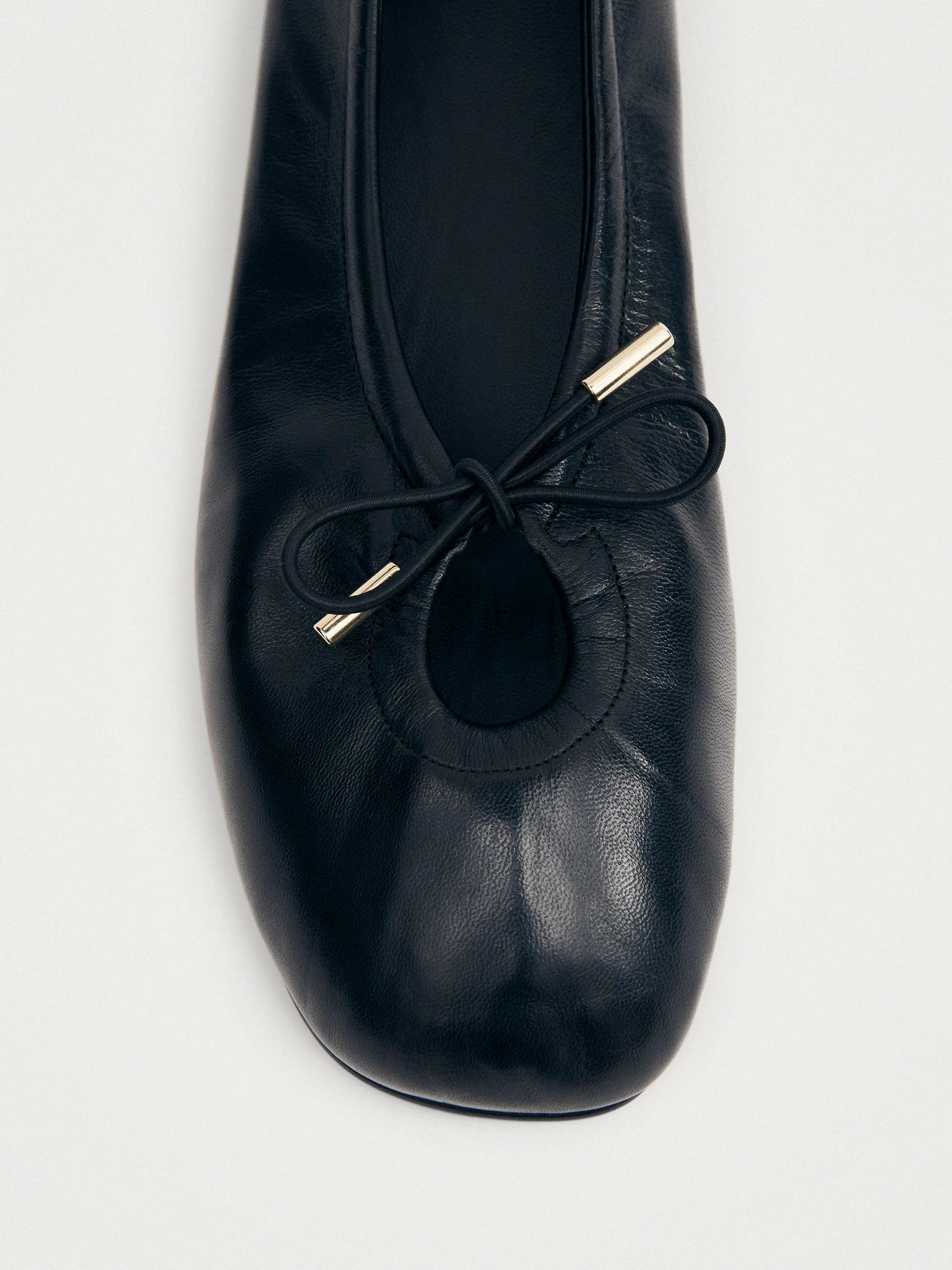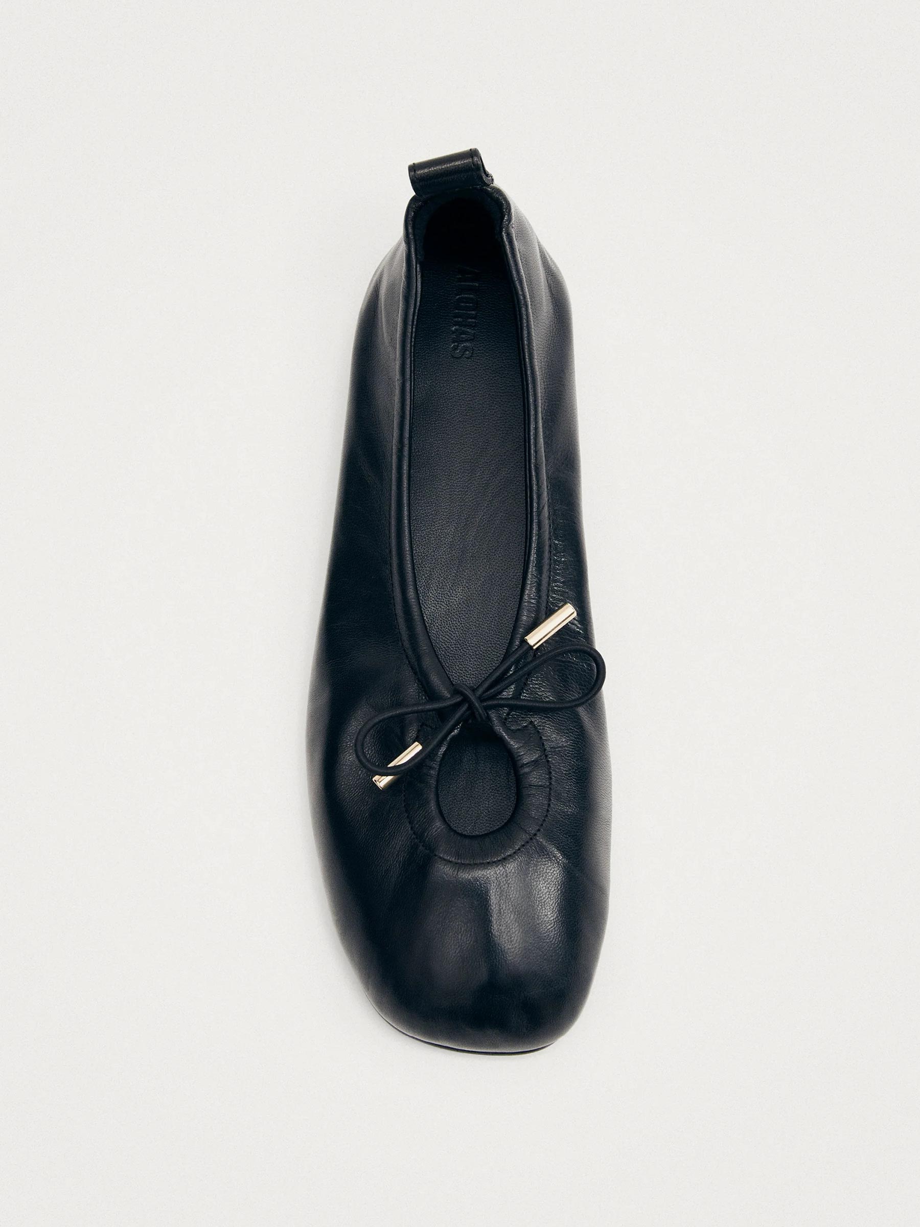 Dit zwarte ballerina-model van Alohas is perfect voor dagen waarop je comfortabel wilt lopen. De ronde opening met strikje en subtiel goudkleurig detail geeft een vrouwelijke touch, terwijl het soepele leer zich mooi vormt naar je voet. Combineer met een rechte jeans of midi-rok voor een moderne, easy look.