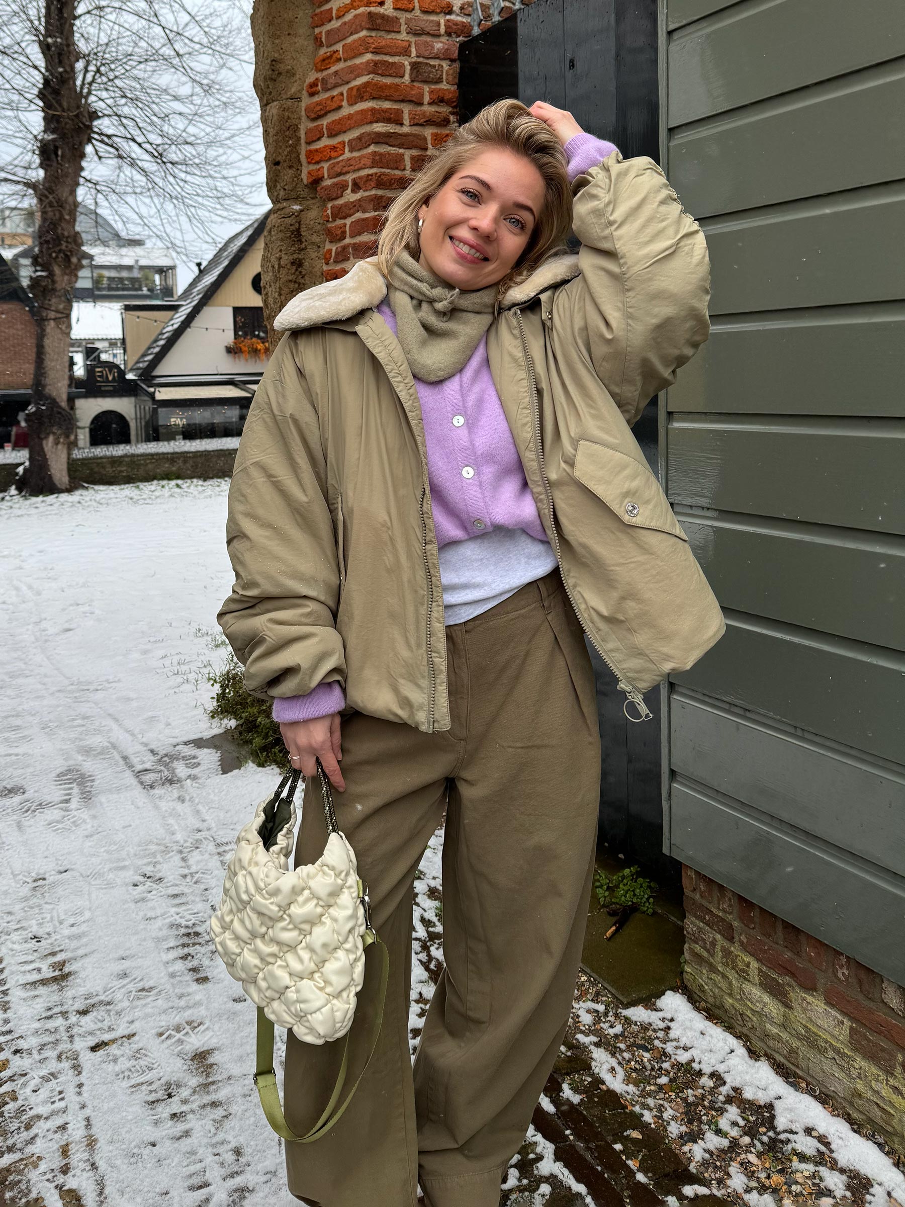 - Het model is 173 cm lang en draagt maat S