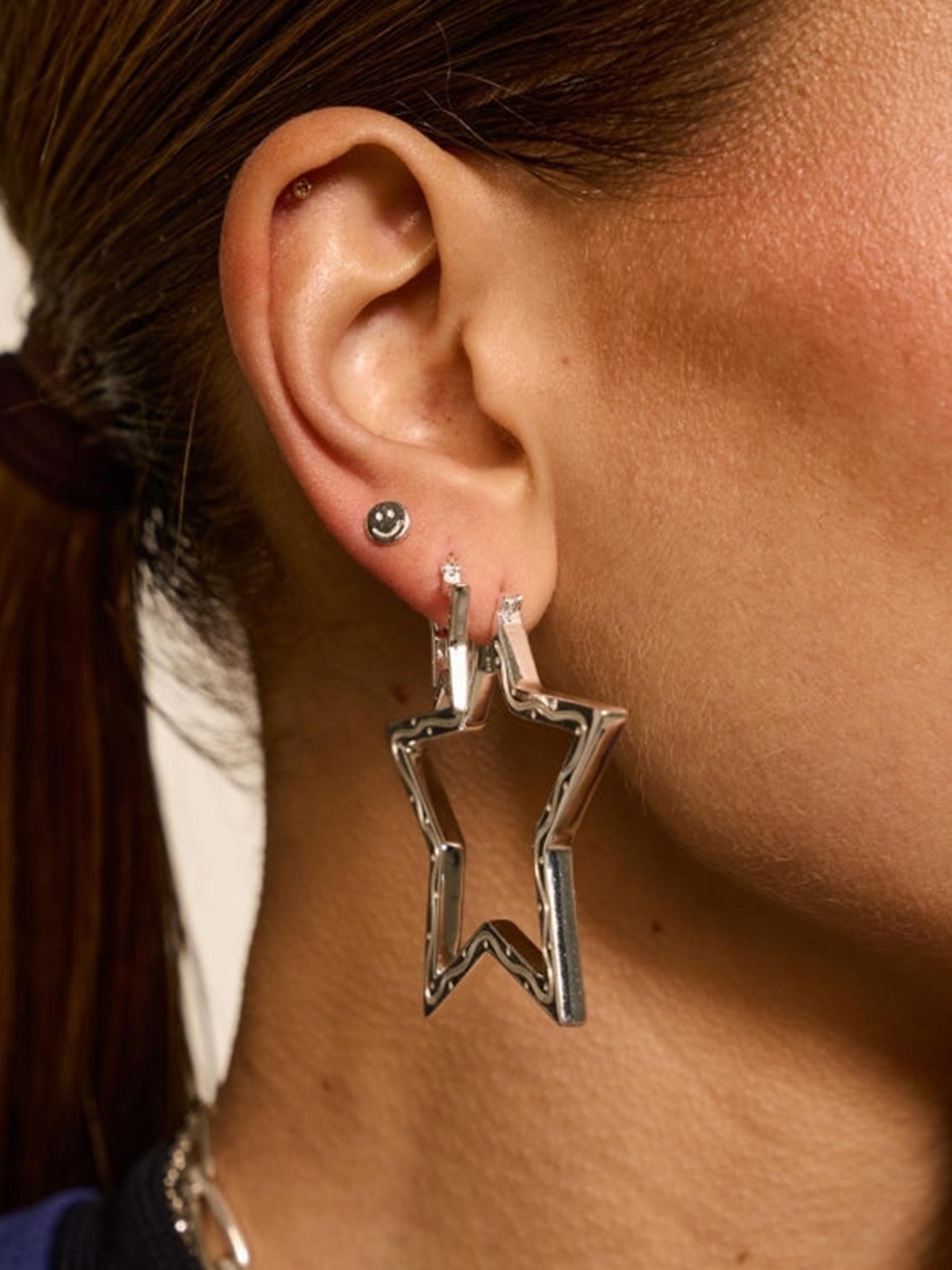 Deze zilveren oorbelletjes van Anna + Nina geven je ear party meteen iets speels. De stervorm met gravure maakt ze net even anders, zonder te druk te worden. Licht, makkelijk te stylen en ideaal voor elke dag, solo of in combinatie met je andere favorieten.