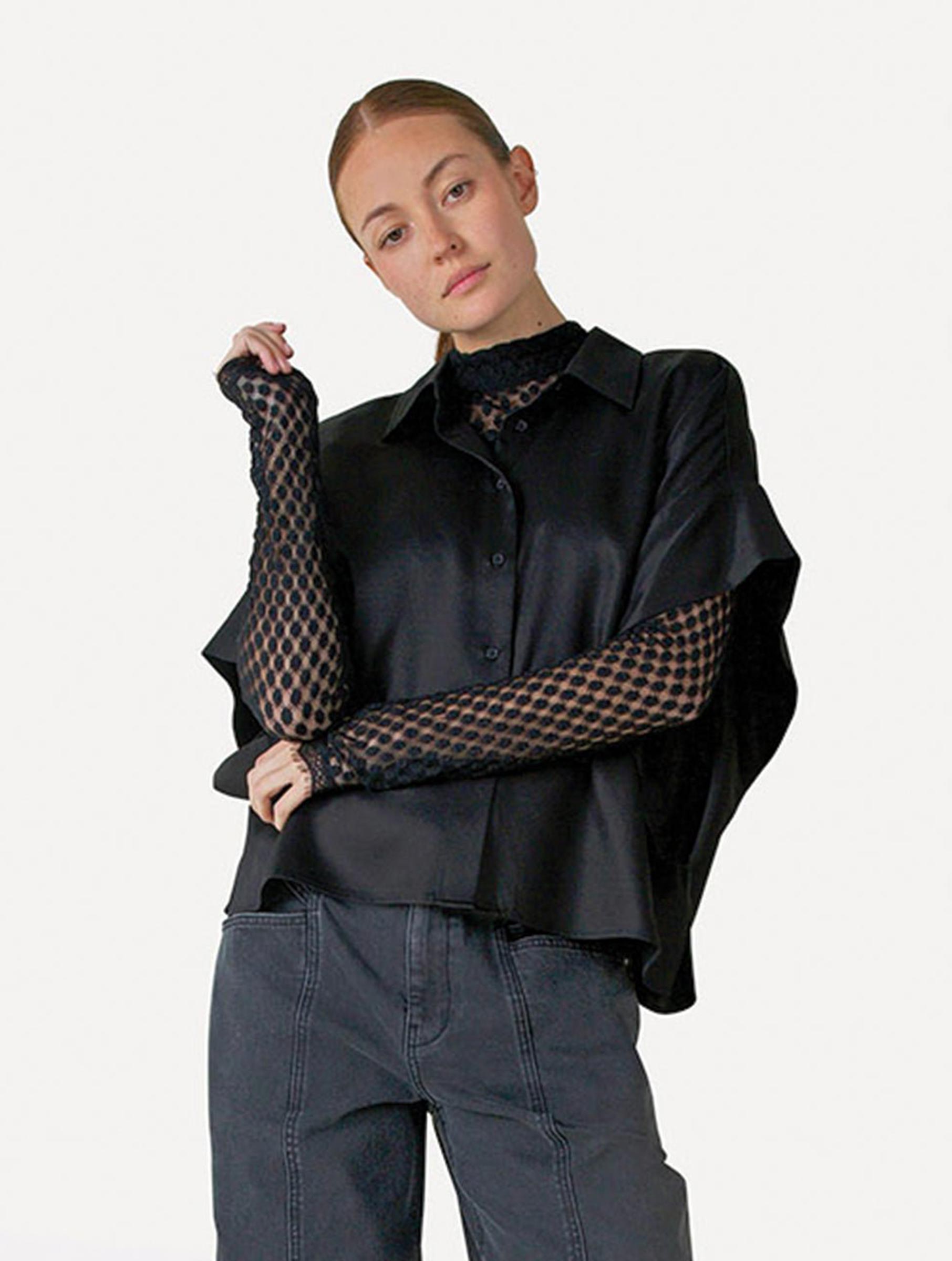 Deze zwarte mesh top van Another Label geeft je outfit direct wat extra’s. De semi-transparante stof en opstaande kraag zorgen voor een verfijnde look met een twist. Draag met een mooie bralette eronder of combineer met een gilet voor een gelaagde stijl die opvalt zonder te overdrijven.