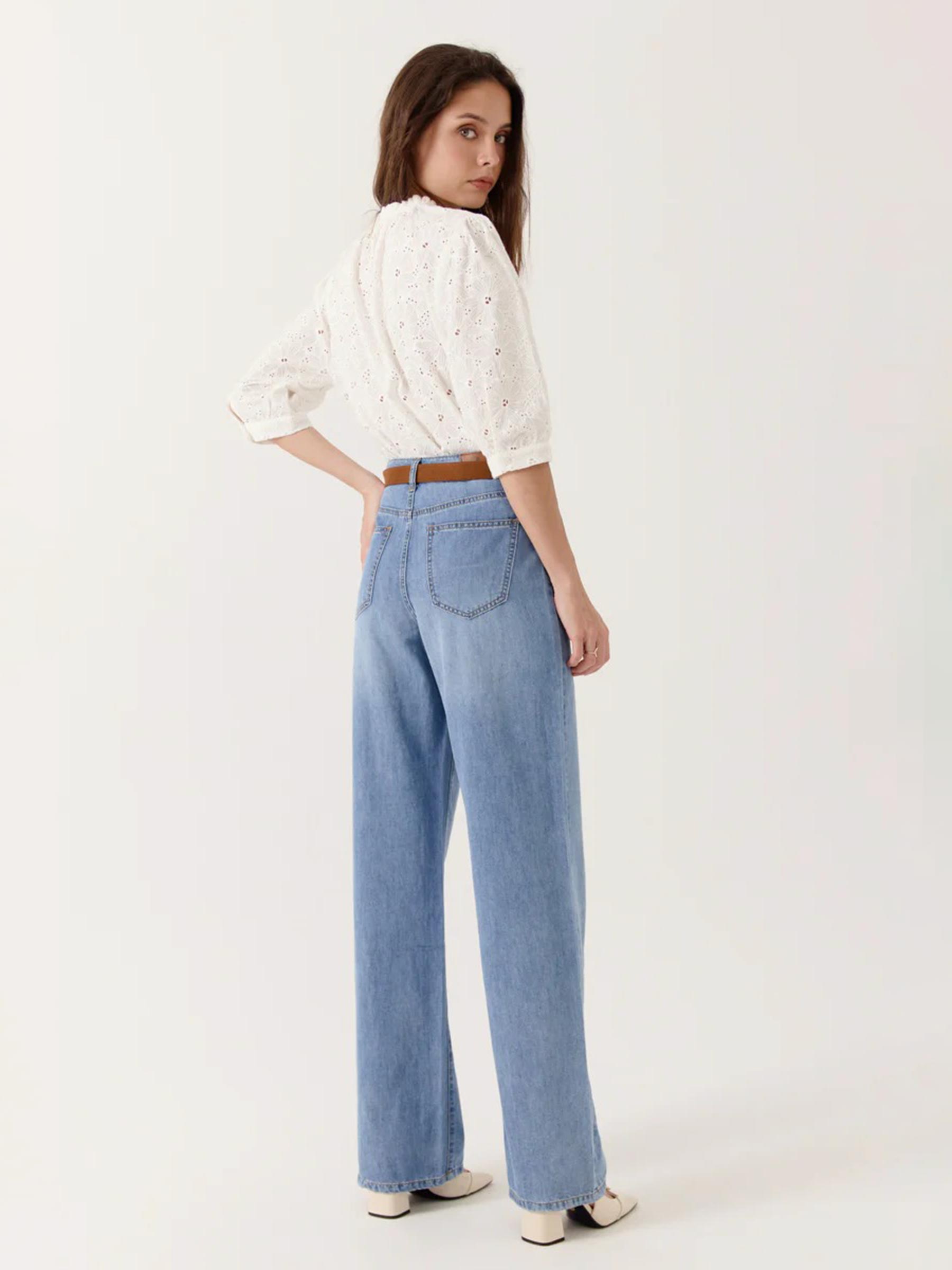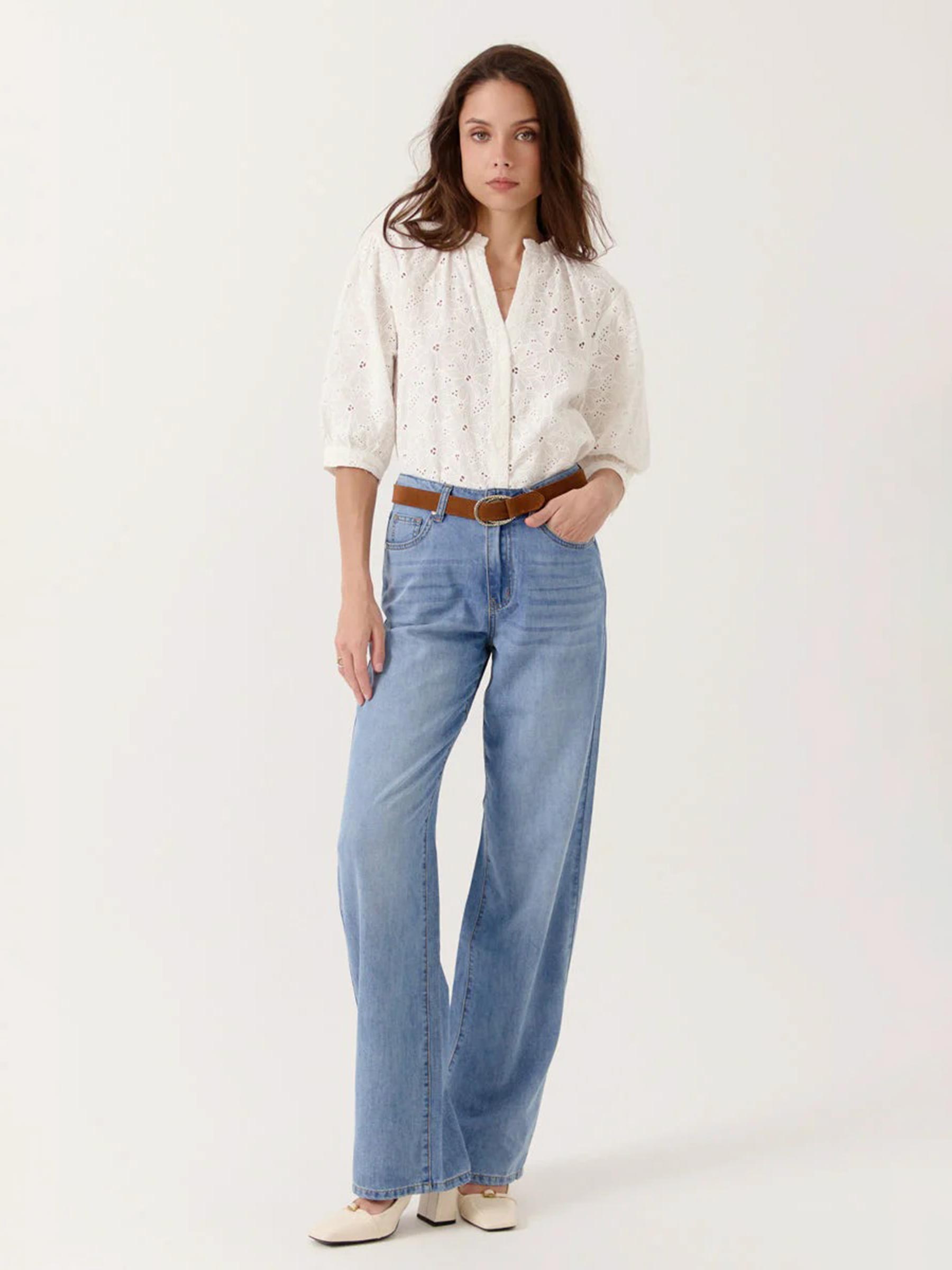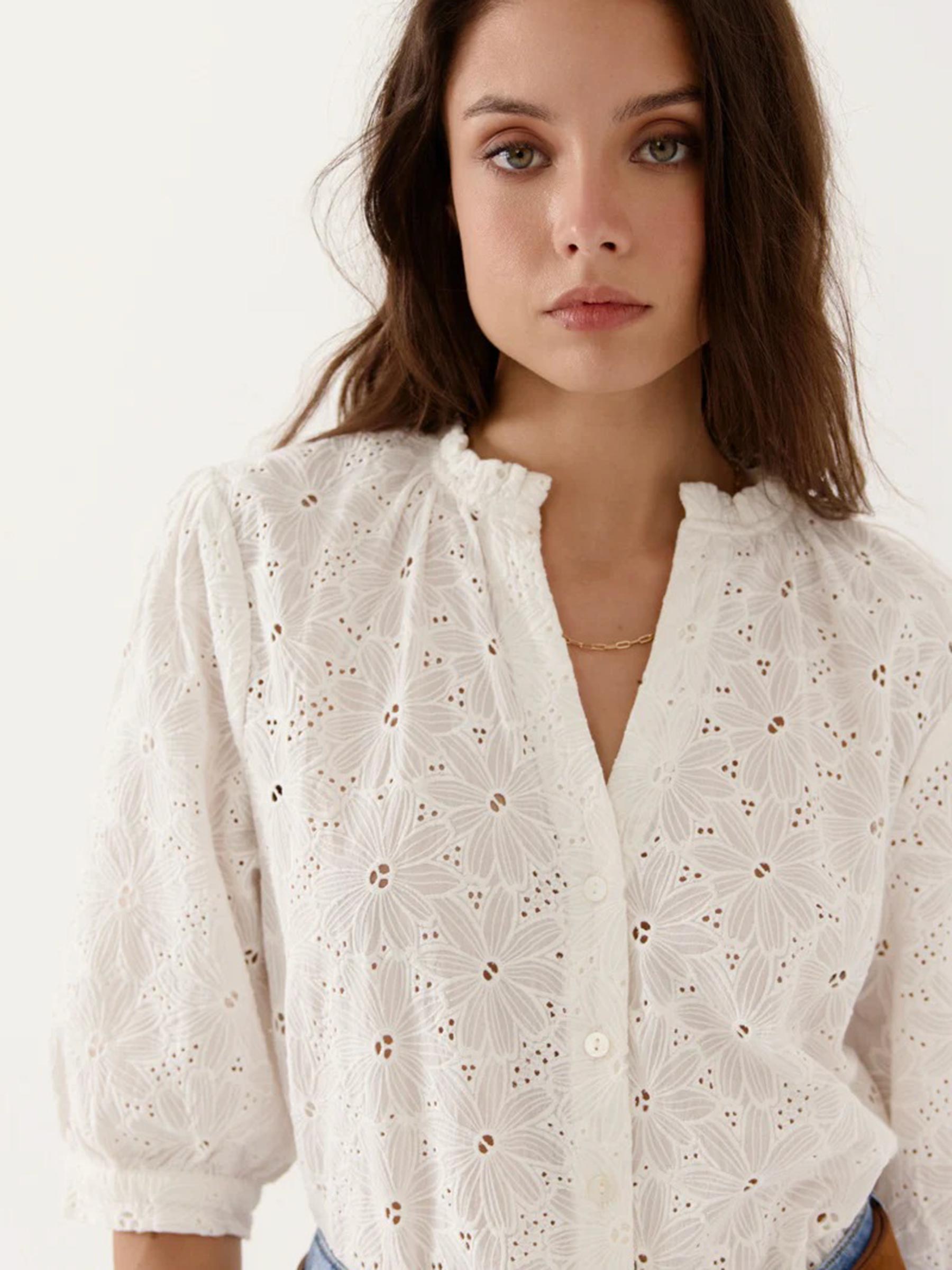 De crème blouse Moelia van Art Love heeft een prachtig opengewerkt bloemenpatroon dat hem meteen onderscheidt van een gewone witte blouse. Die luchtige broderie voelt zo fijn op de huid, perfect voor wanneer het kwik stijgt. Art Love is een Parijs label dat bekendstaat om vrouwelijke details en speelse stoffen.