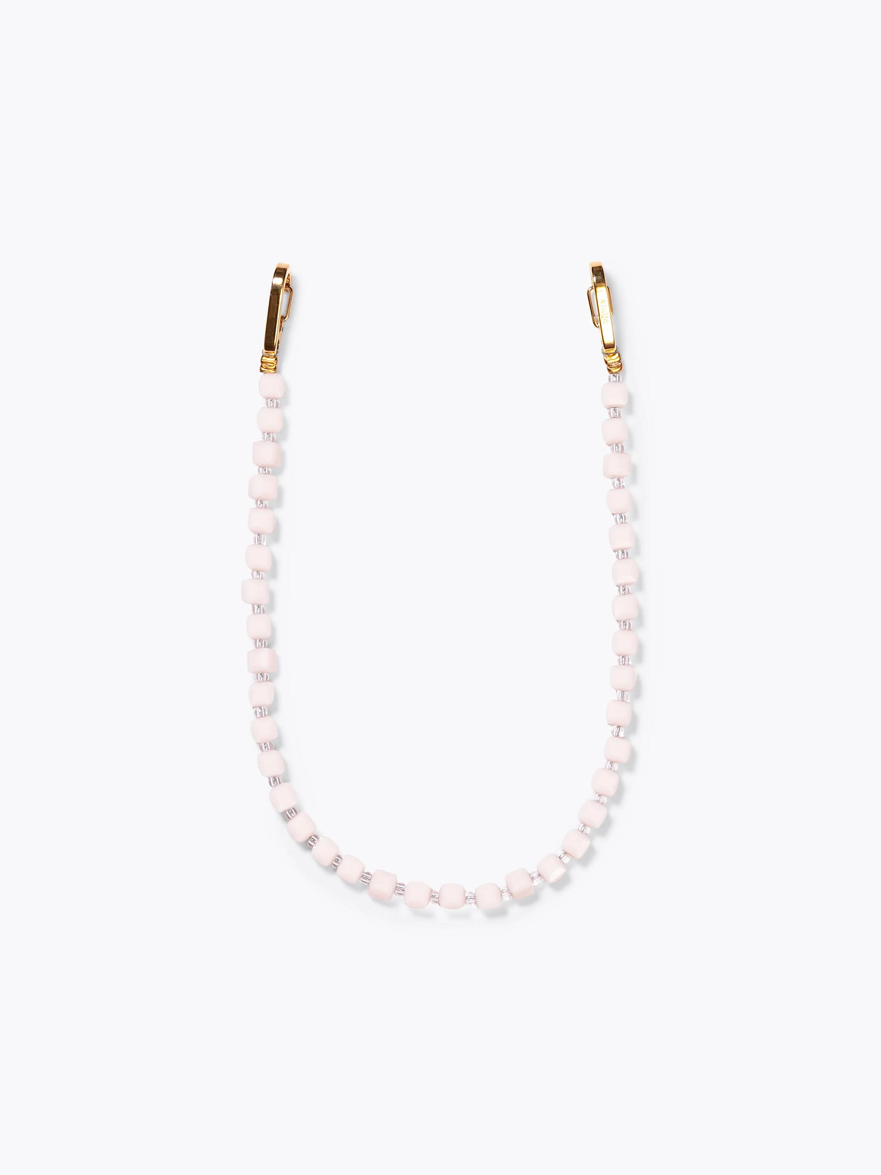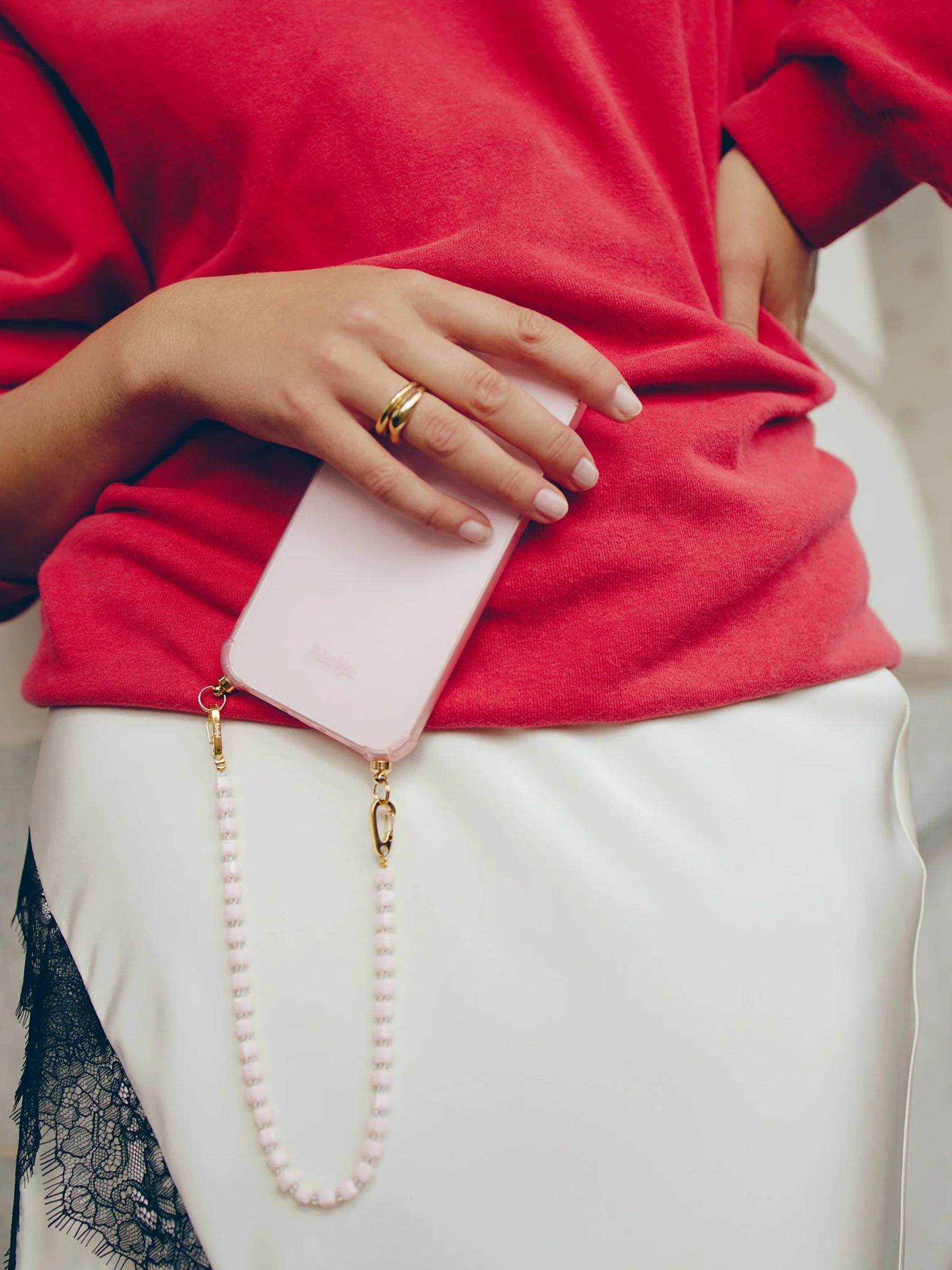 Dit lichtroze telefoonkoord van Ateljé is een speelse en stijlvolle manier om je telefoon altijd bij de hand te hebben. De zachte roze kralen geven een frisse, vrolijke look en maken elke outfit net wat leuker. Perfect om solo te dragen of te mixen met een bijpassende case van het merk.