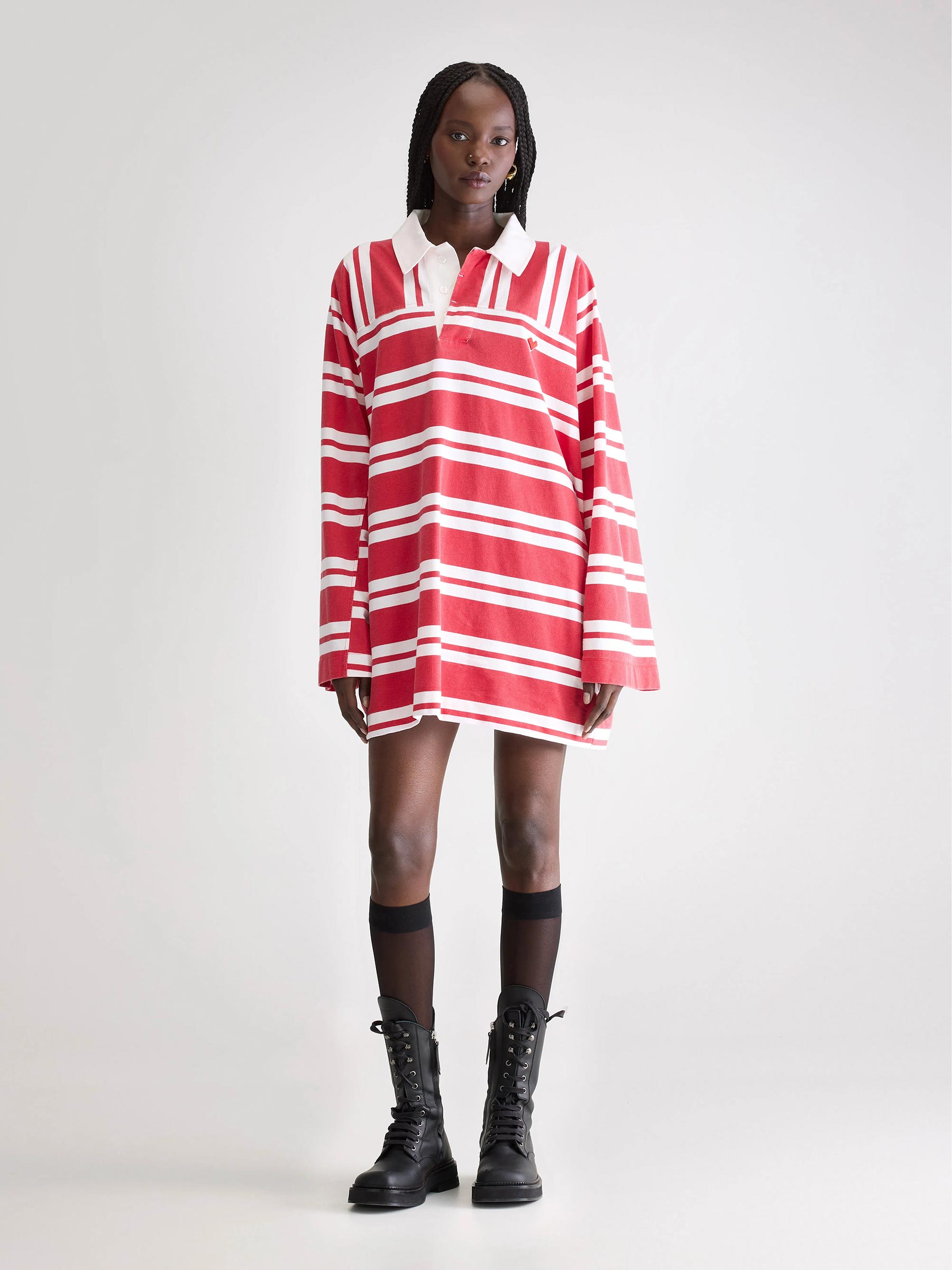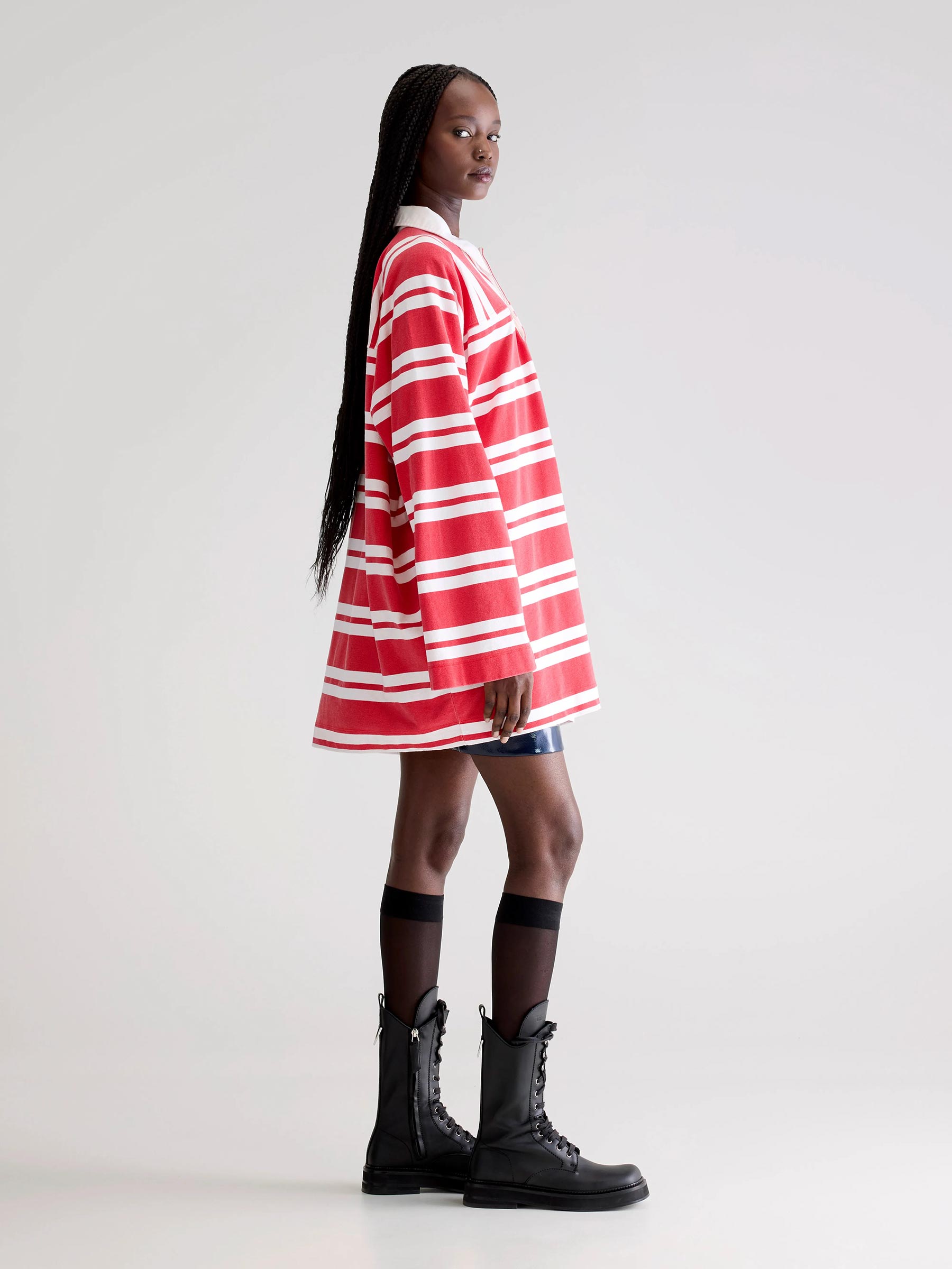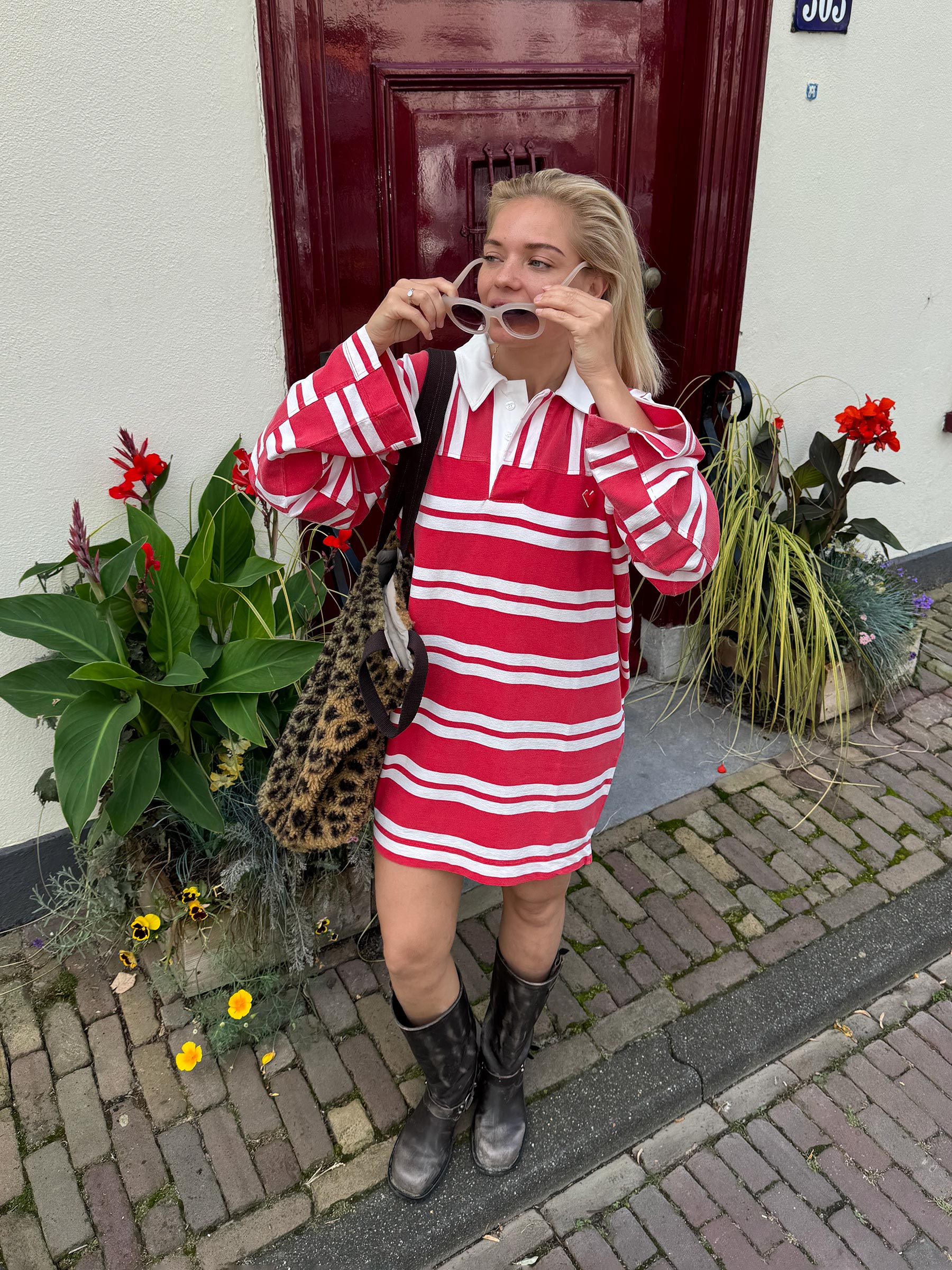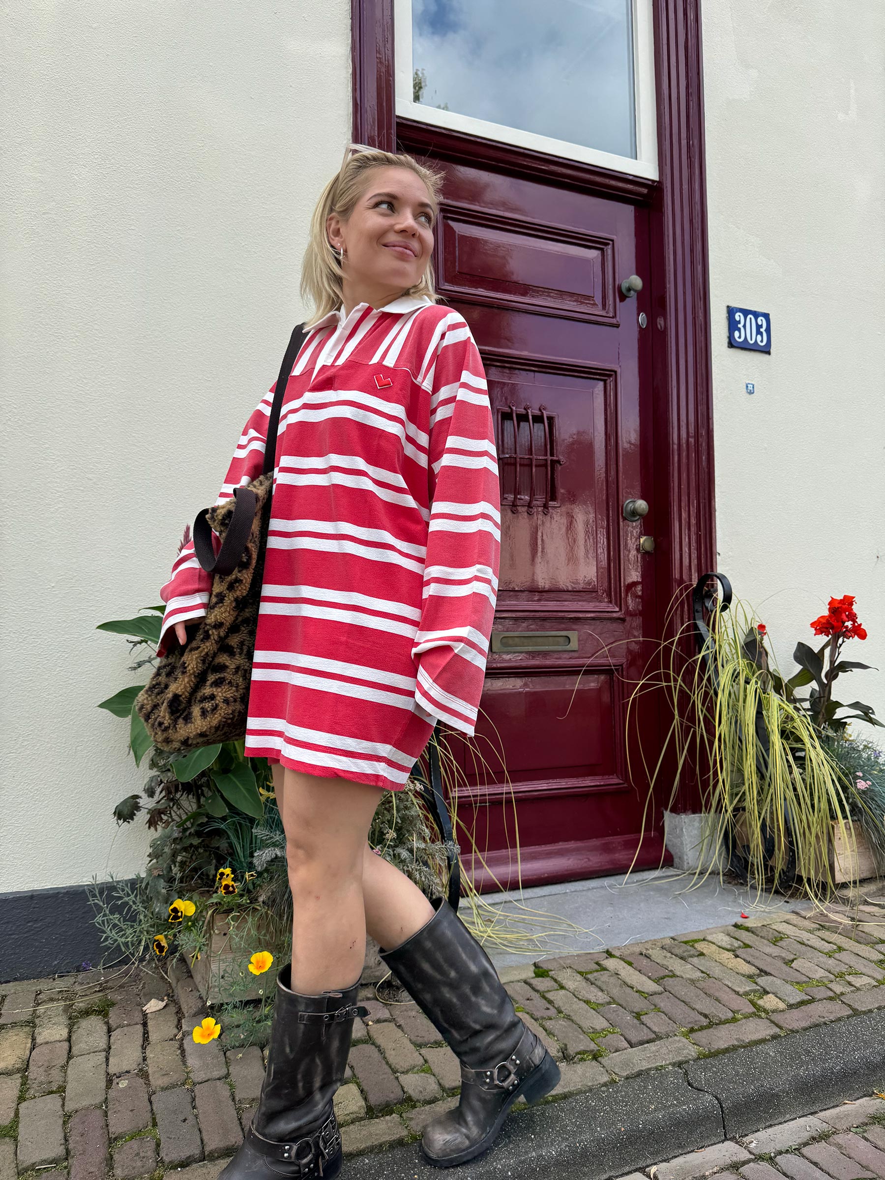 Deze polo dress met rood witte strepen is zo’n item dat perfect is voor het tussenseizoen. Jurk aan en je ziet er meteen top uit. Leuk met chunky boots eronder.