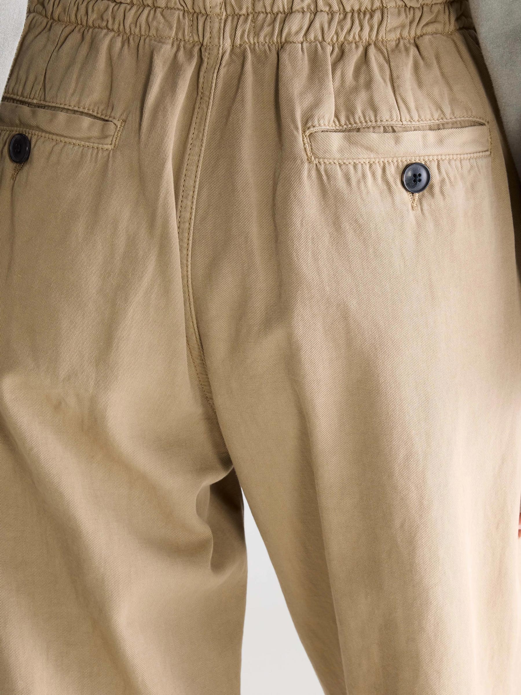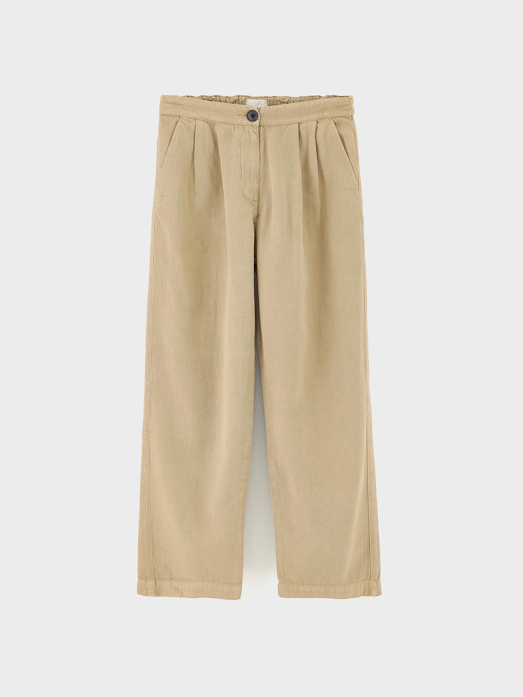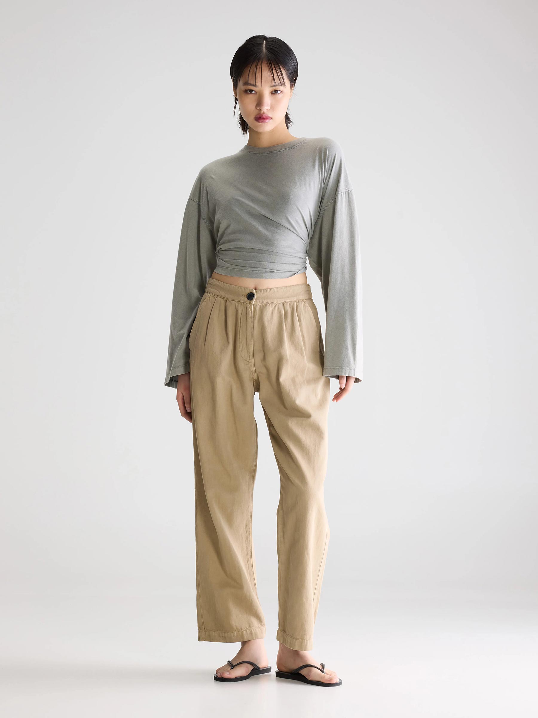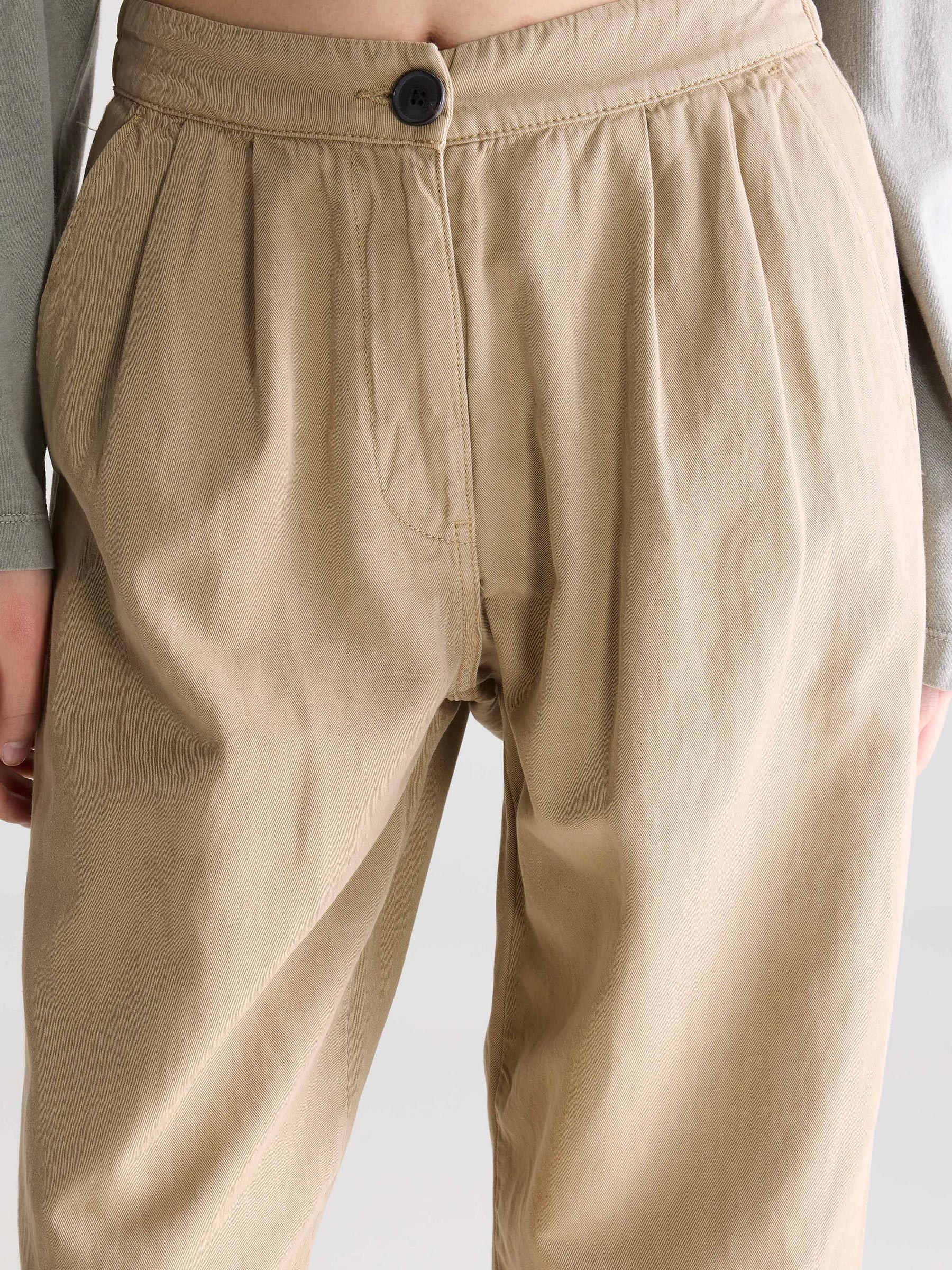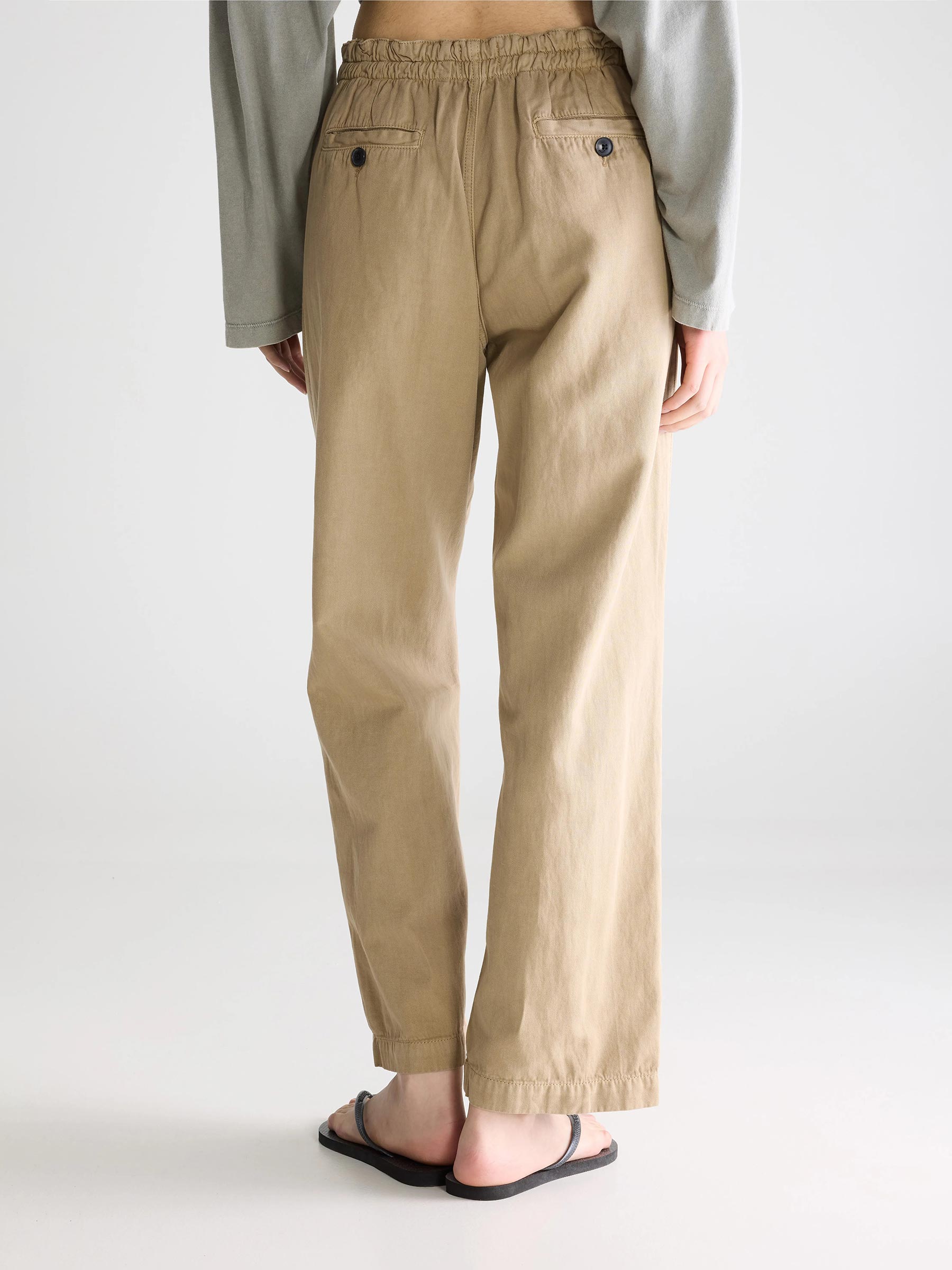 De lichtbruine Pillow broek van Bellerose is precies zo'n broek die je de hele dag draagt zonder erover na te denken. Katoen en linnen popeline, rechte pijpen en een half elastische taille, nonchalant maar nooit slordig. Bellerose is een Belgisch merk dat al decennia kleding maakt die er beter uitziet naarmate je hem vaker draagt.