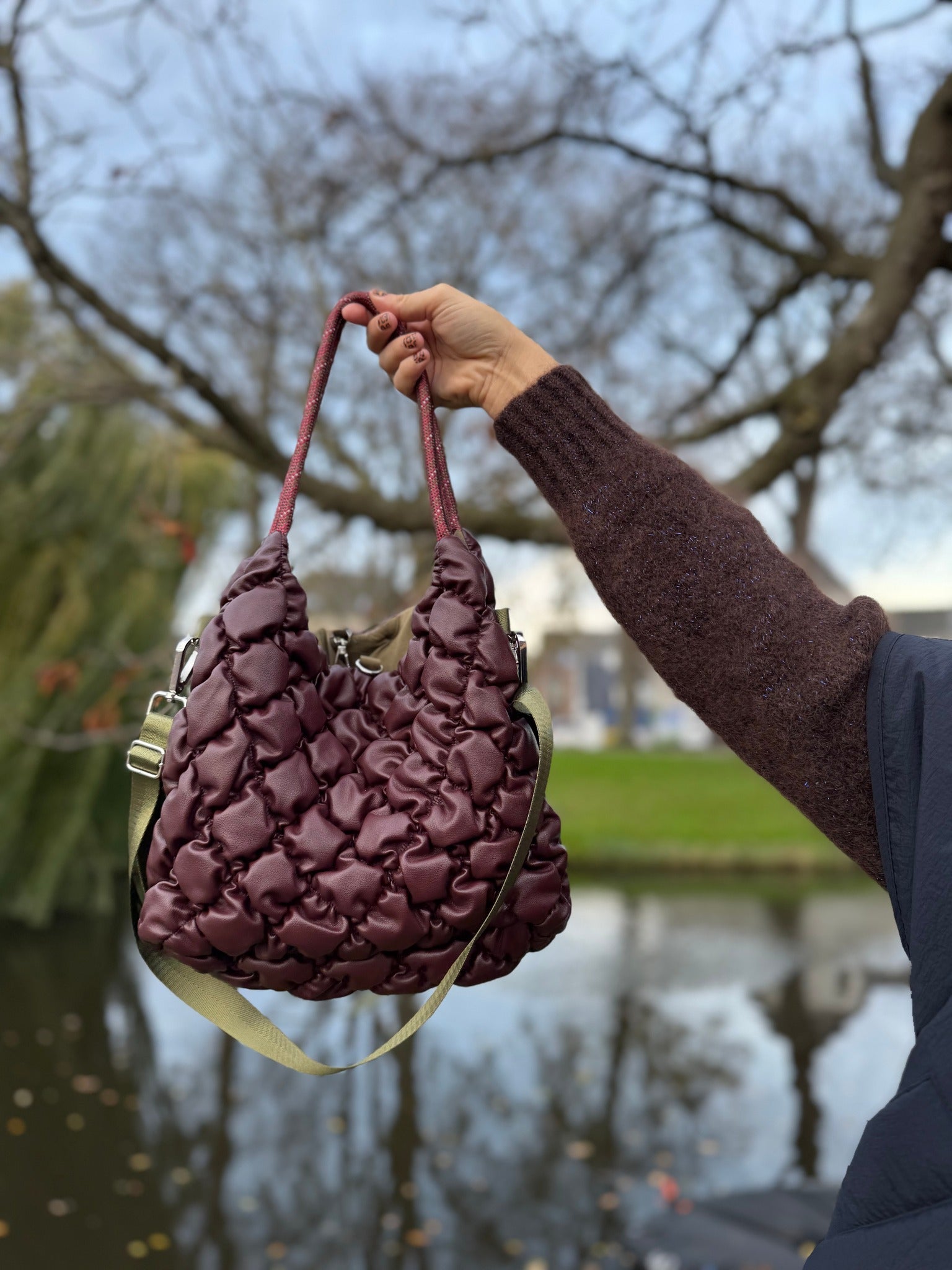 Deze gewatteerde tas van Bellerose in diepe wijnrode tint is een echte eye-catcher. Het doorgestikte oppervlak en het glanzende hengsel geven 'm een speelse, moderne twist.