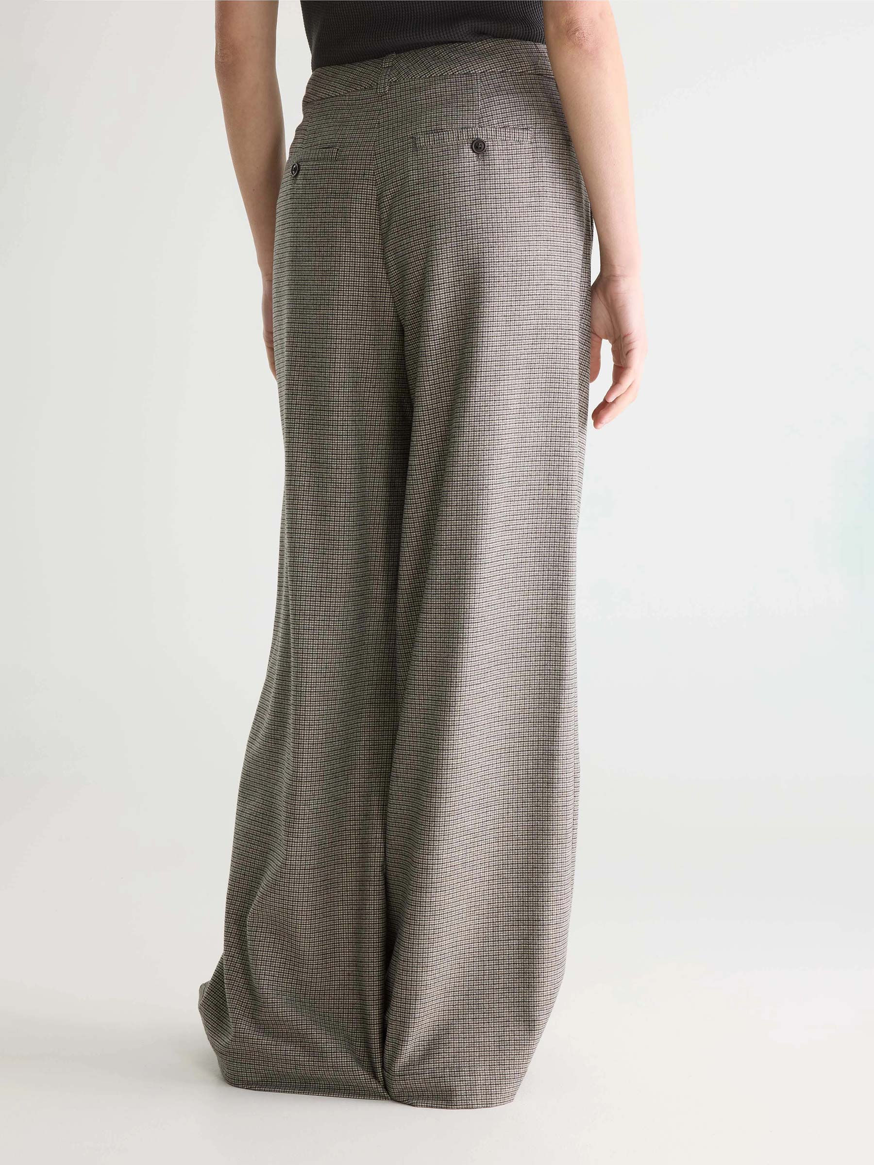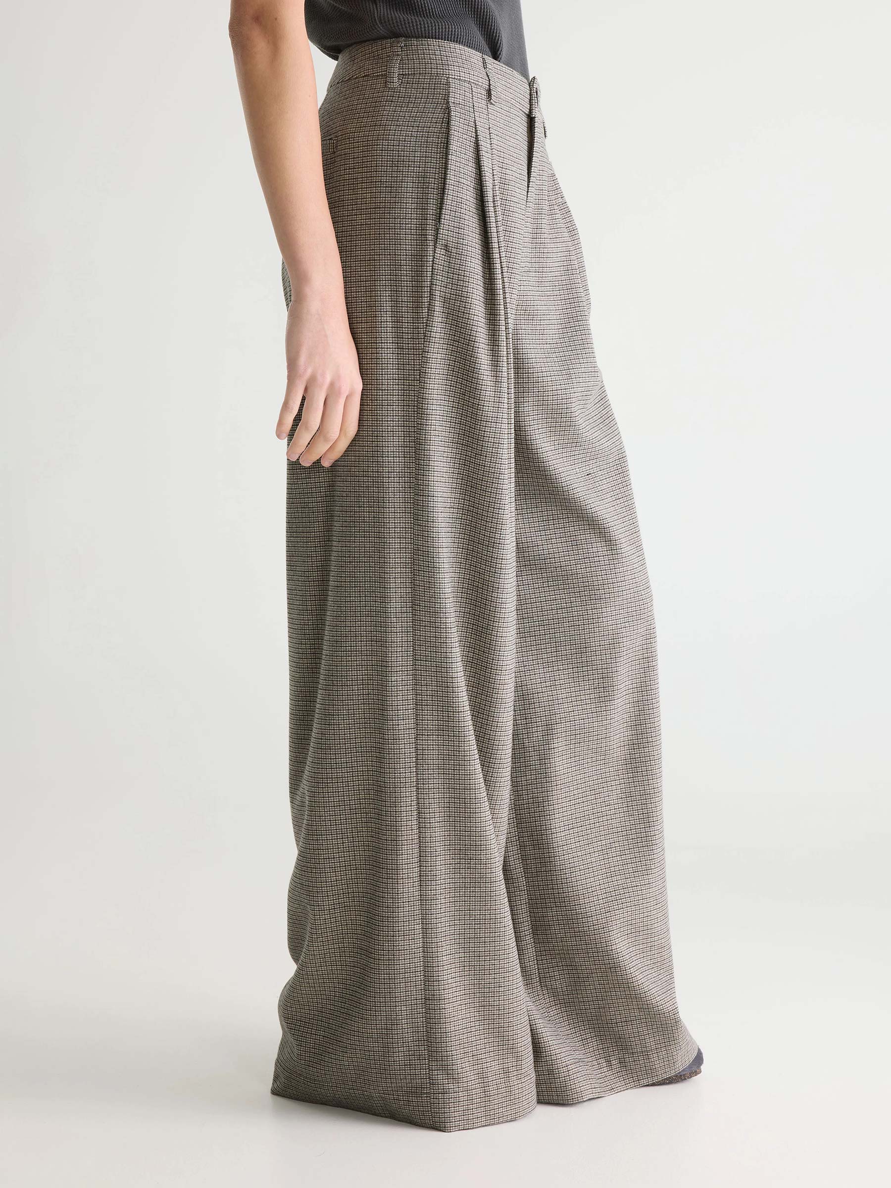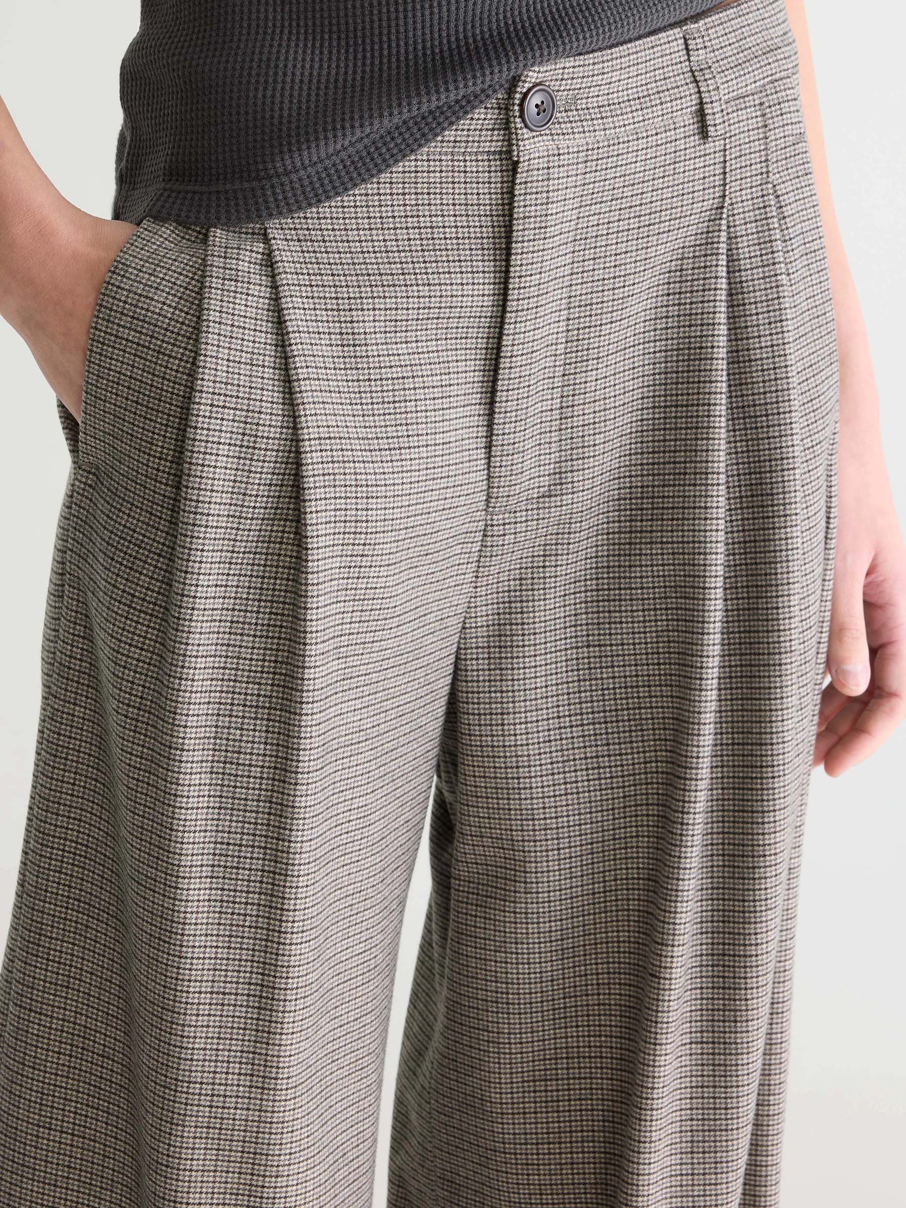 Deze bruin geruite pantalon van Bellerose is een broek die moeiteloos schakelt tussen netjes en nonchalant. De wijde pijpen en plooien geven een verzorgde uitstraling voor naar je werk, maar met een sweater of T-shirt krijgt hij een stoere draai. Echt zo’n item dat je steeds opnieuw uit de kast pakt.
