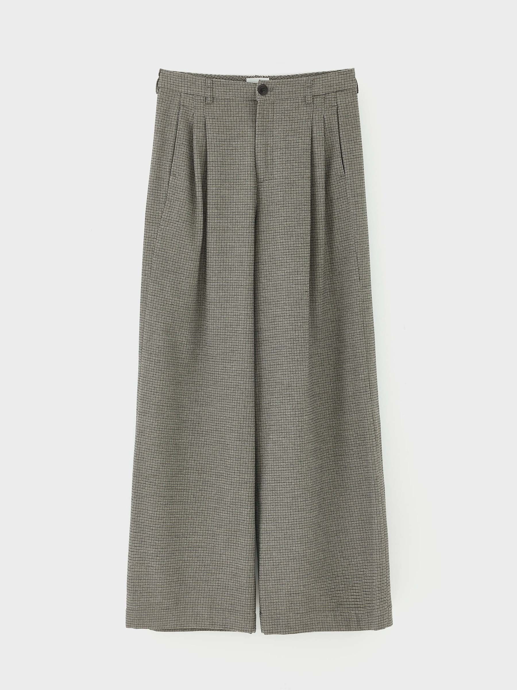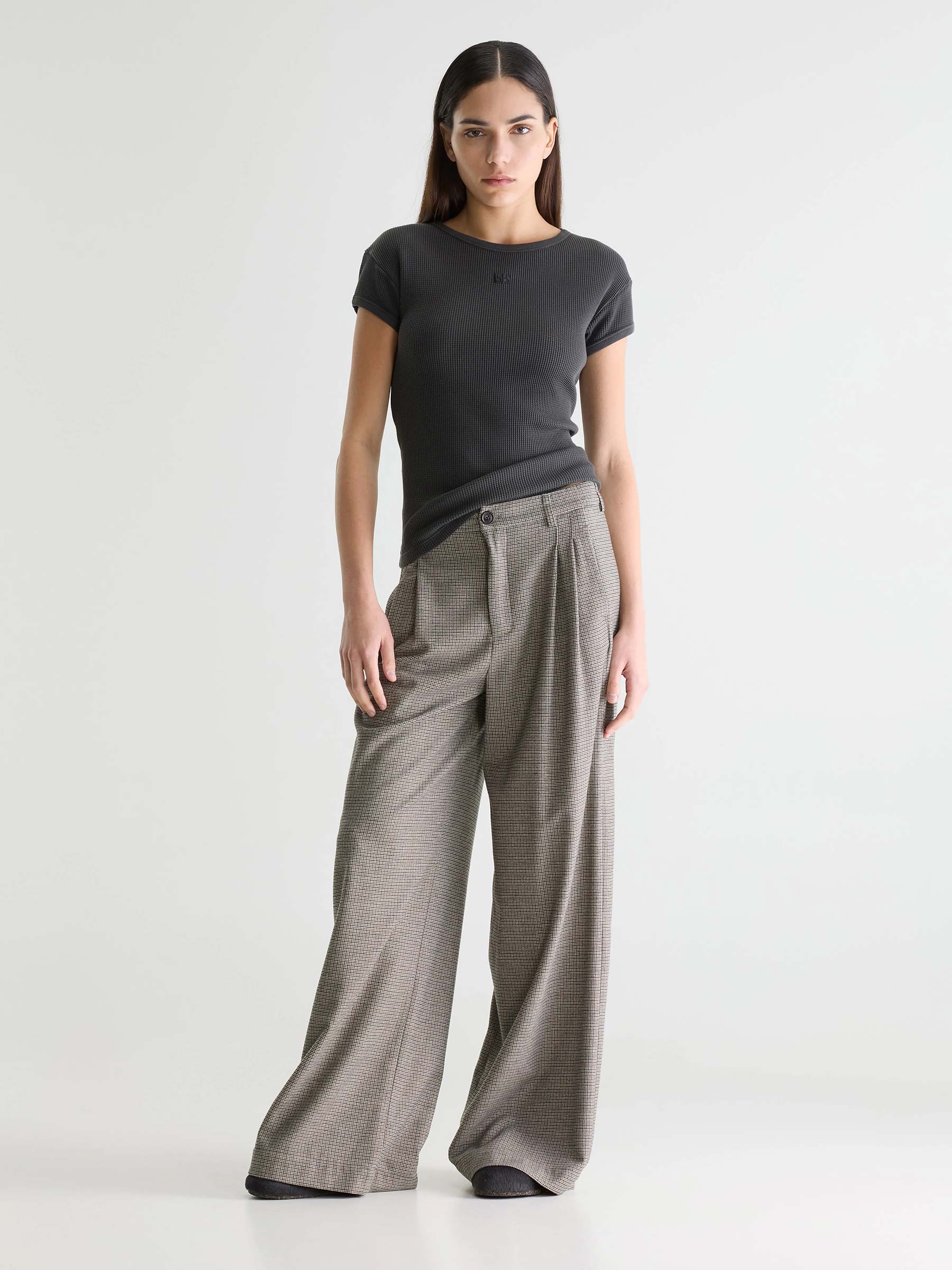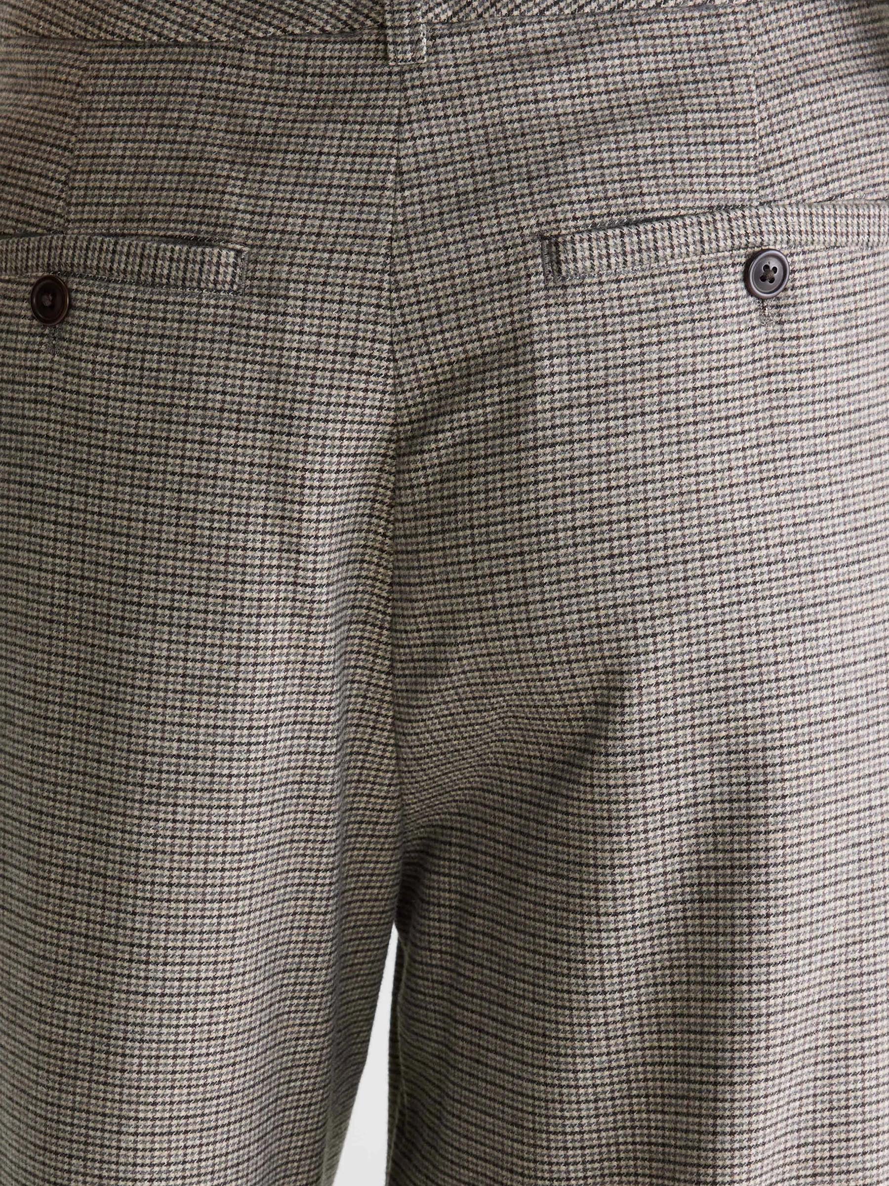 Deze bruin geruite pantalon van Bellerose is een broek die moeiteloos schakelt tussen netjes en nonchalant. De wijde pijpen en plooien geven een verzorgde uitstraling voor naar je werk, maar met een sweater of T-shirt krijgt hij een stoere draai. Echt zo’n item dat je steeds opnieuw uit de kast pakt.