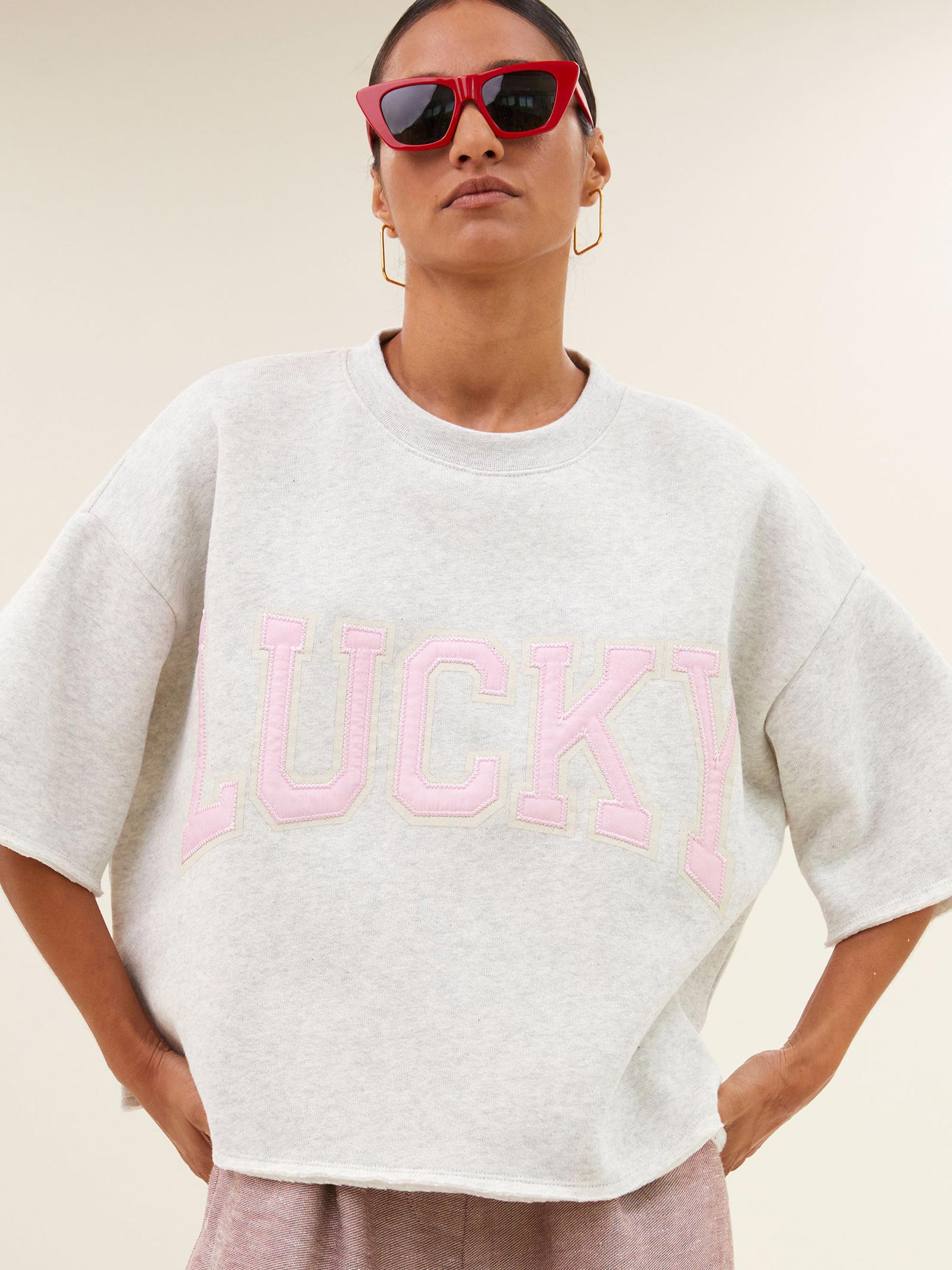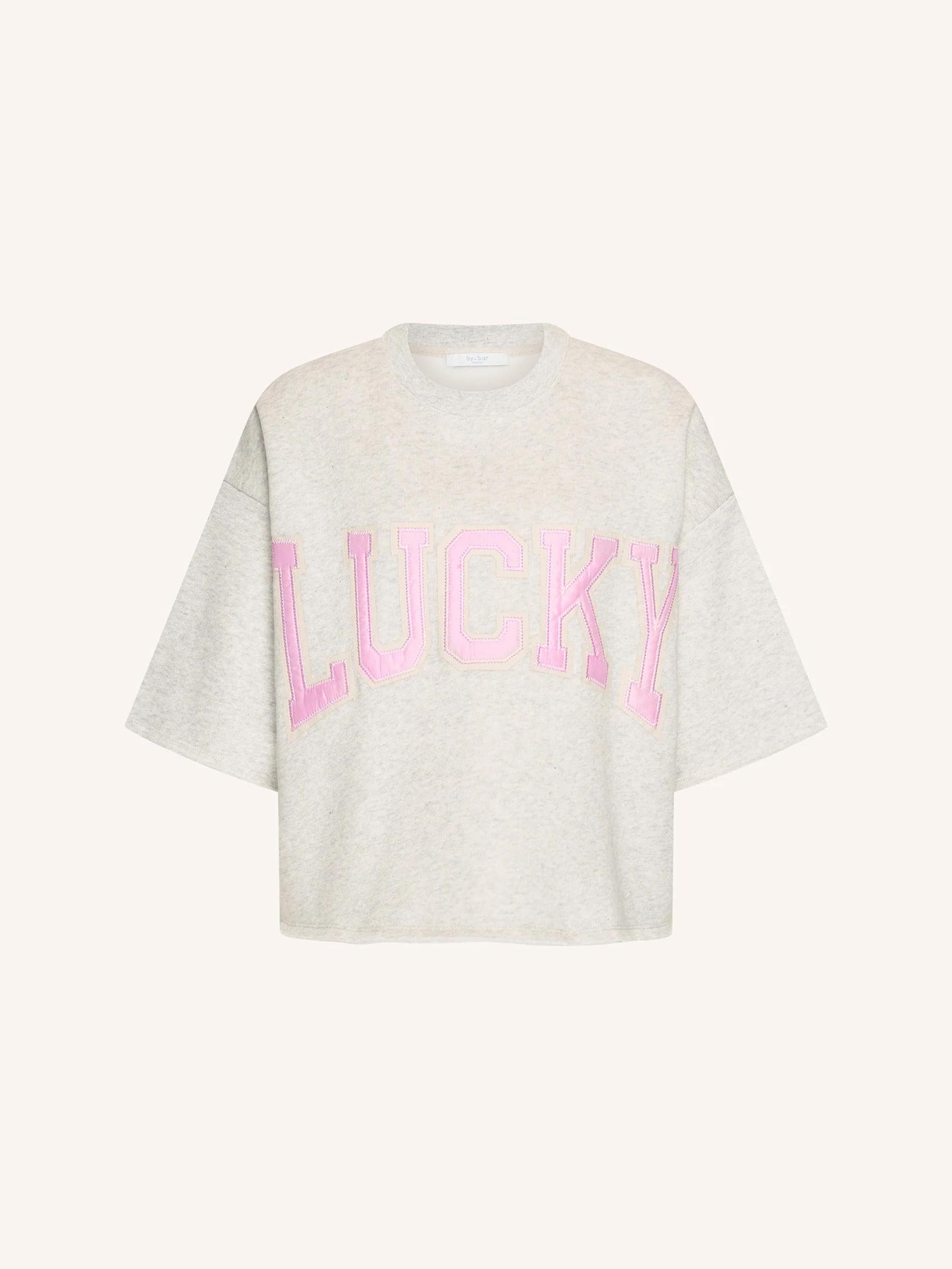 Deze lichtgrijze top van By-bar Amsterdam is perfect voor een relaxte look met een frisse touch. De losse fit, zachte stof en halflange mouwen maken deze top heerlijk om te dragen, terwijl de grote LUCKY-opdruk meteen een vrolijke uitstraling geeft. Combineer met een wide leg broek of jeans voor een makkelijke everyday outfit.