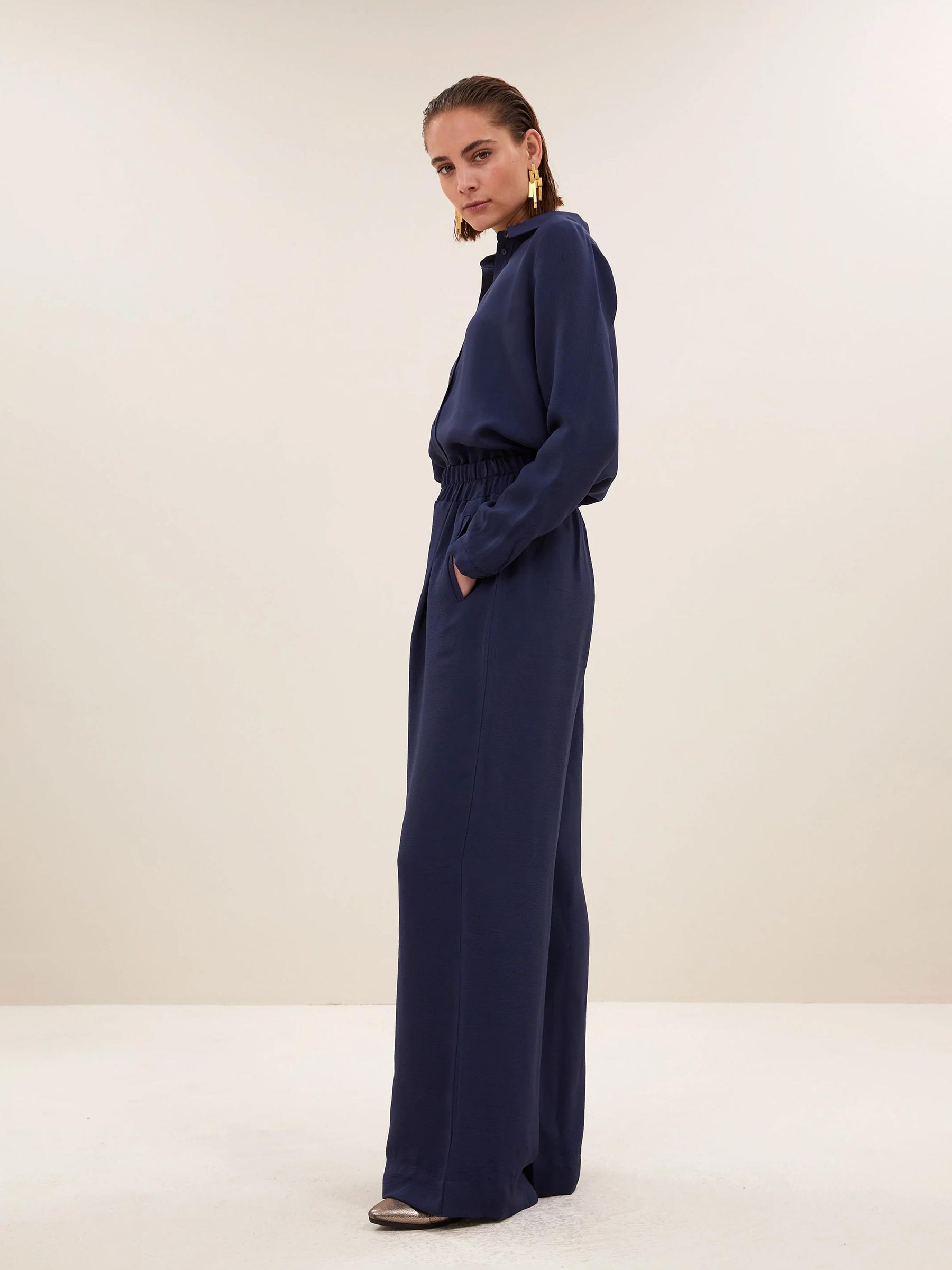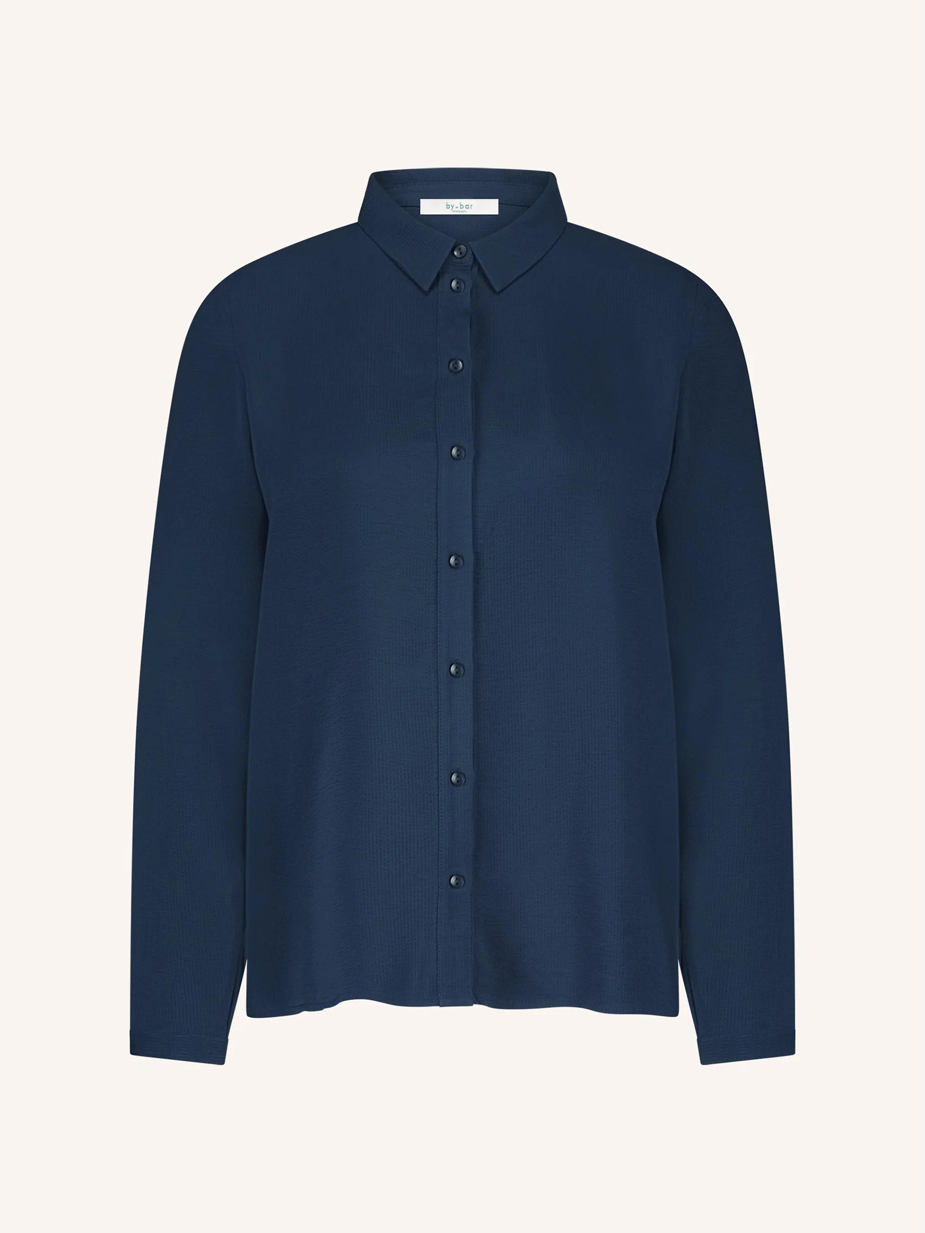 Deze donkerblauwe blouse van by-bar is een echte allrounder. De zachte satijnen stof en subtiele structuur geven de blouse een fijne, chique uitstraling. Draag hem overdag naar werk of 's avonds naar een feestje met de bijpassende pantalon.