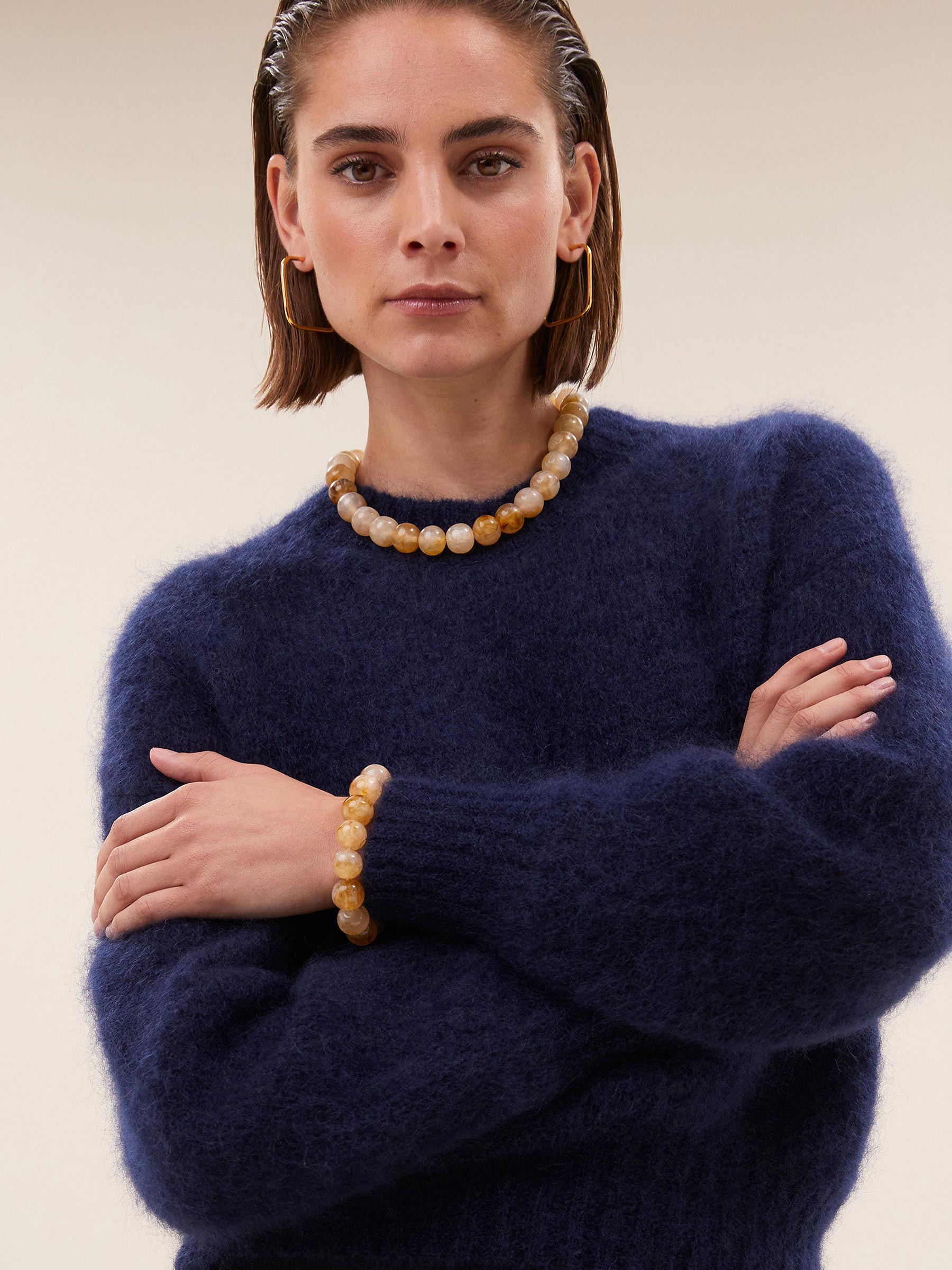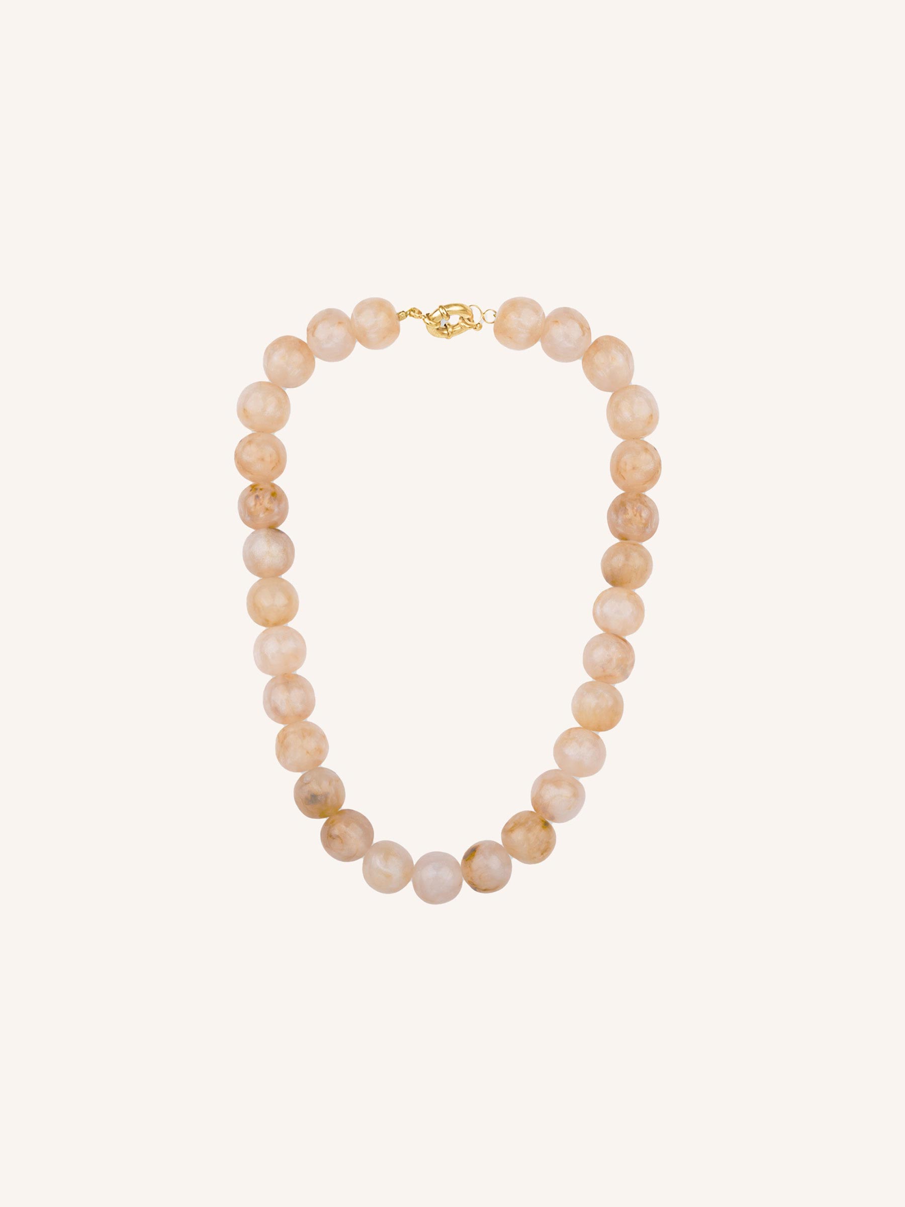 Deze lichtbruine ketting van by-bar is een stijlvol statement met zijn ronde kralen en subtiele glans. De gouden sluiting voegt een verfijnde touch toe, waardoor dit sieraad zowel casual als chic te dragen is. Perfect om je outfit net dat beetje extra te geven.