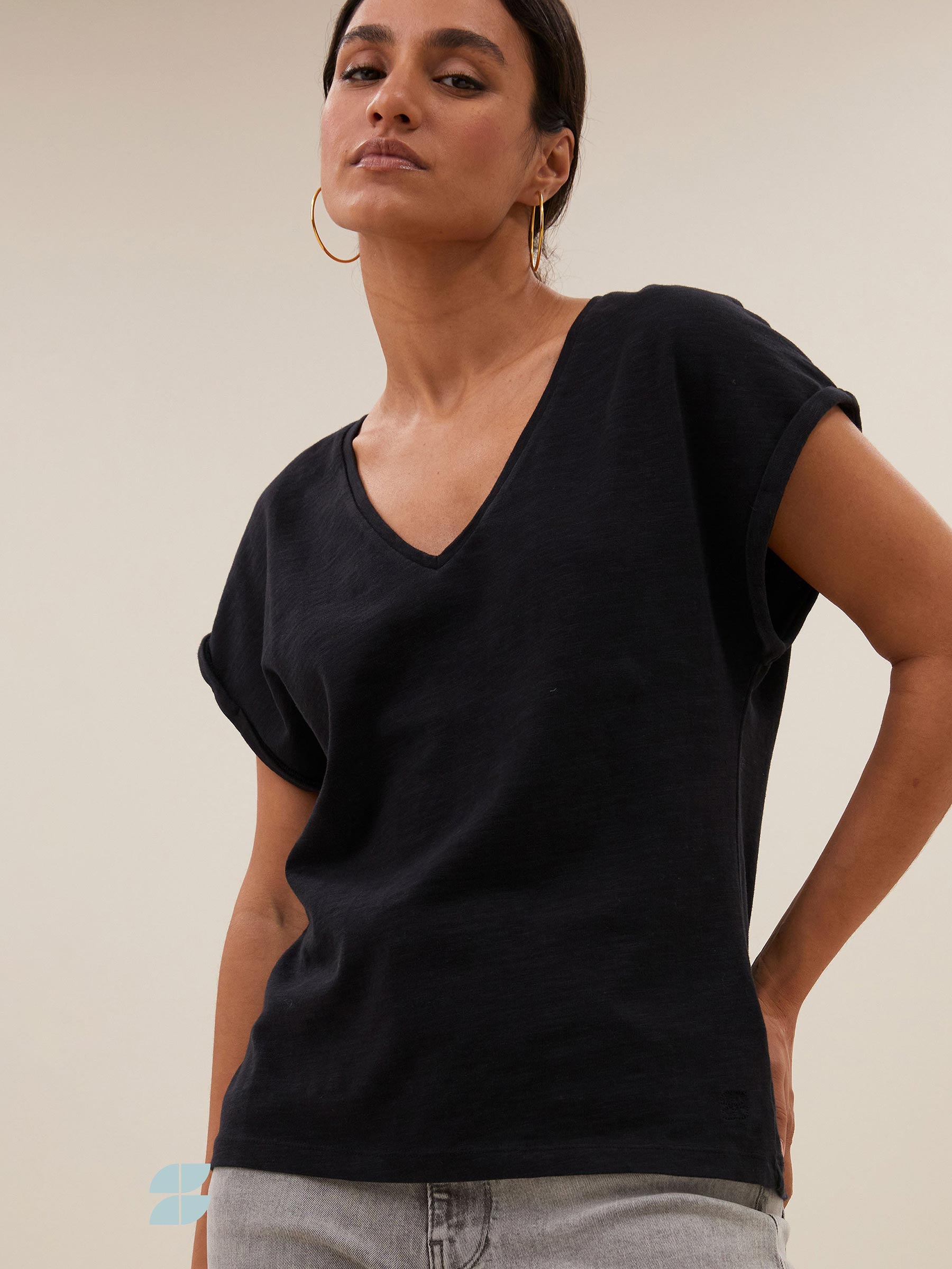 Dit zwarte shirt van by-bar is zo’n fijne basic die altijd goed uitkomt. De zachte katoenkwaliteit en relaxte v-hals geven een frisse, easy look waar je alle kanten mee op kunt, van laidback jeansdagen tot een nette pantalon voor werk. Een top die je zonder nadenken uit de kast trekt.