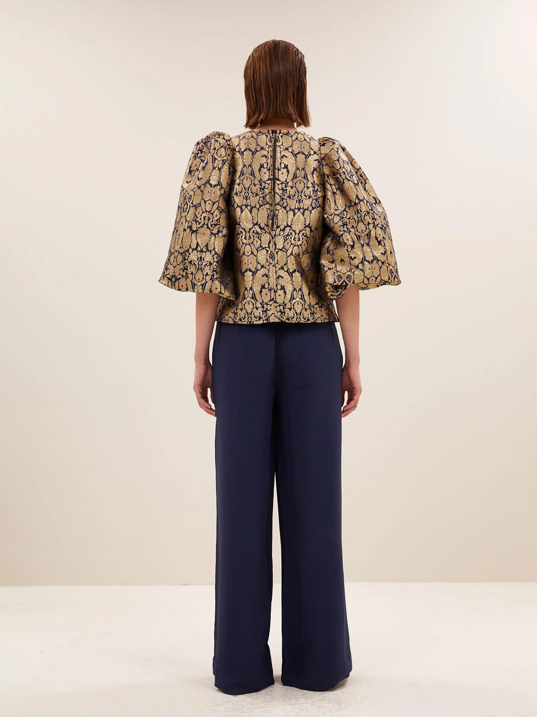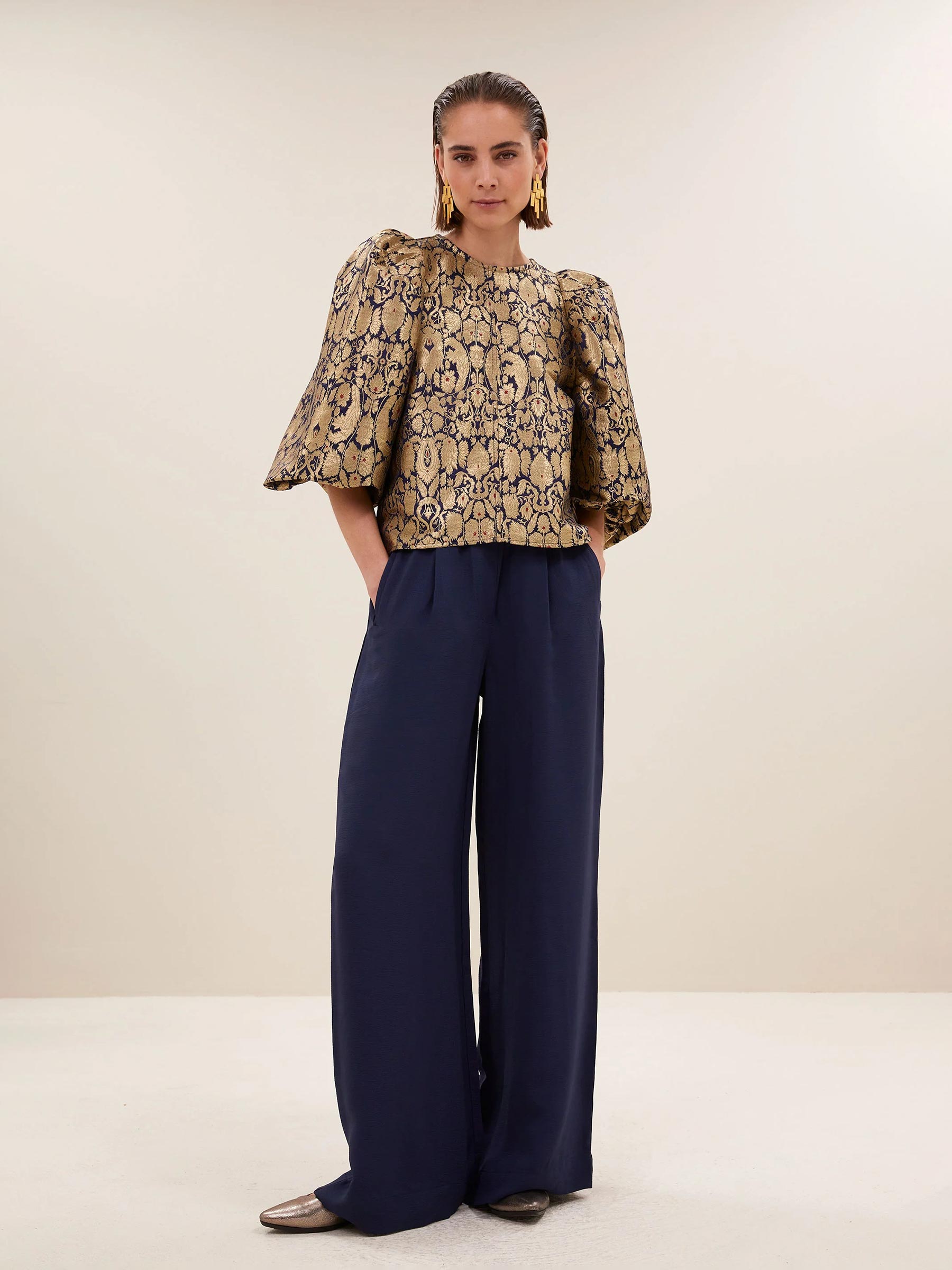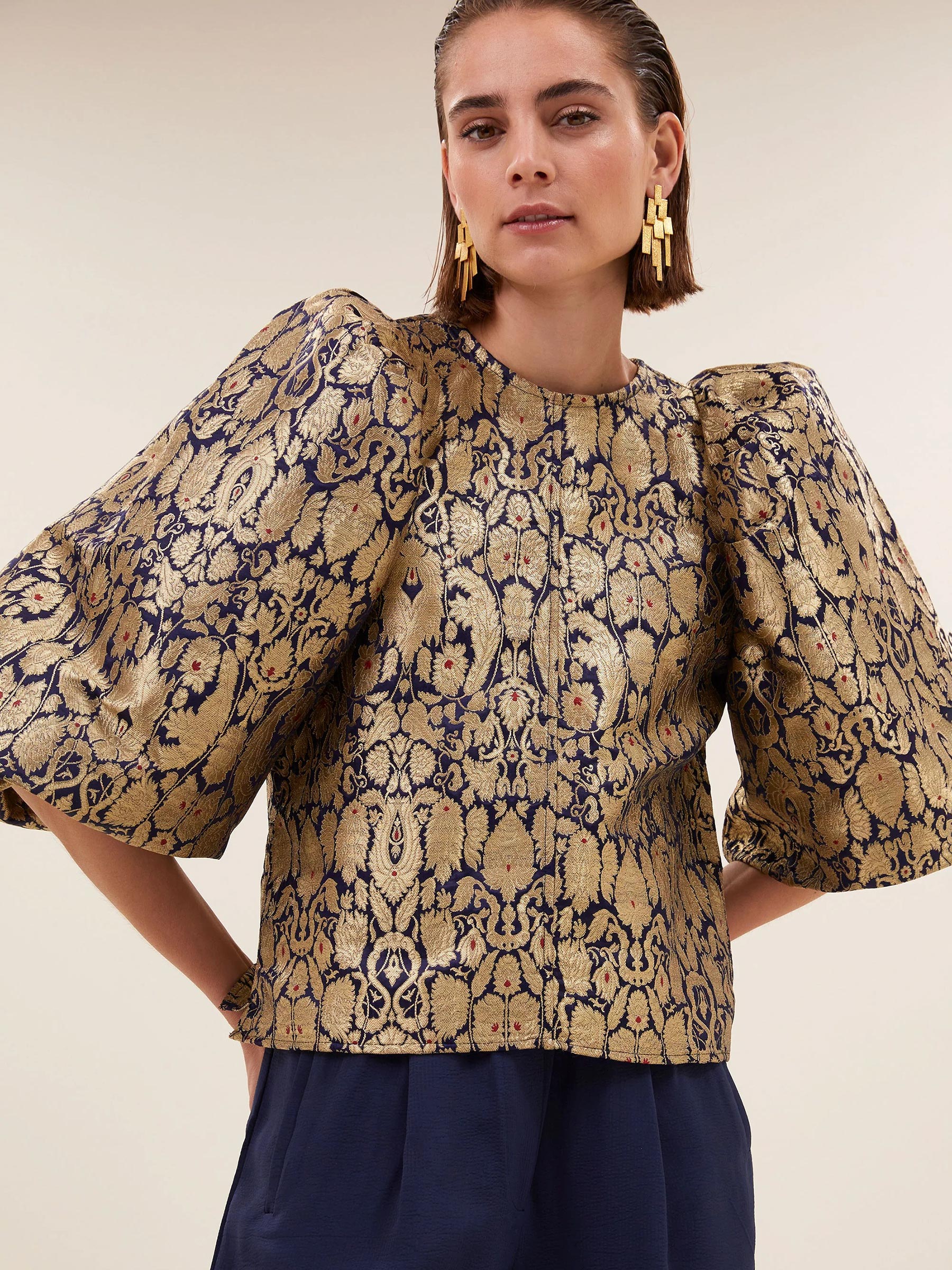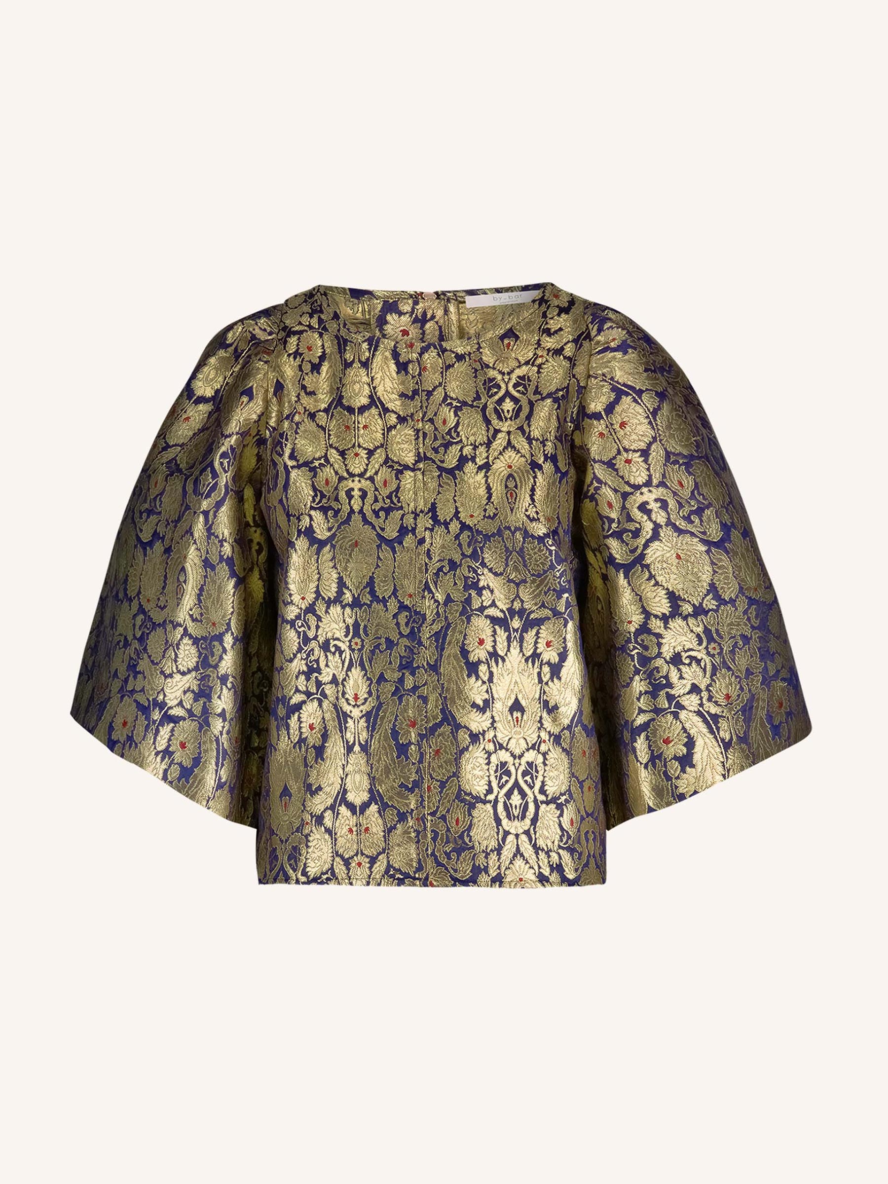 Dit goudkleurige jacquard blouse van by-bar is gemaakt om te stralen tijdens elk feest. De volumineuze mouwen en rijke glansstof zorgen voor een opvallende look met een vleugje glamour. Combineer met een stoere jeans of elegante pantalon voor een feestelijke outfit die altijd klopt.