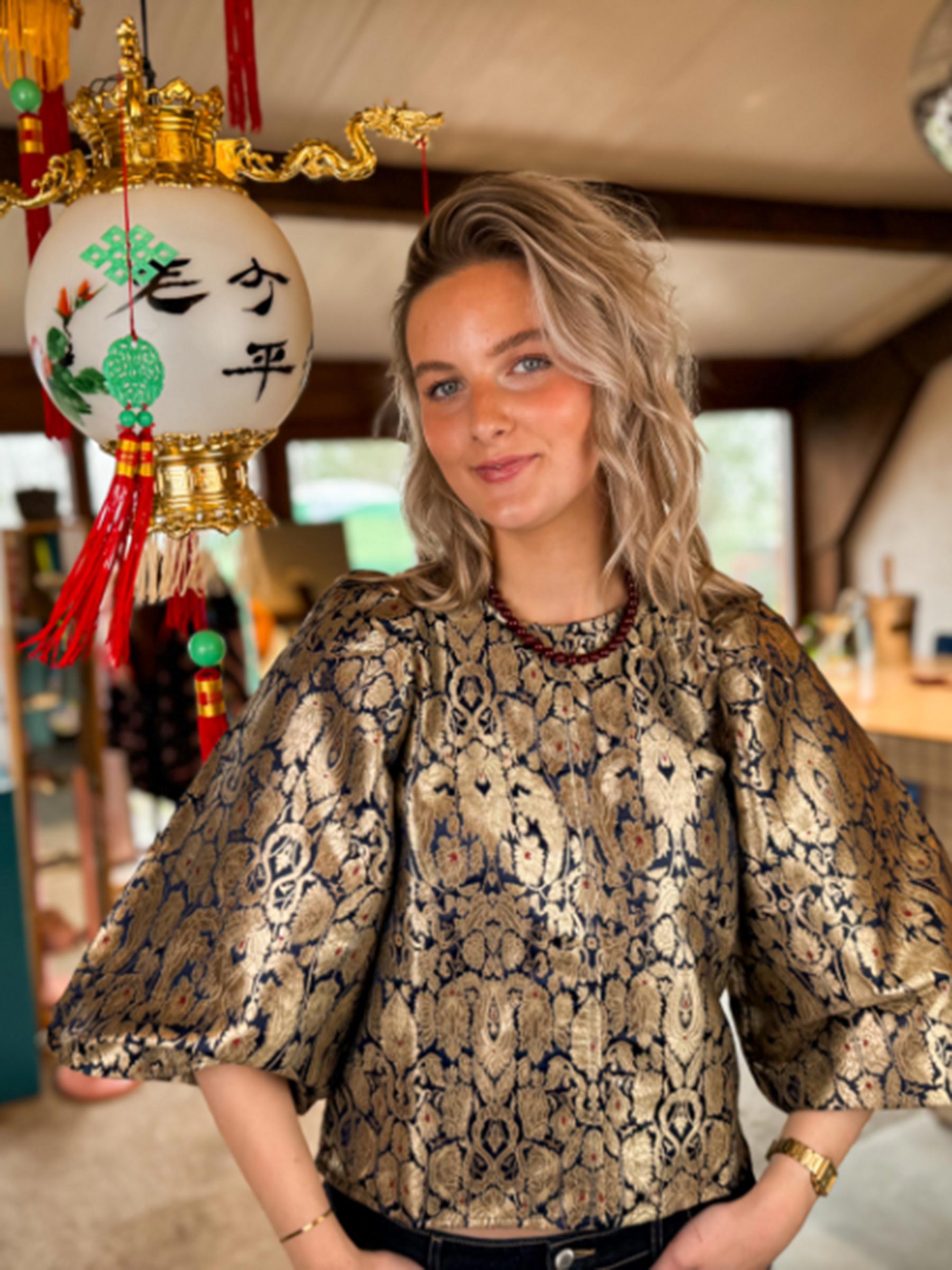 Dit goudkleurige jacquard blouse van by-bar is gemaakt om te stralen tijdens elk feest. De volumineuze mouwen en rijke glansstof zorgen voor een opvallende look met een vleugje glamour. Combineer met een stoere jeans of elegante pantalon voor een feestelijke outfit die altijd klopt.