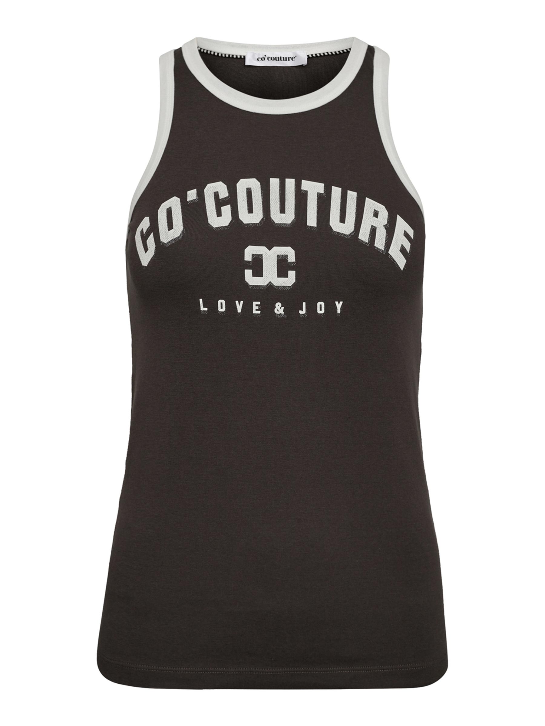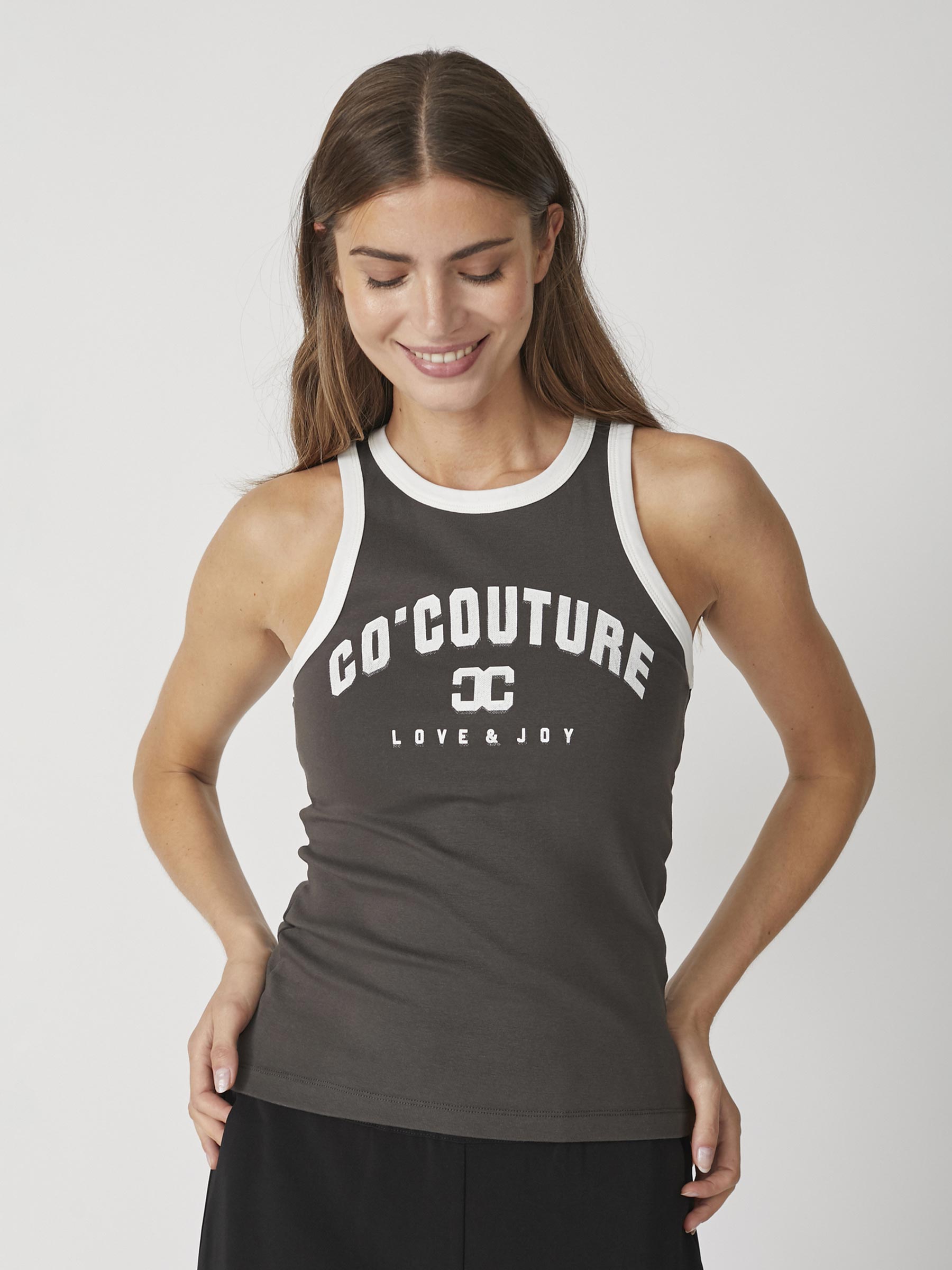 Dit antracietkleurige tanktop van Co’Couture is een echte basic met karakter. De witte randen en het logo op de borst geven een sportieve knipoog, terwijl de zachte katoenmix zorgt voor ultiem draagcomfort. Leuk op een wijde pantalon of onder een open blouse voor een relaxte, maar verzorgde look.
