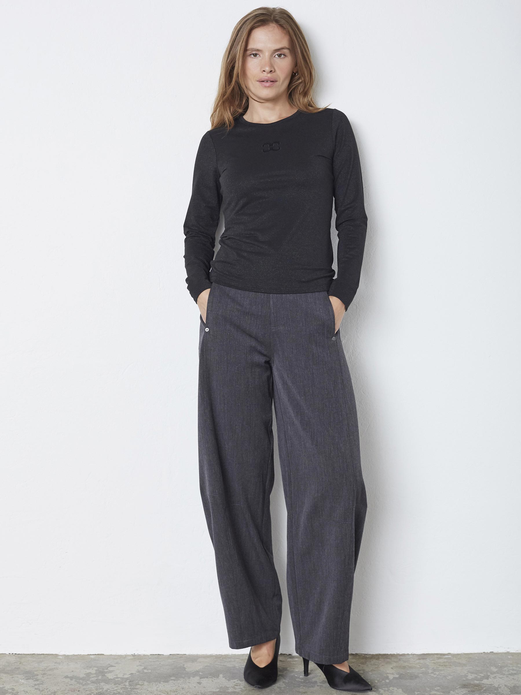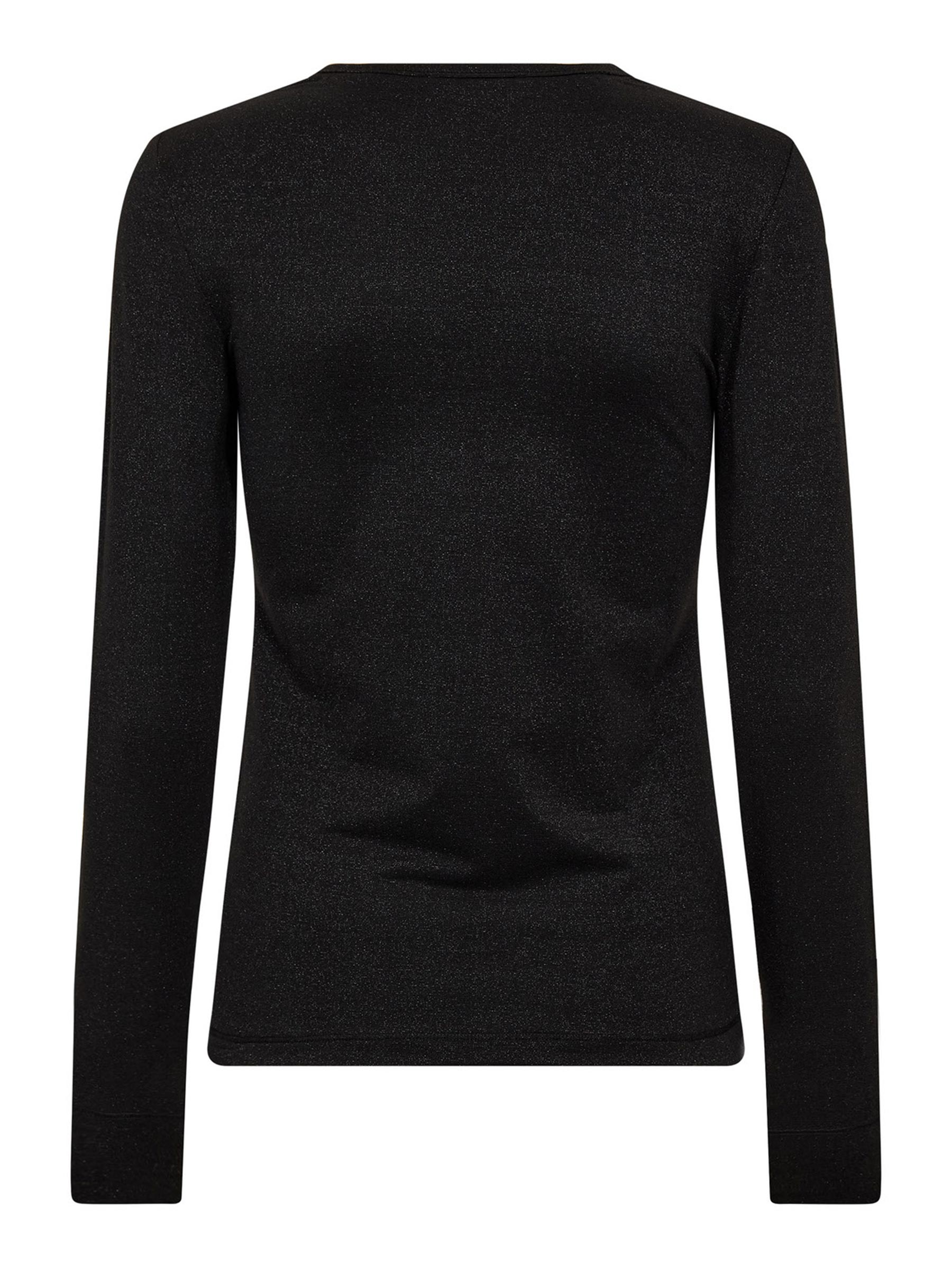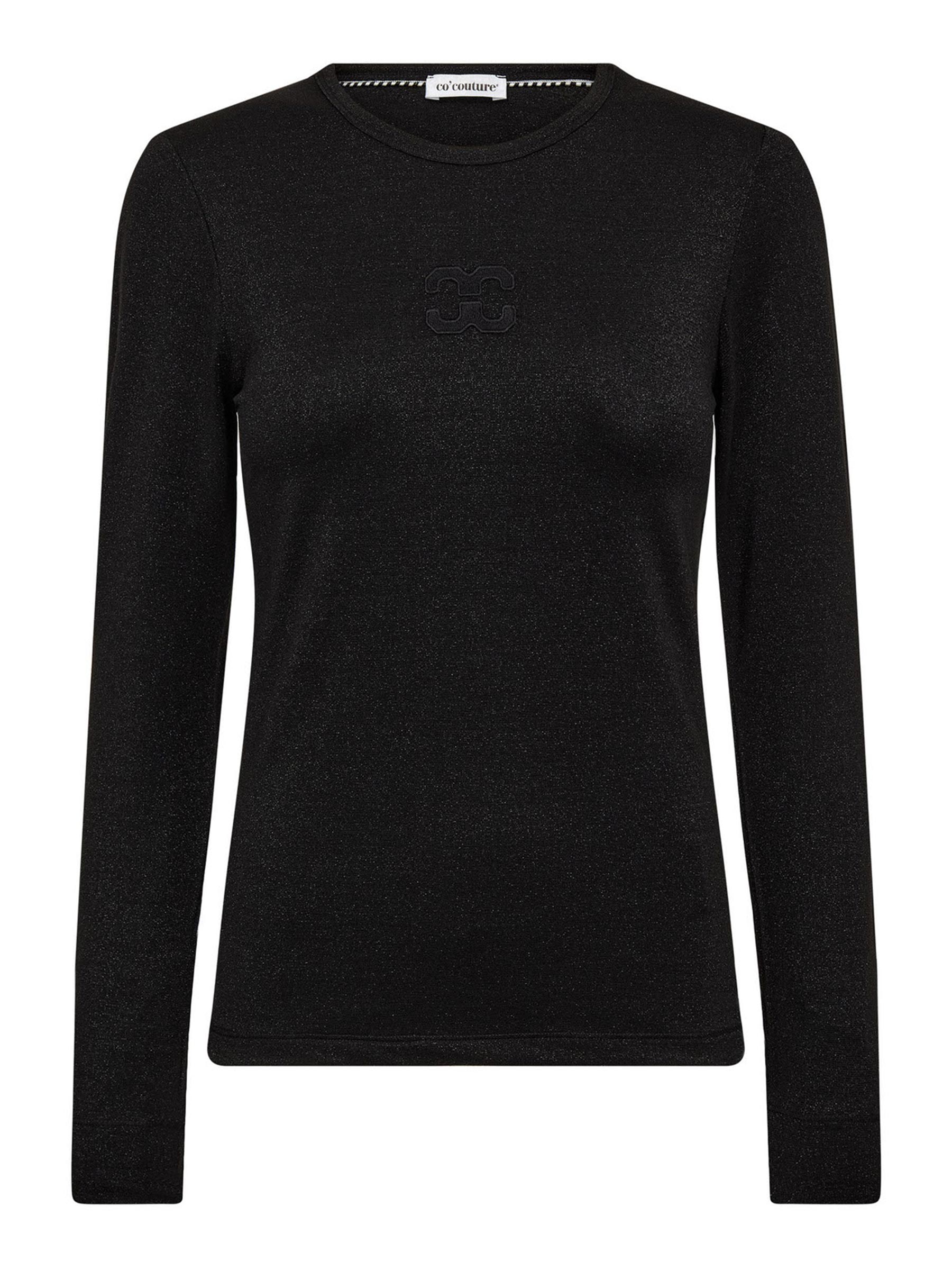 Deze zwarte longsleeve van Co’Couture is de perfecte basic met een subtiele sparkle. De fijne lurex glans en het logo op de borst geven ‘m een moderne uitstraling. Draag onder een blazer of met een wijde pantalon voor een stijlvolle, easy look.