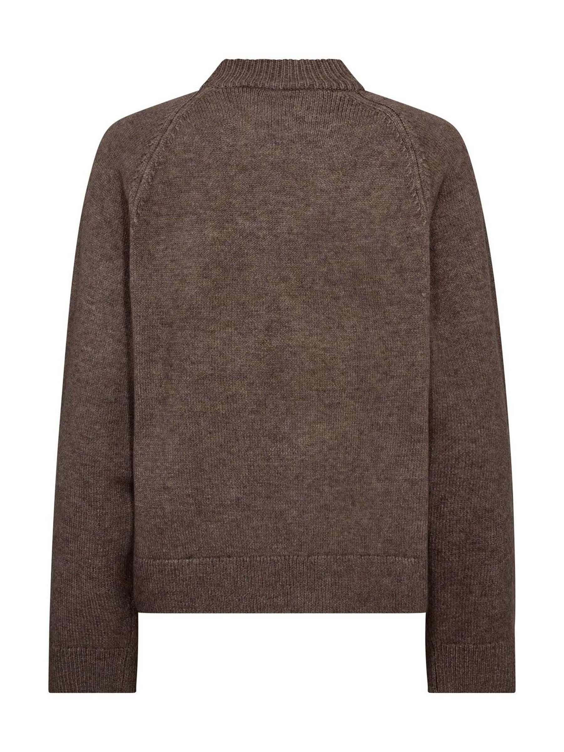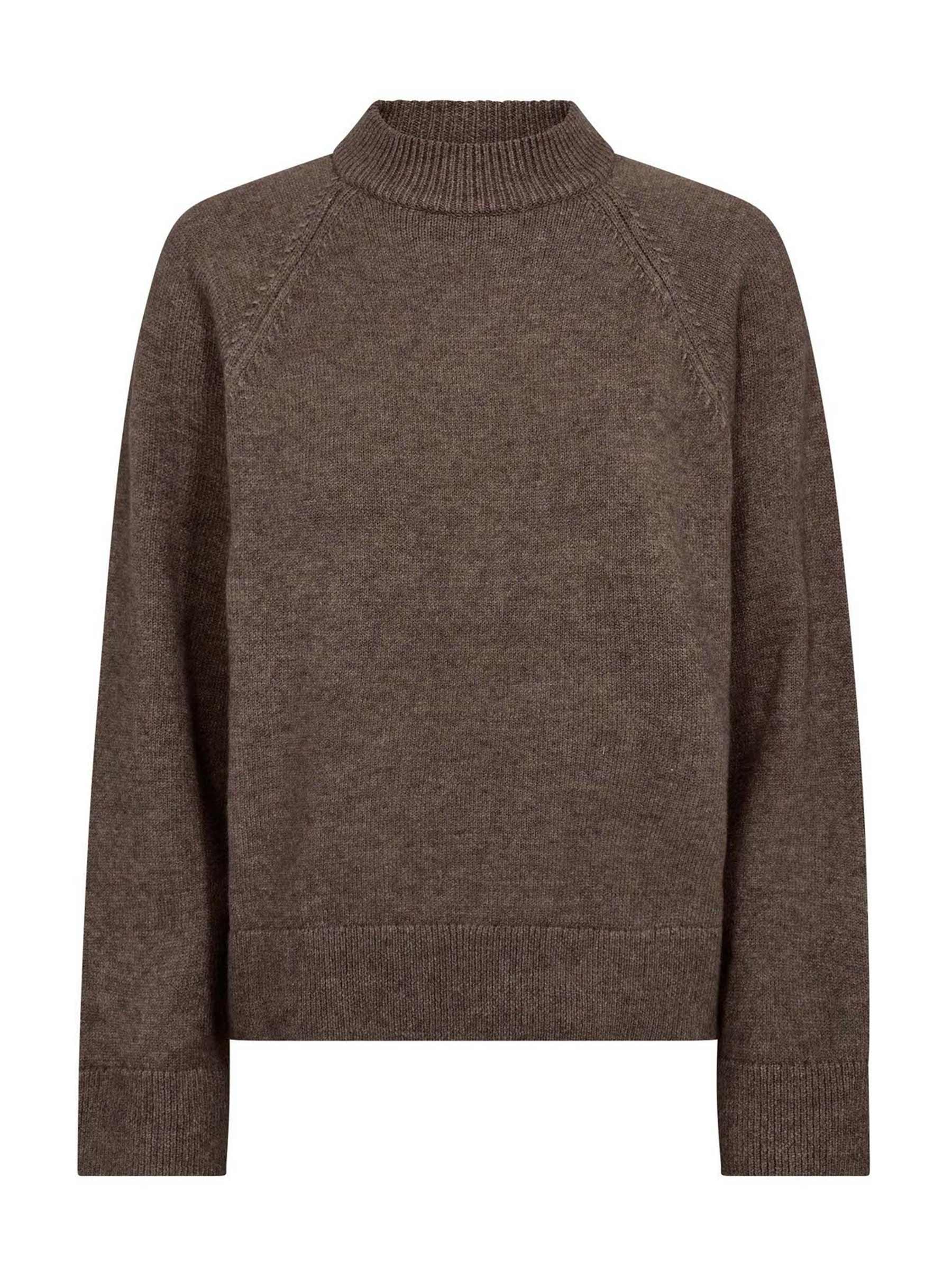 Deze bruine knit van Co'Couture is een fijne basic die je eindeloos combineert. De hoge col en subtiele raglanmouwen geven een moderne touch, terwijl de zachte stof zorgt voor extra comfort. Ideaal om zowel casual met jeans als chic met een rok te dragen.