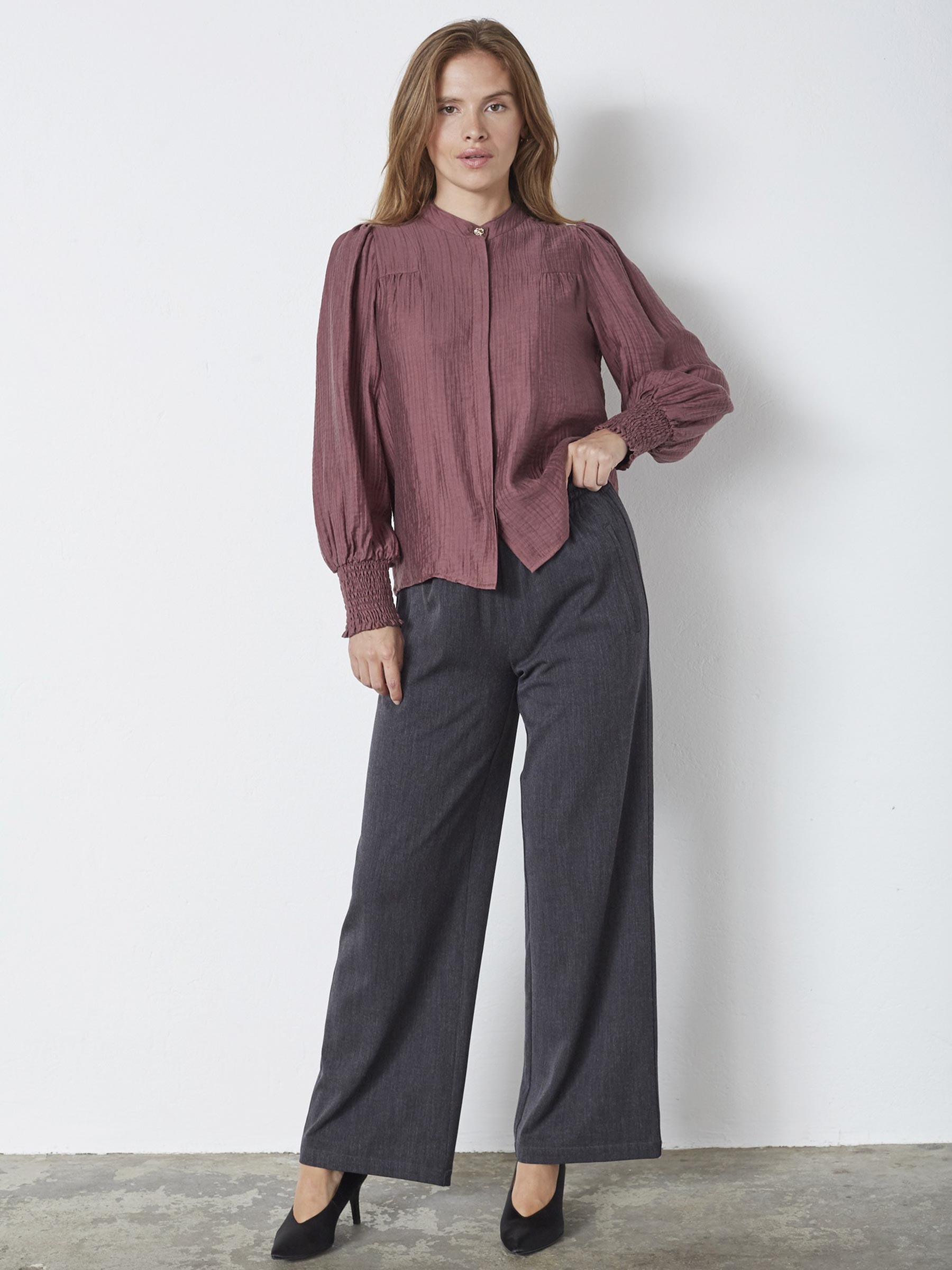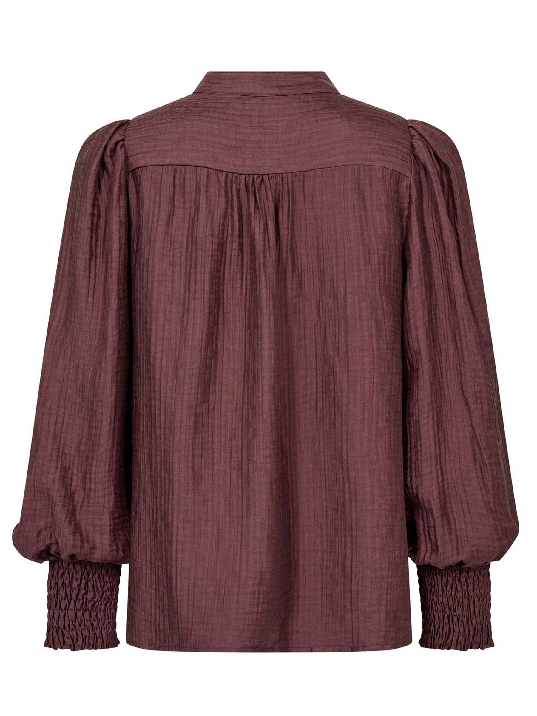 Deze donkerpaarse blouse van Co’Couture is een echte blikvanger met haar subtiele glans en vrouwelijke details. De hoge hals met goudkleurig knoopje en de licht geplooide mouwen geven de blouse een chique uitstraling. Combineer met een denim of pantalon voor een tijdloze look.