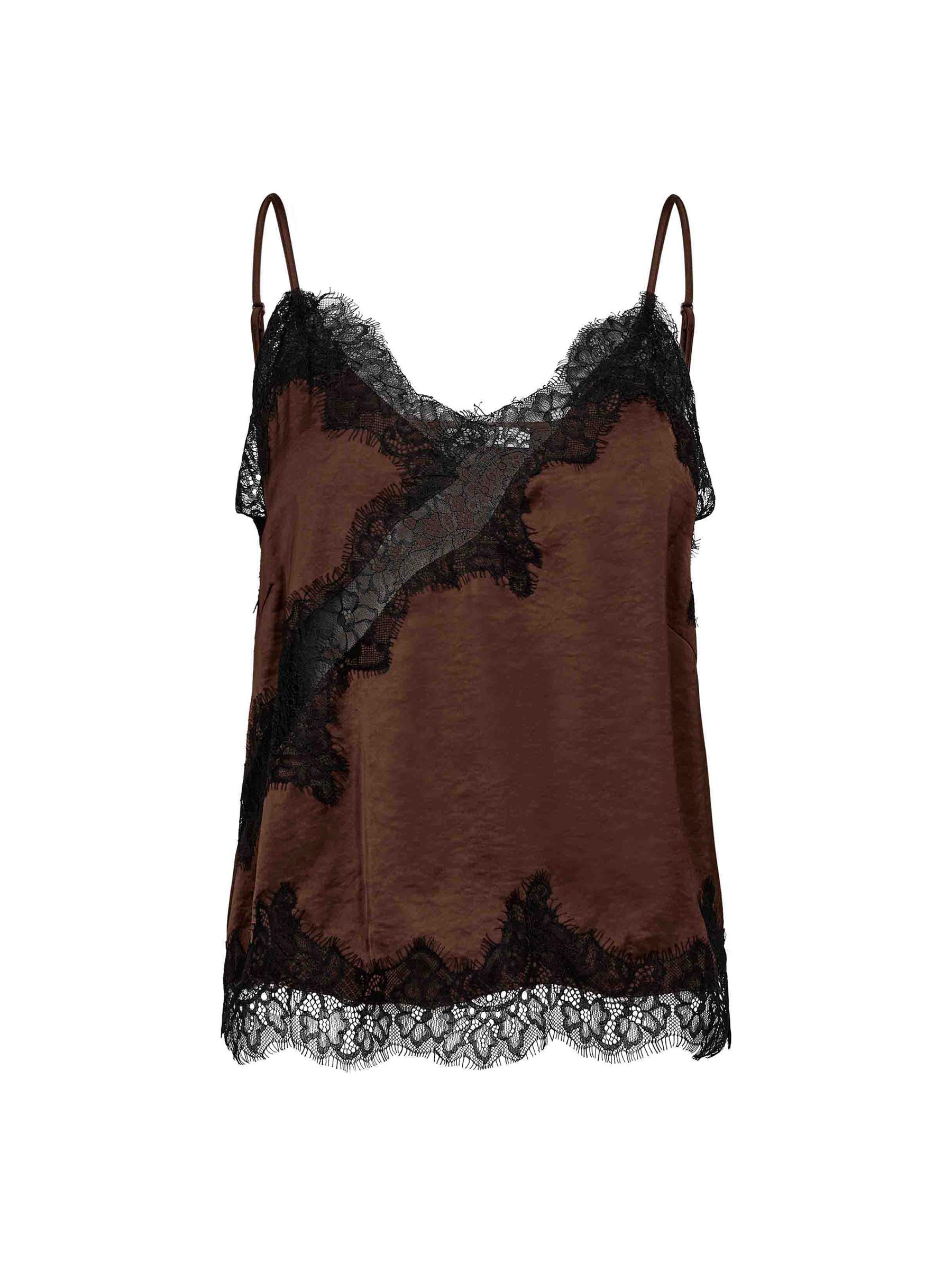 Deze donkerbruine top van Co'couture geeft je outfit meteen een vrouwelijke look dankzij de kanten details. De soepele stof valt mooi en combineert makkelijk met een blazer, jeans of rok voor elke gelegenheid. Perfect om zowel casual als iets gekleder te dragen.