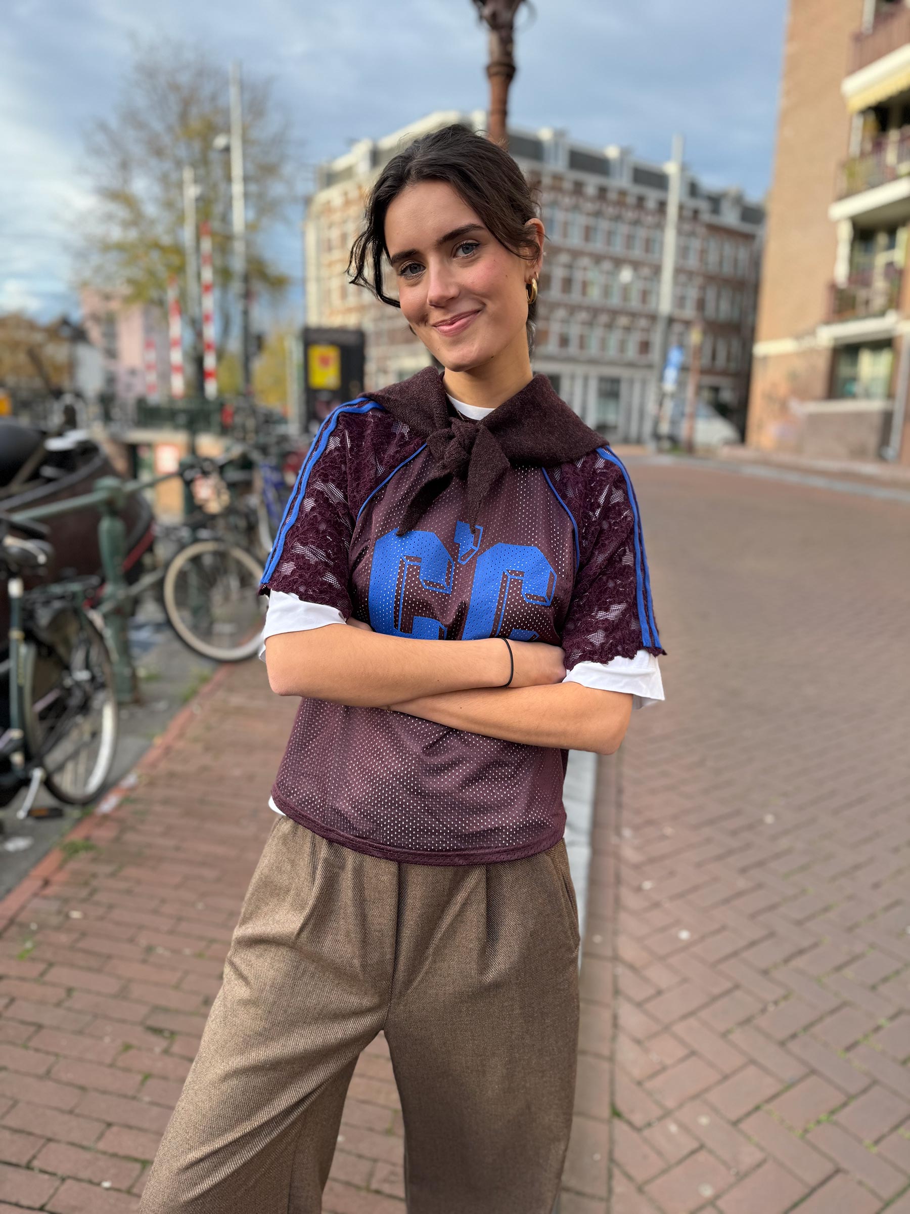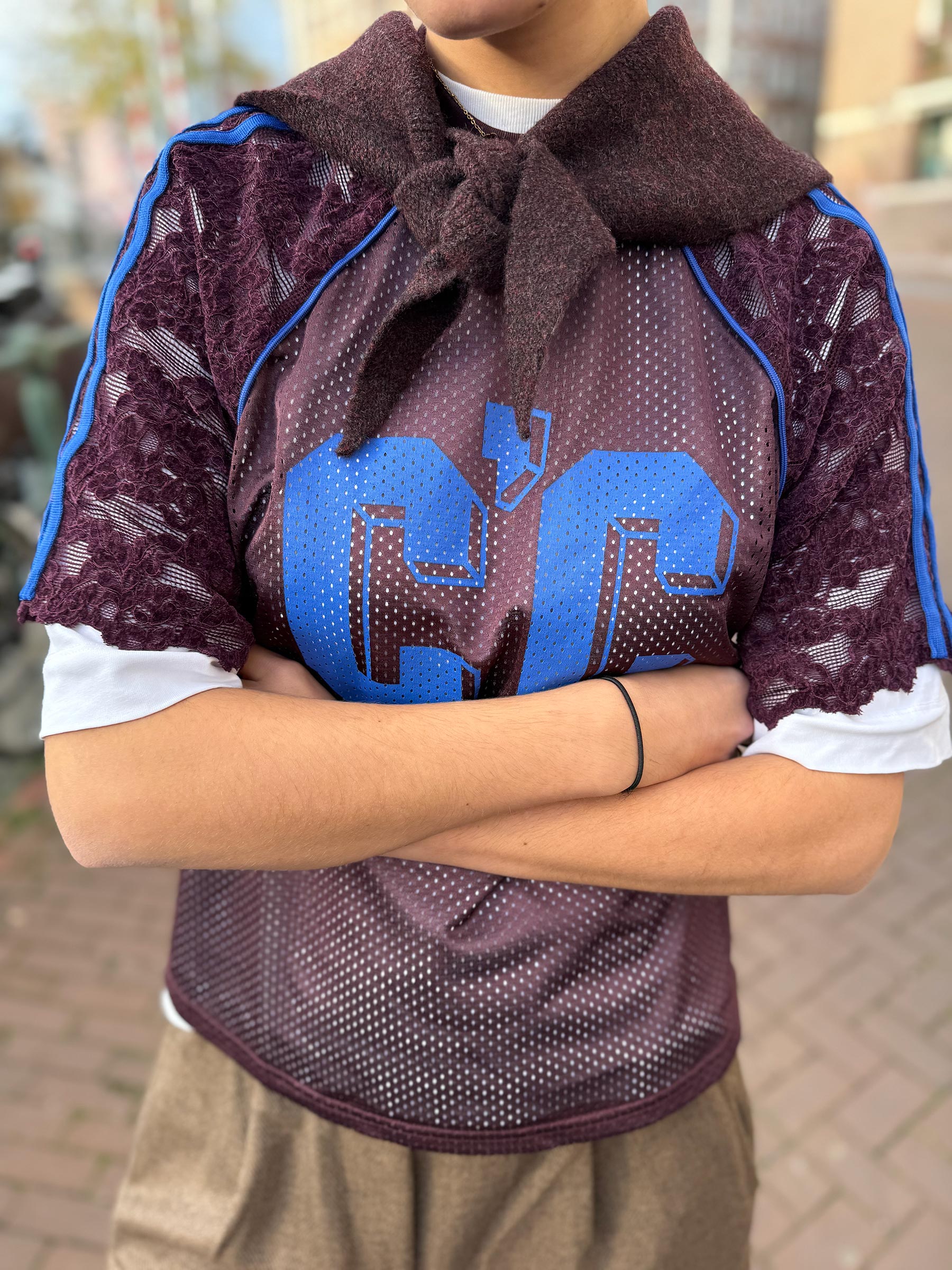 Deze bordeaux jersey top van Co’Couture is gemaakt van luchtige mesh stof met kanten mouwen en afgewerkt met kobaltblauwe strepen en een opvallend logo op de borst. Een echte statement piece die elke outfit iets spannends geeft.