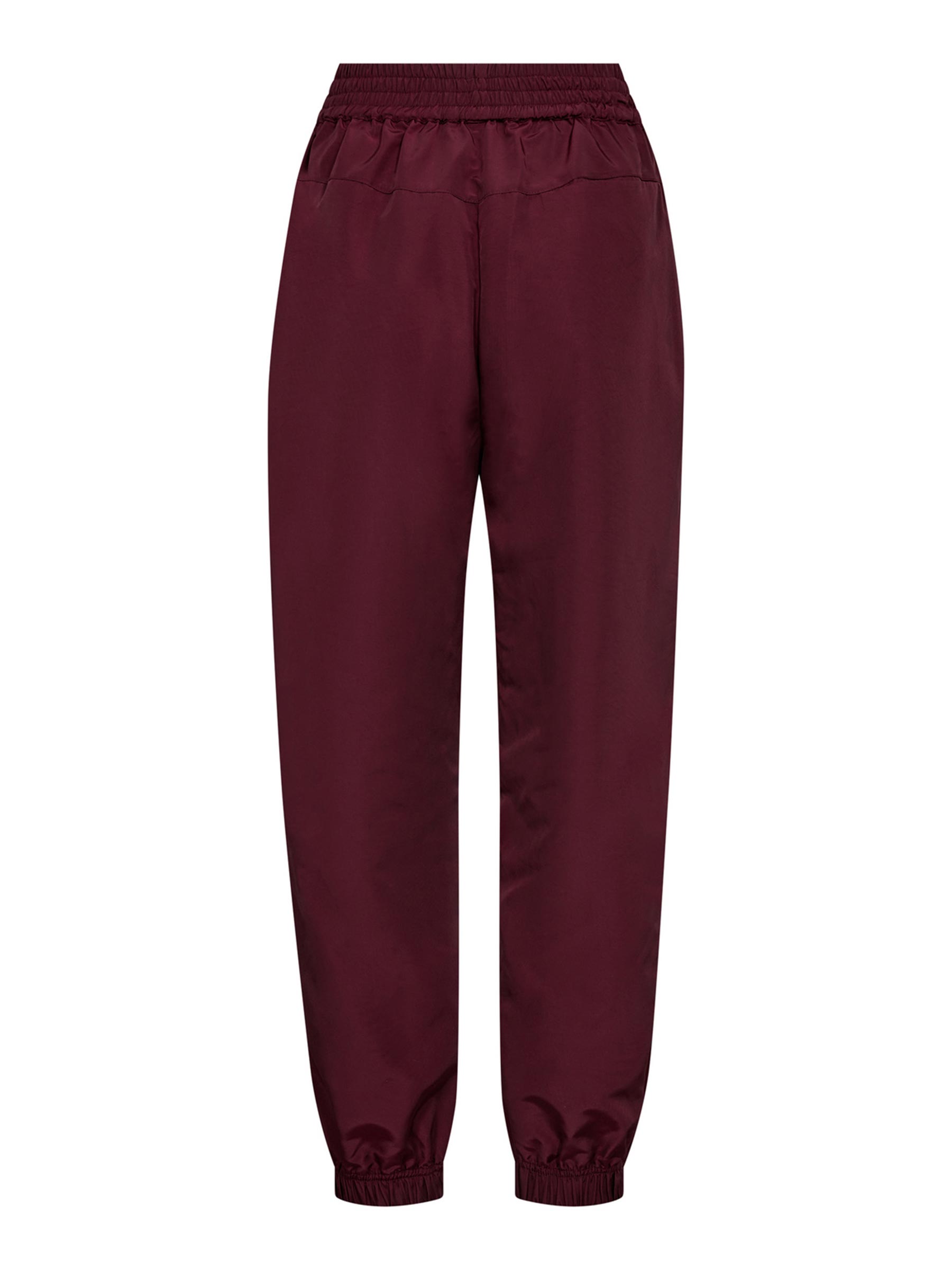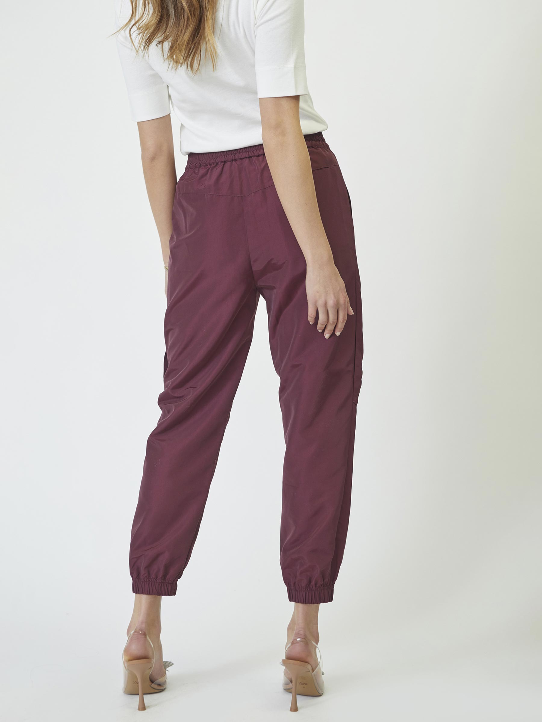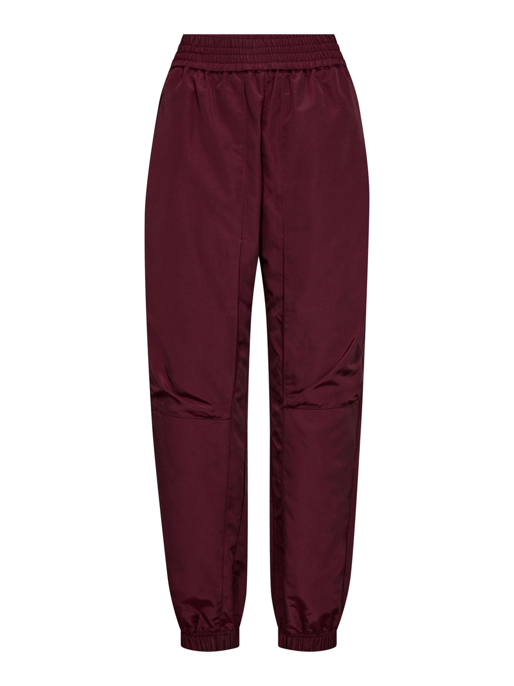 Deze bordeauxrode broek van Co’Couture heeft die nonchalante look waar je eindeloos mee kunt combineren. De elastische taille en enkelboorden zorgen voor een relaxte fit, terwijl de glanzende stof een sportieve touch toevoegt. Draag met een luchtige blouse of een strak tanktop voor een easy maar geklede look.