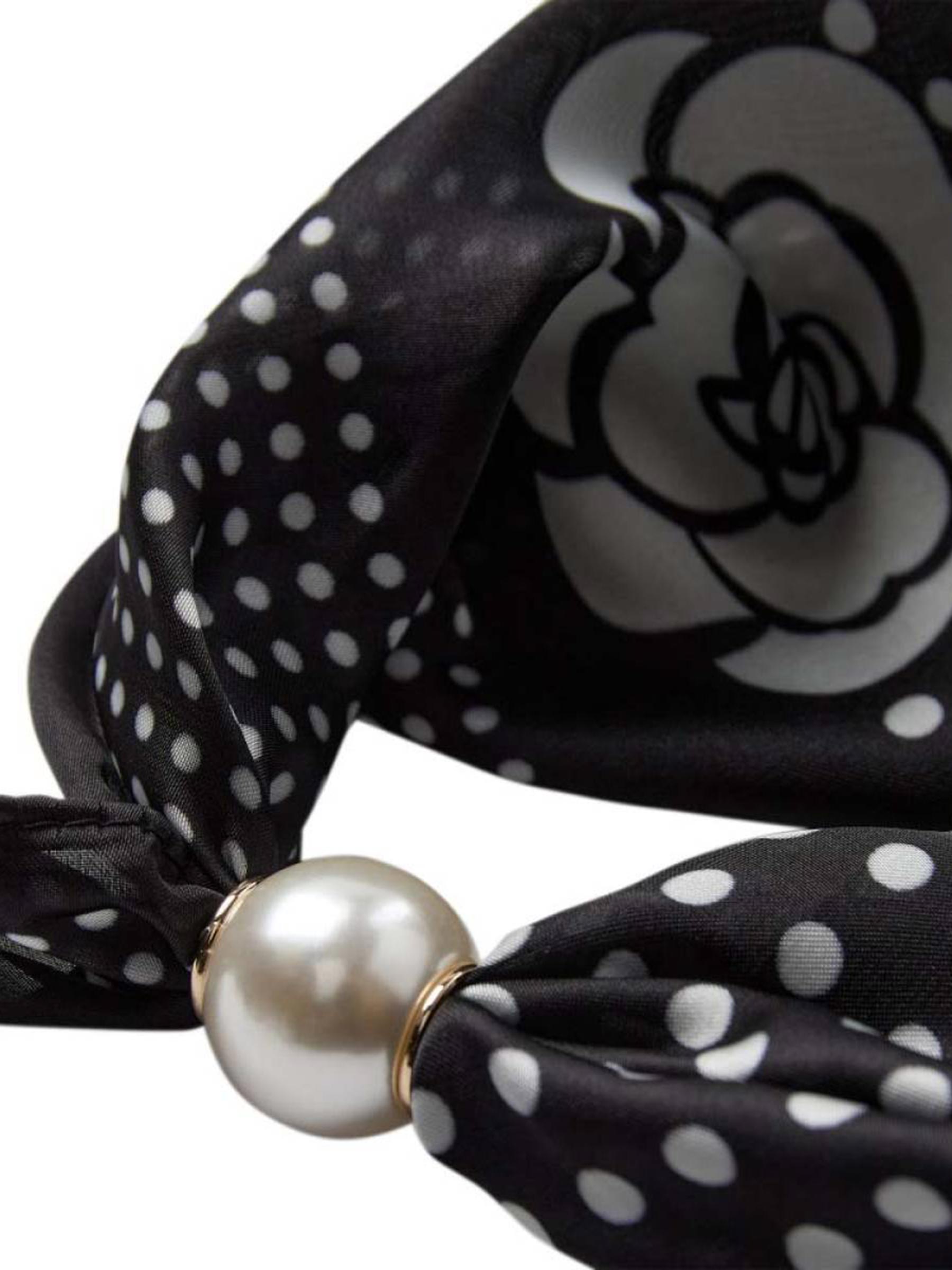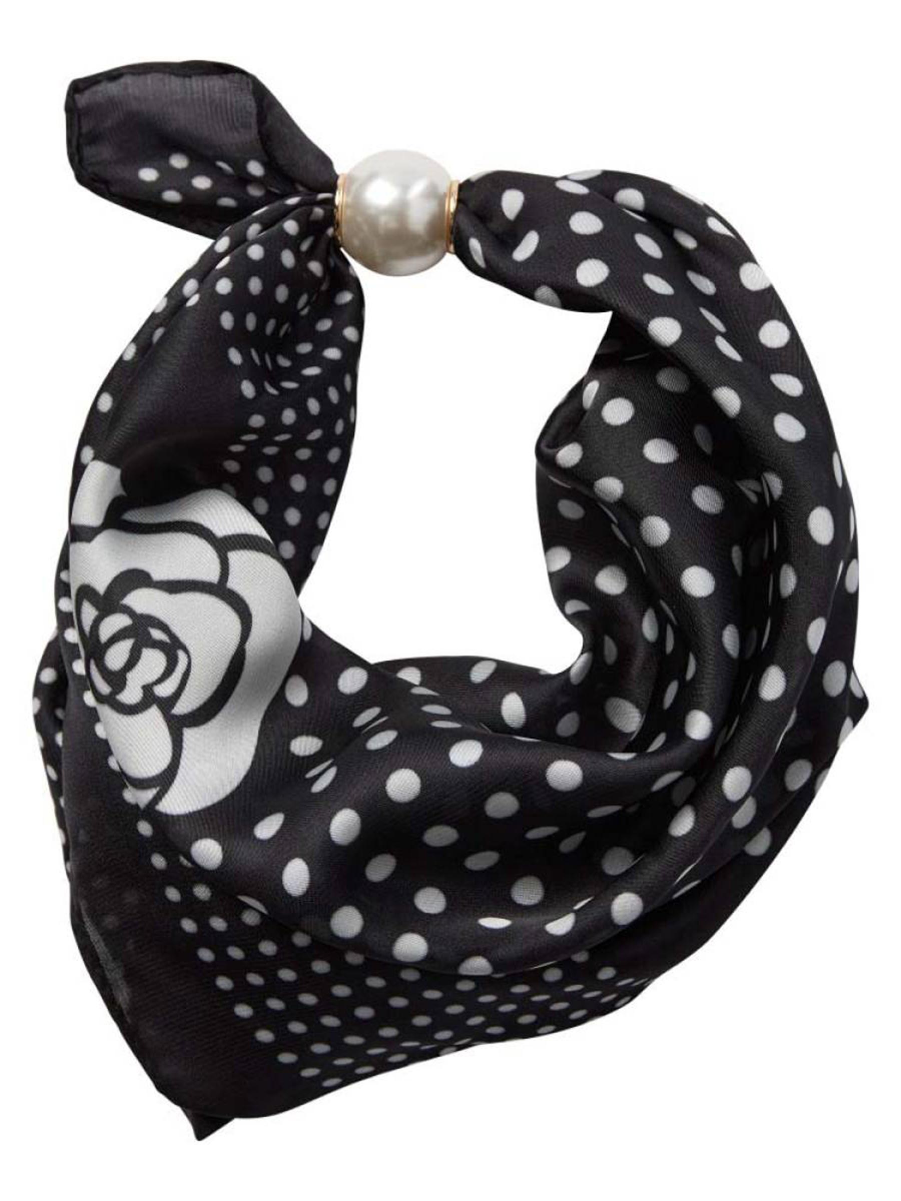 Deze zwarte sjaal van Co’couture is zo’n accessoire dat elke outfit meteen afmaakt. De combinatie van stippen, bloemendetail en de parel zorgt voor een chique look met een knipoog. Leuk om los te dragen in je haar, om je nek of aan je tas geknoopt.