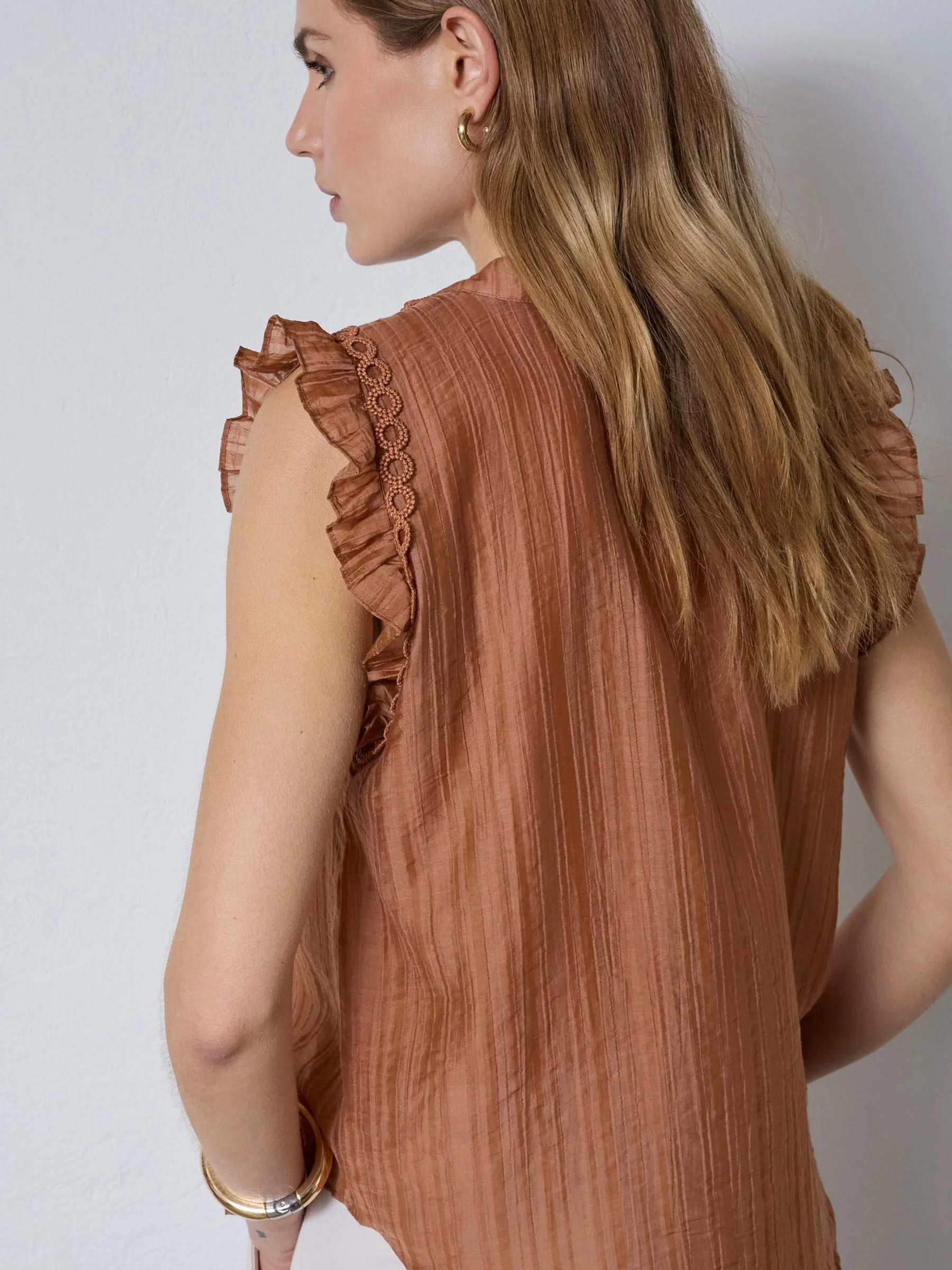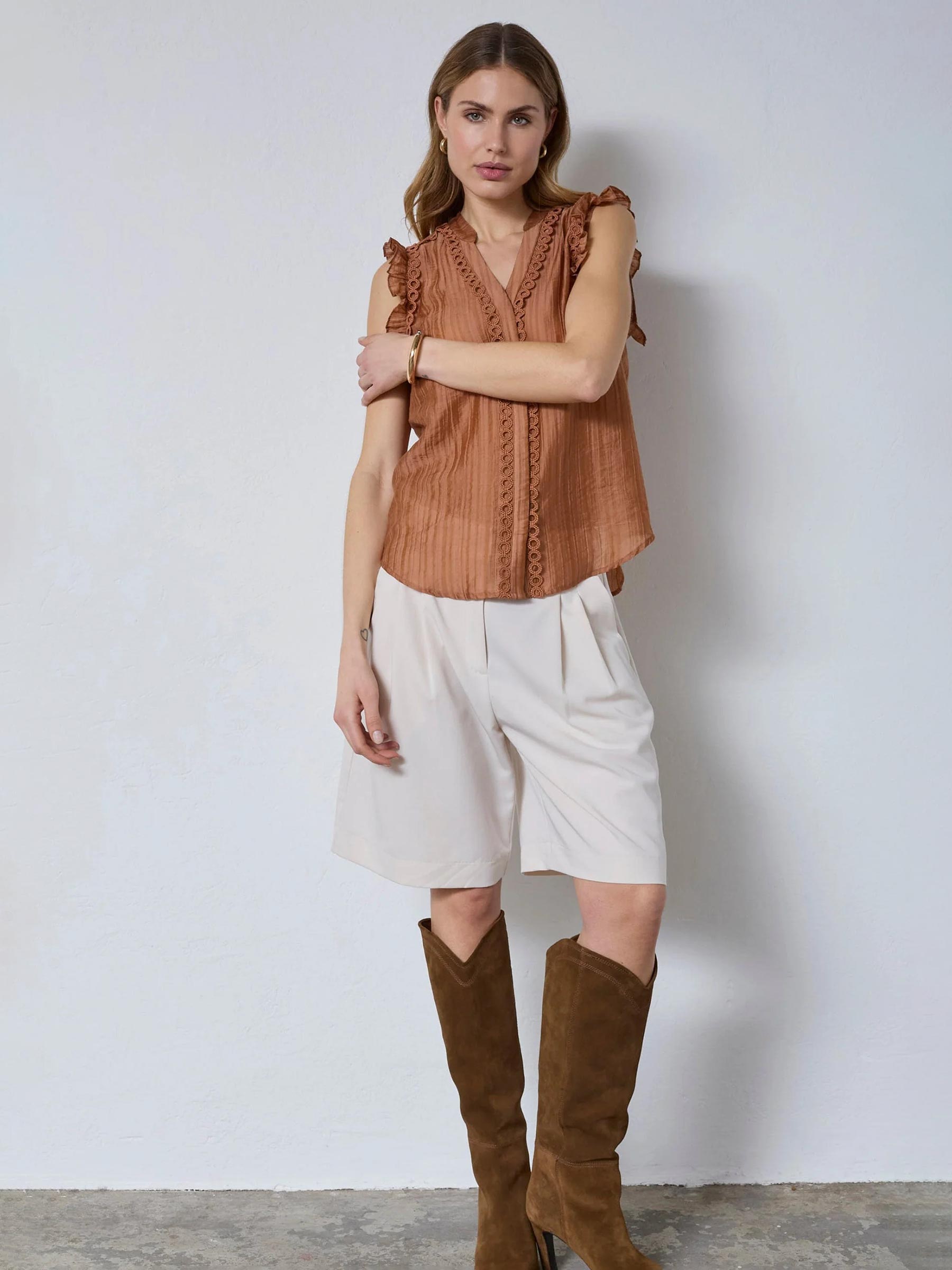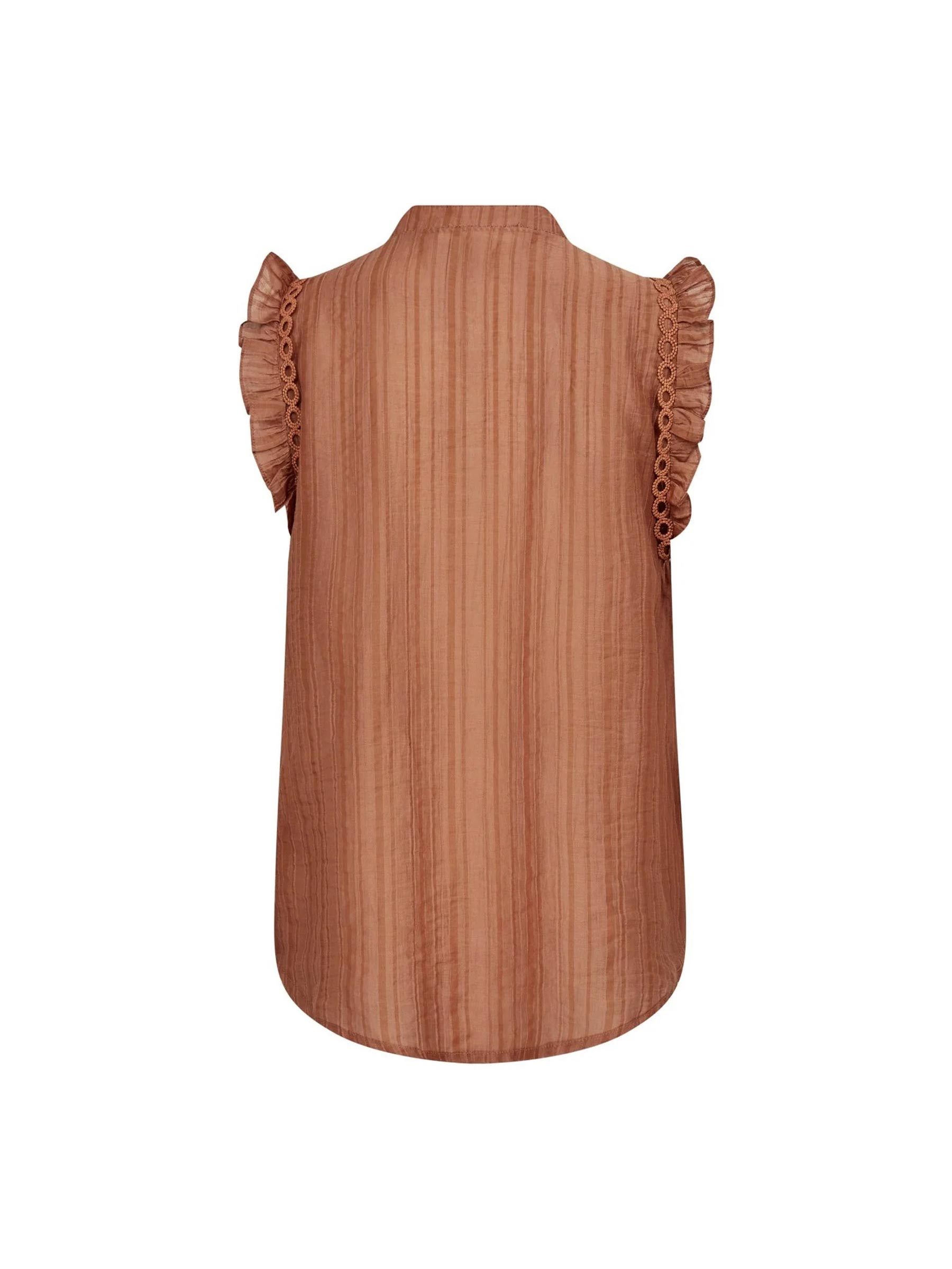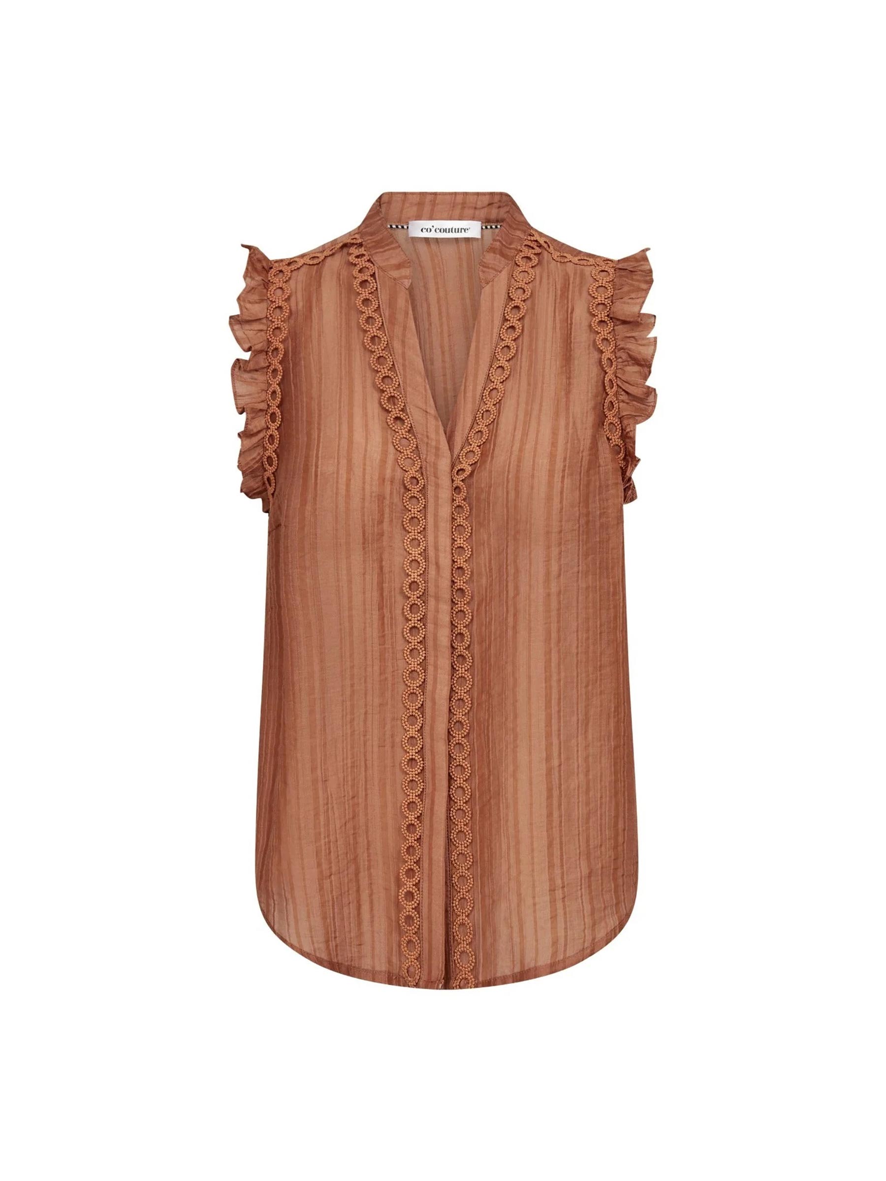 De ReggieCC frill top van Co'Couture is een verfijnde toevoeging aan je zomergarderobe door de warme suntan kleur. Deze mouwloze top combineert een romantische uitstraling met een luchtig draagcomfort voor zonnige dagen. Het Deense merk staat bekend om haar moderne ontwerpen met een vrouwelijke signatuur.