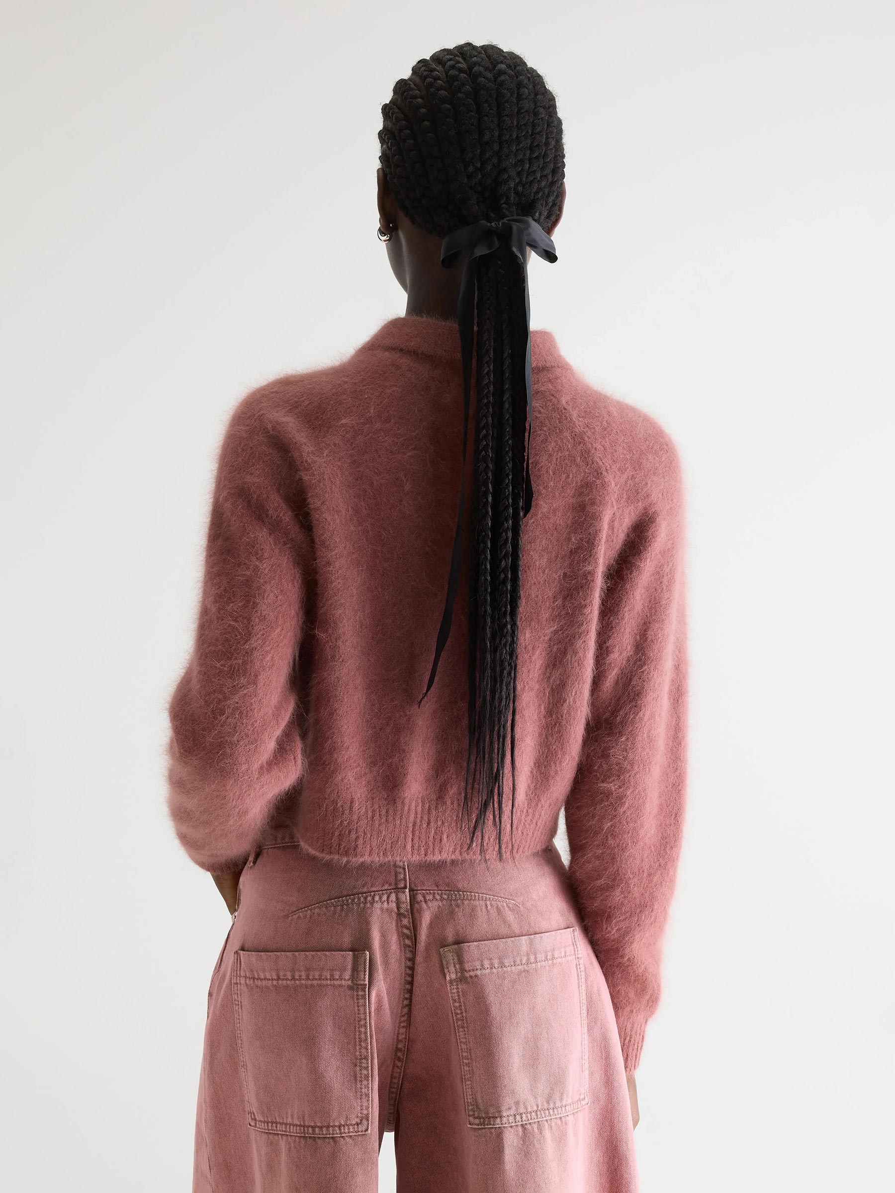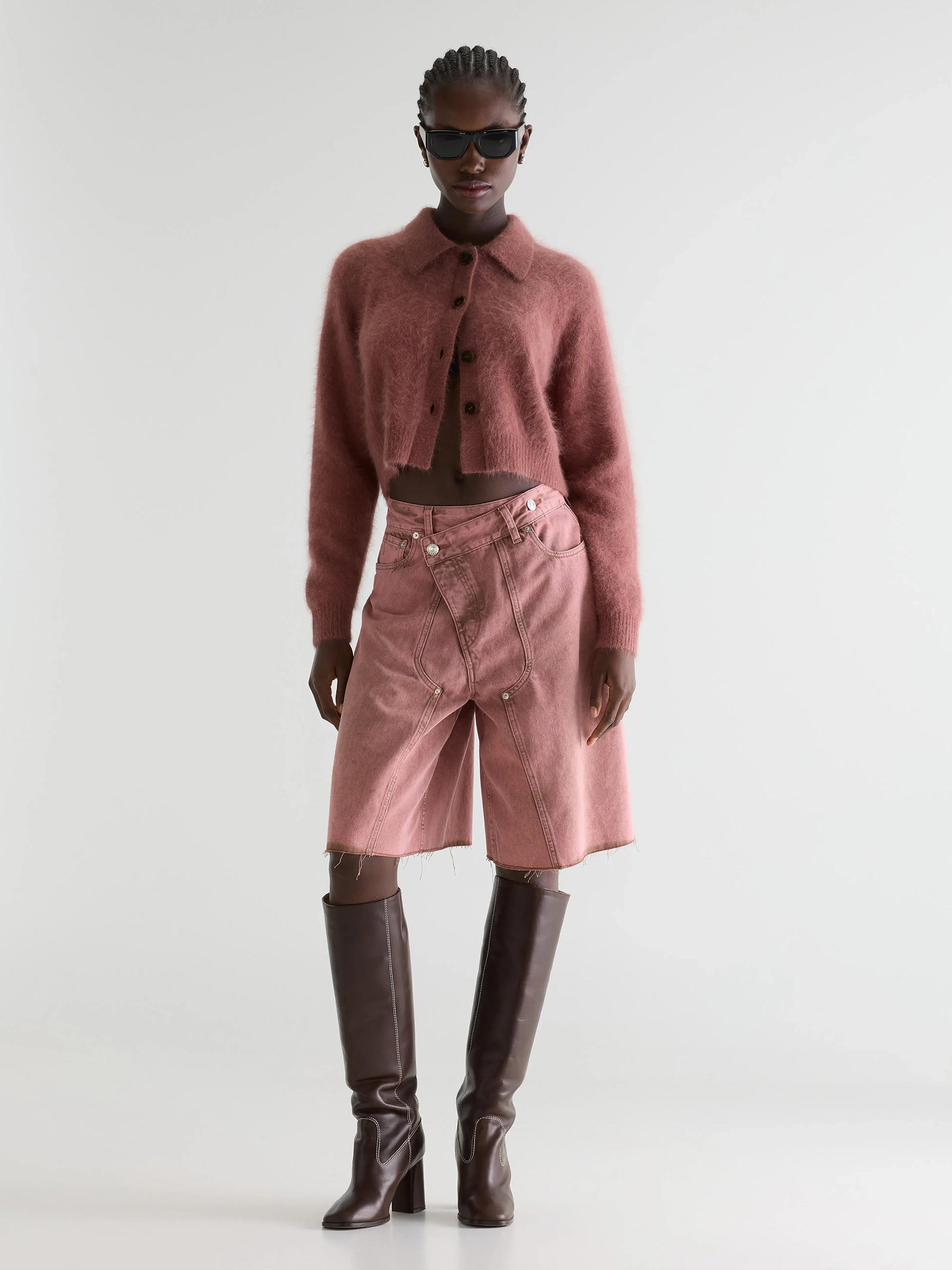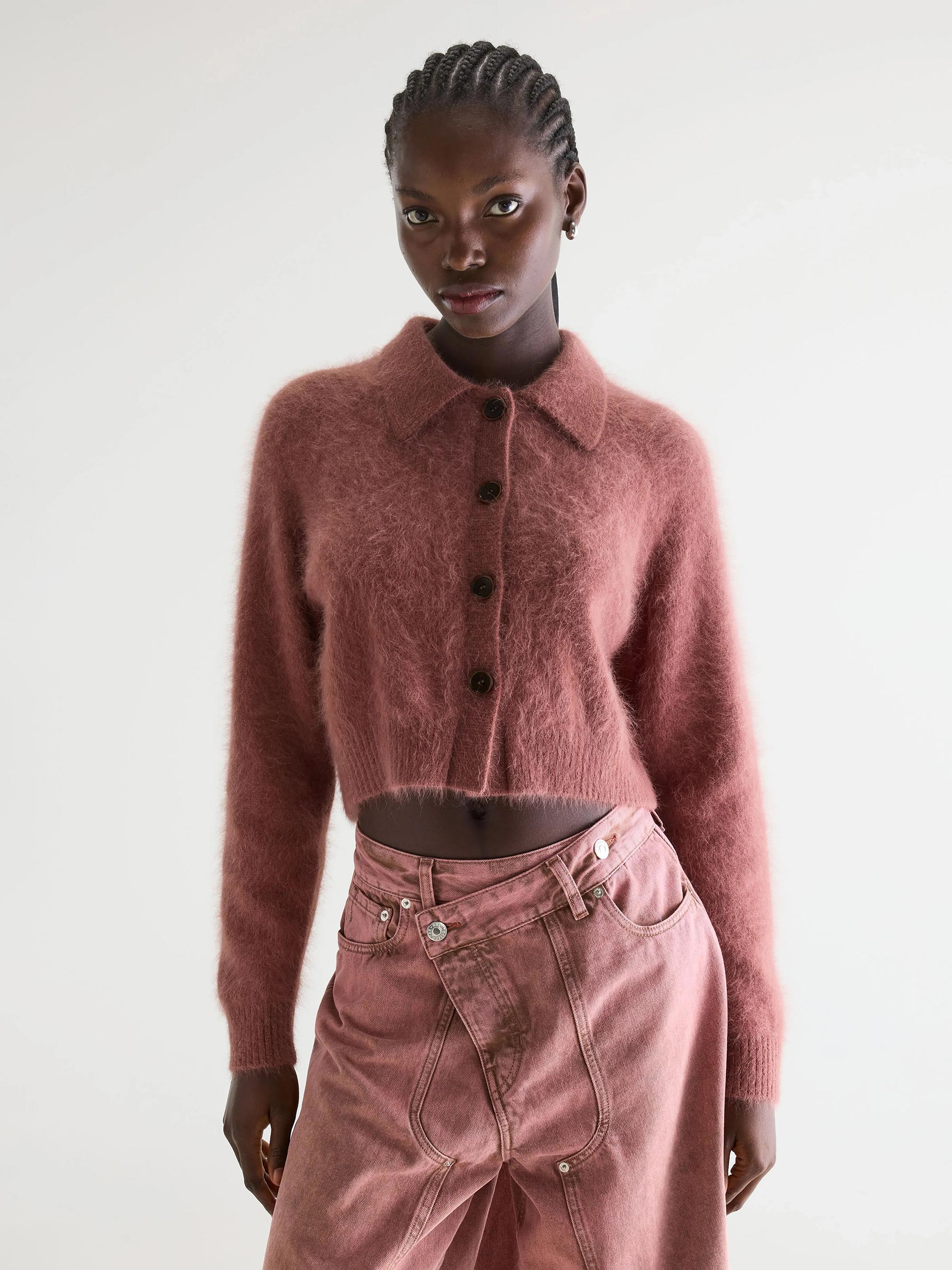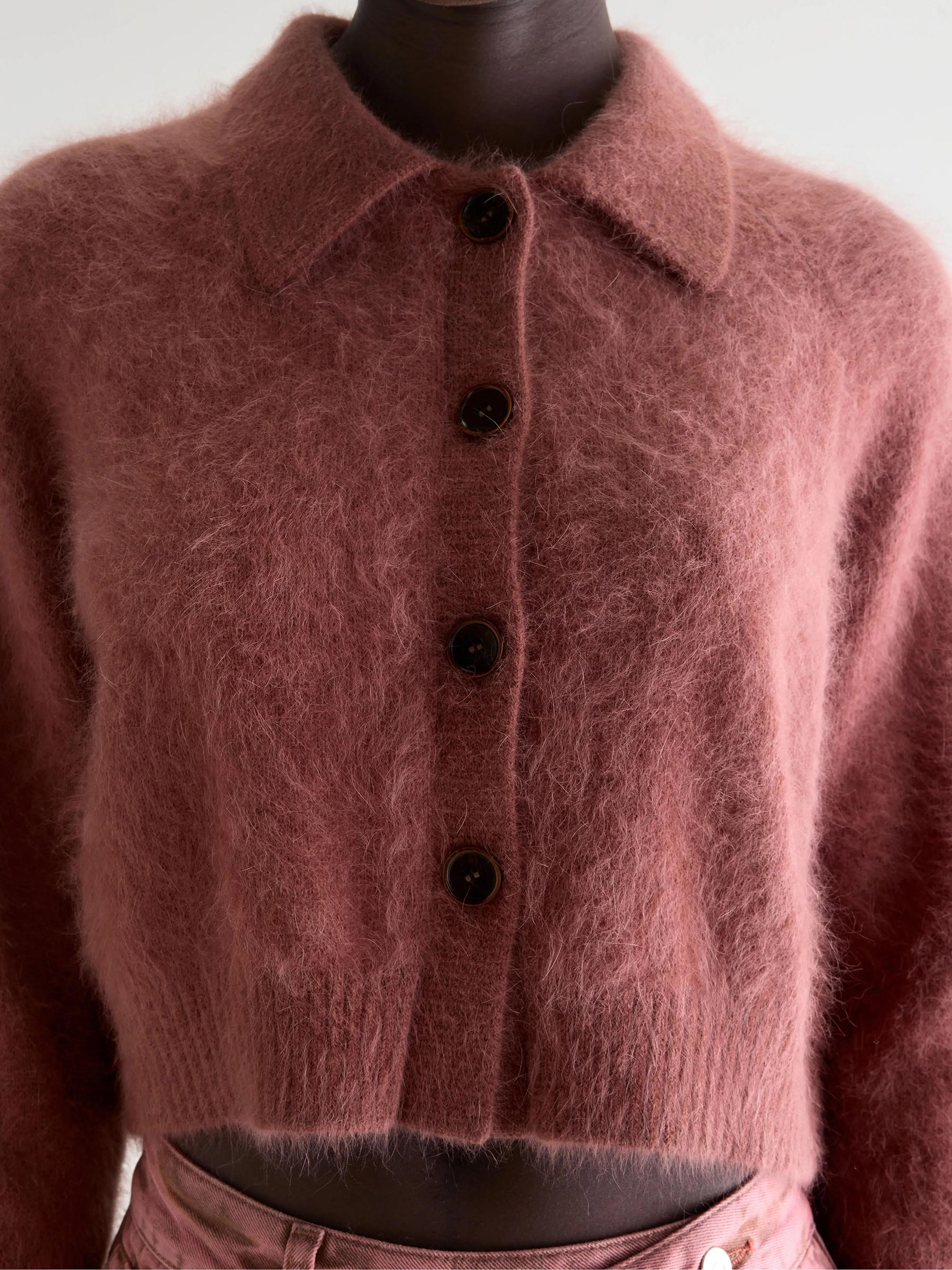 Dit roze vest van Bellerose is een echte blikvanger. Zacht, licht en met een korte lengte die perfect te dragen is op een jeans of juist op een hoge taille rok.
