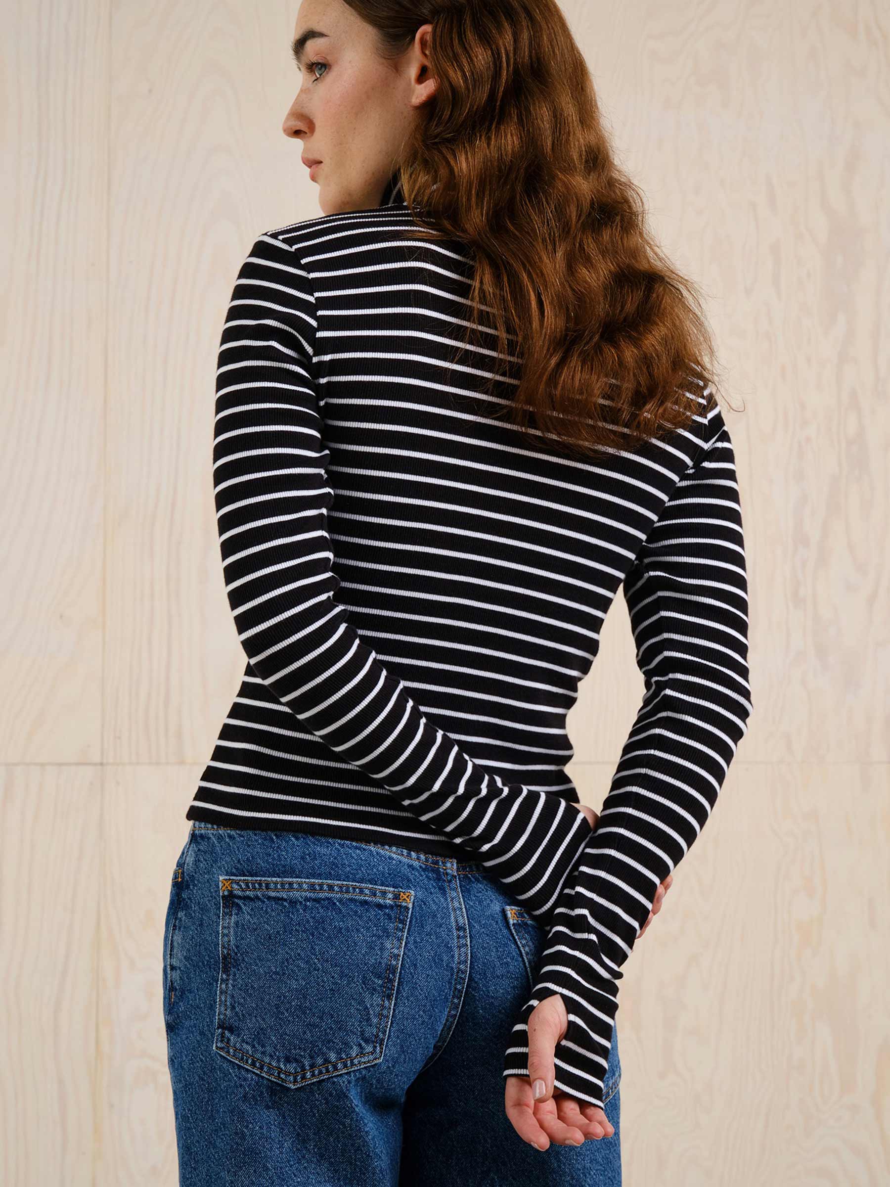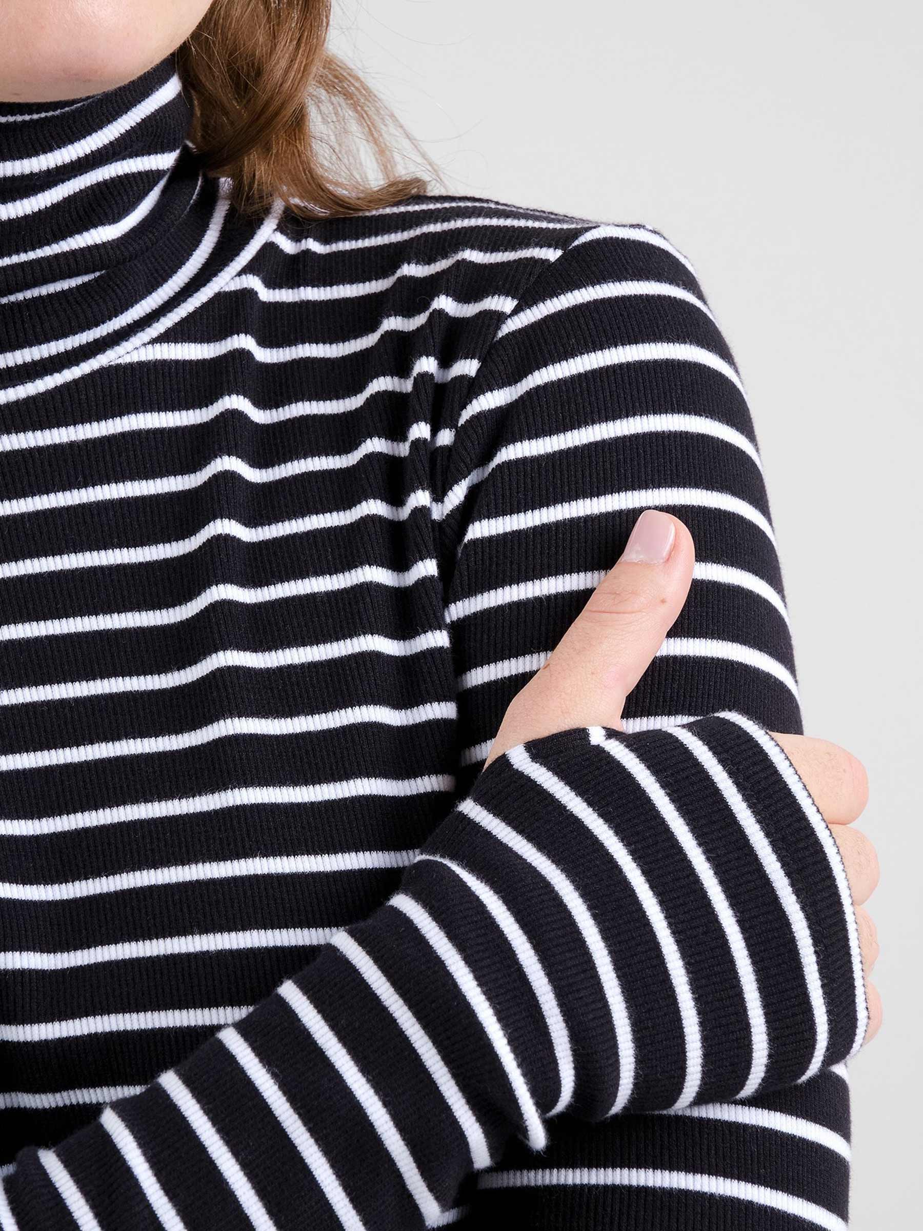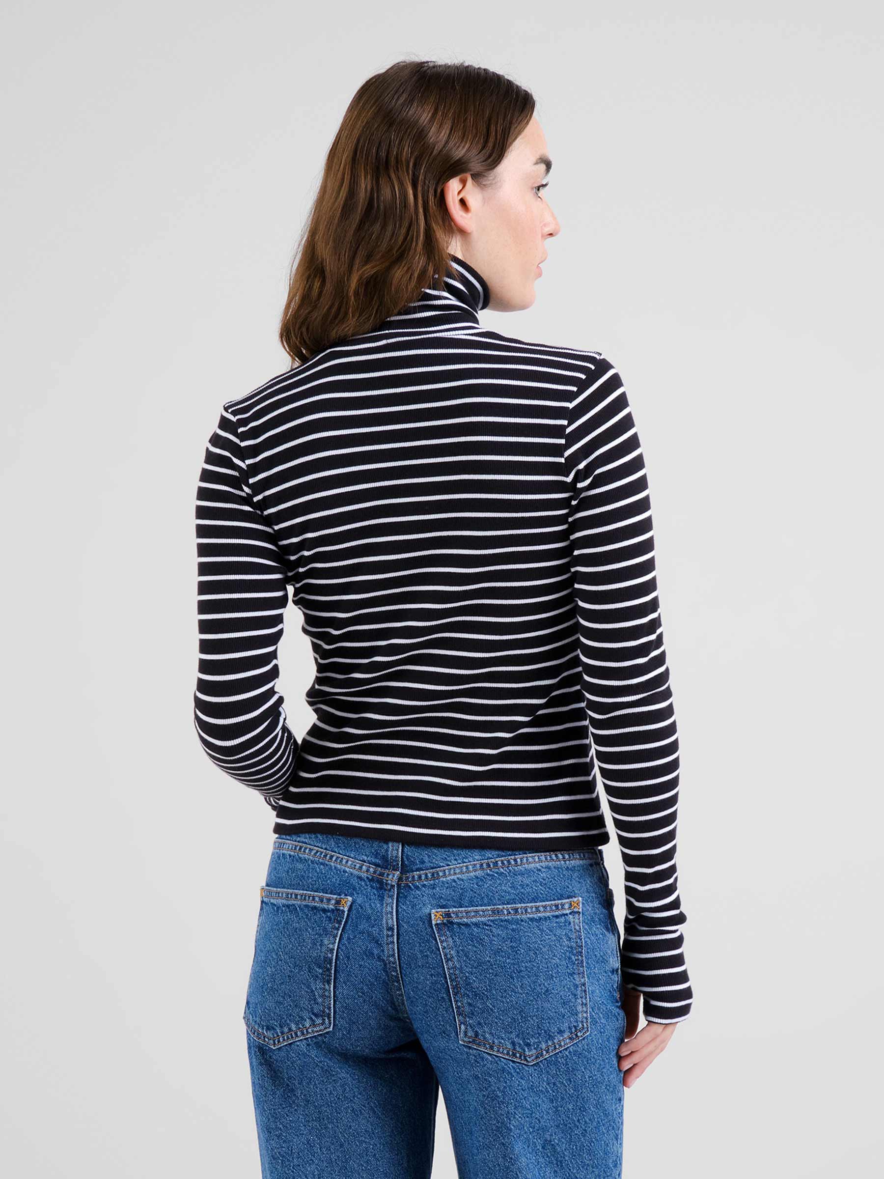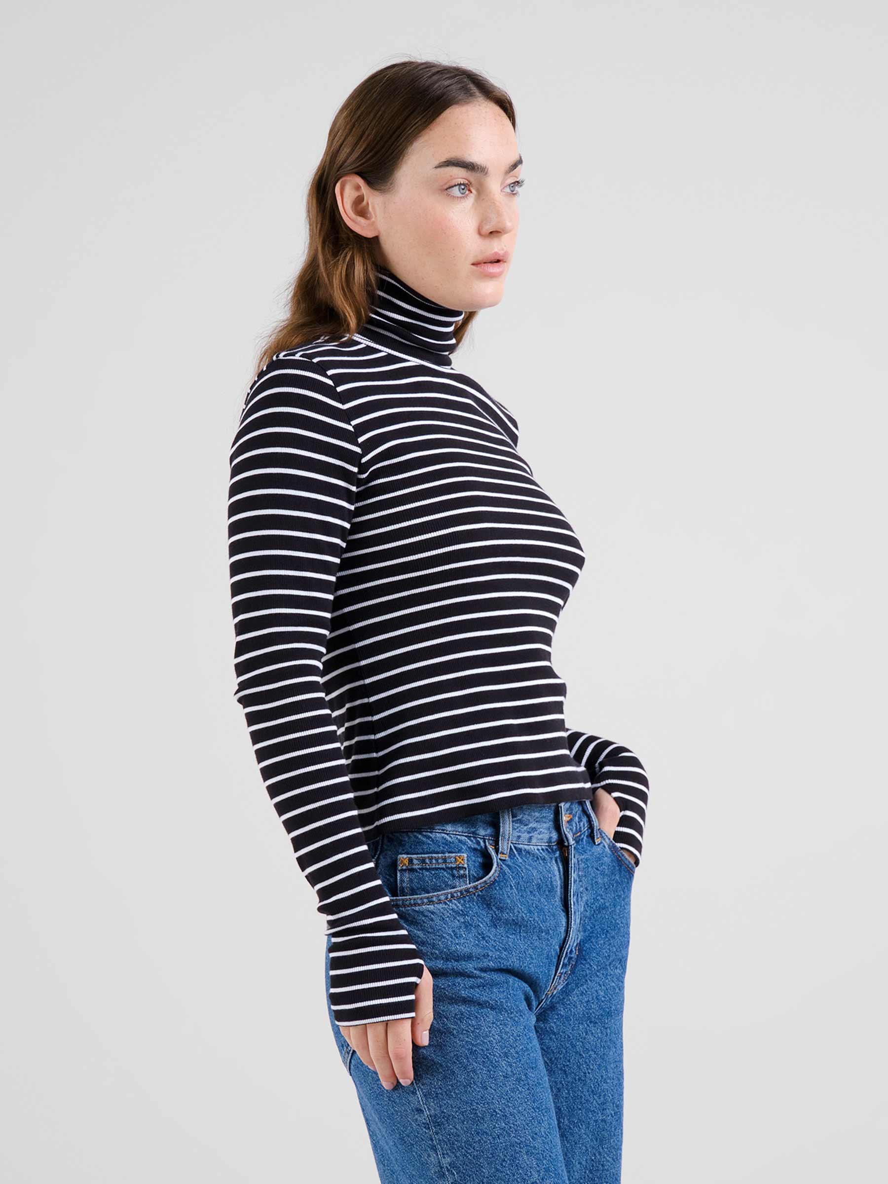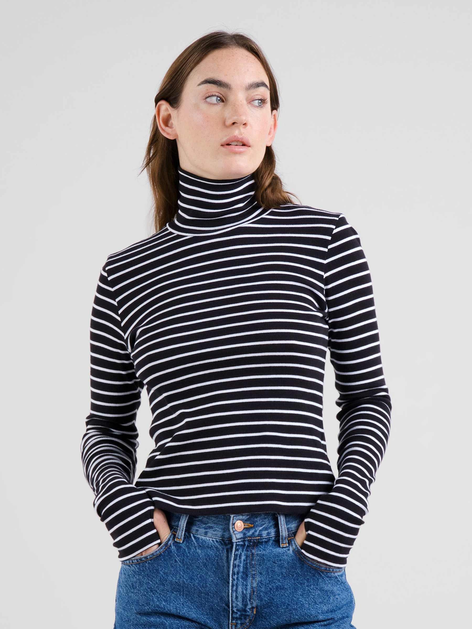 Deze zwart-wit gestreepte turtleneck van Dedicated is een tijdloze klassieker die je het hele jaar door kunt dragen. De zachte ribstof en aangesloten fit geven een comfortabele look die zowel casual als chic werkt. Combineer met jeans voor een relaxte outfit of draag onder een blazer voor een stijlvolle laag.