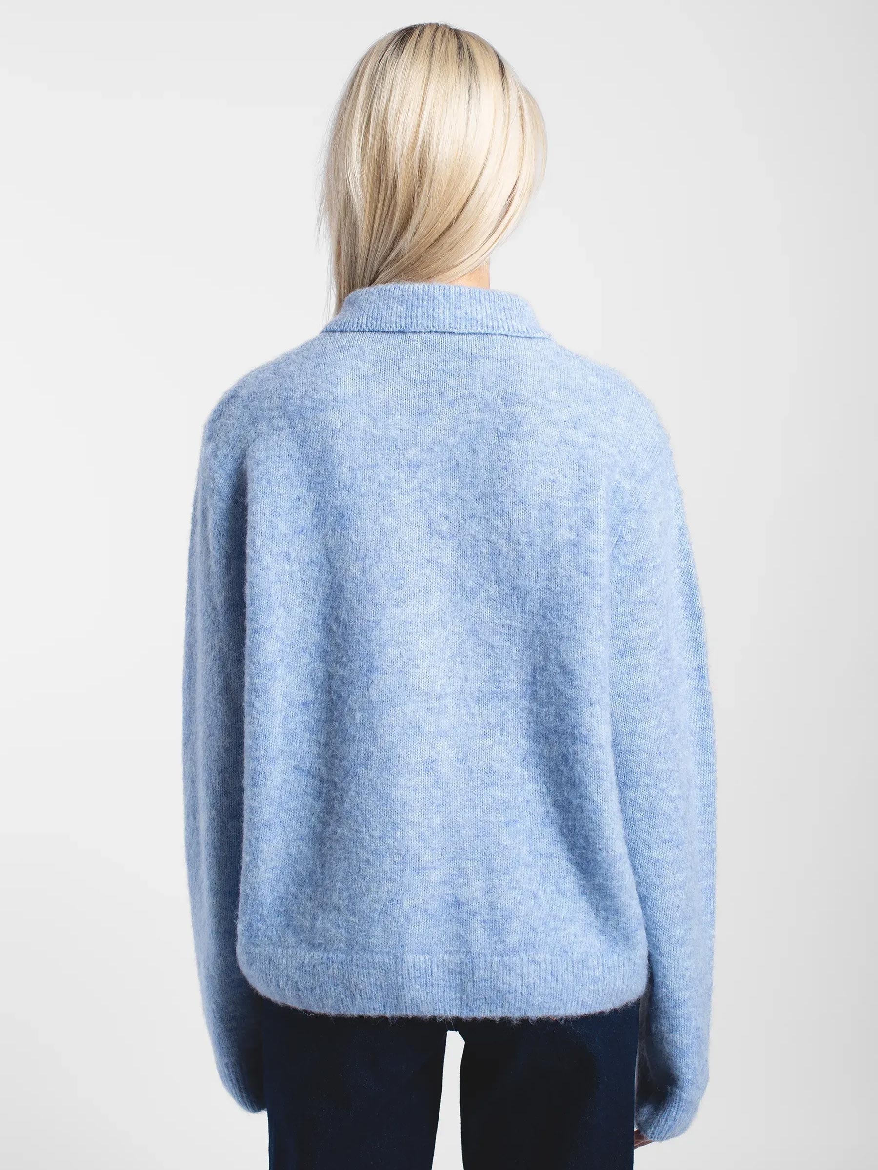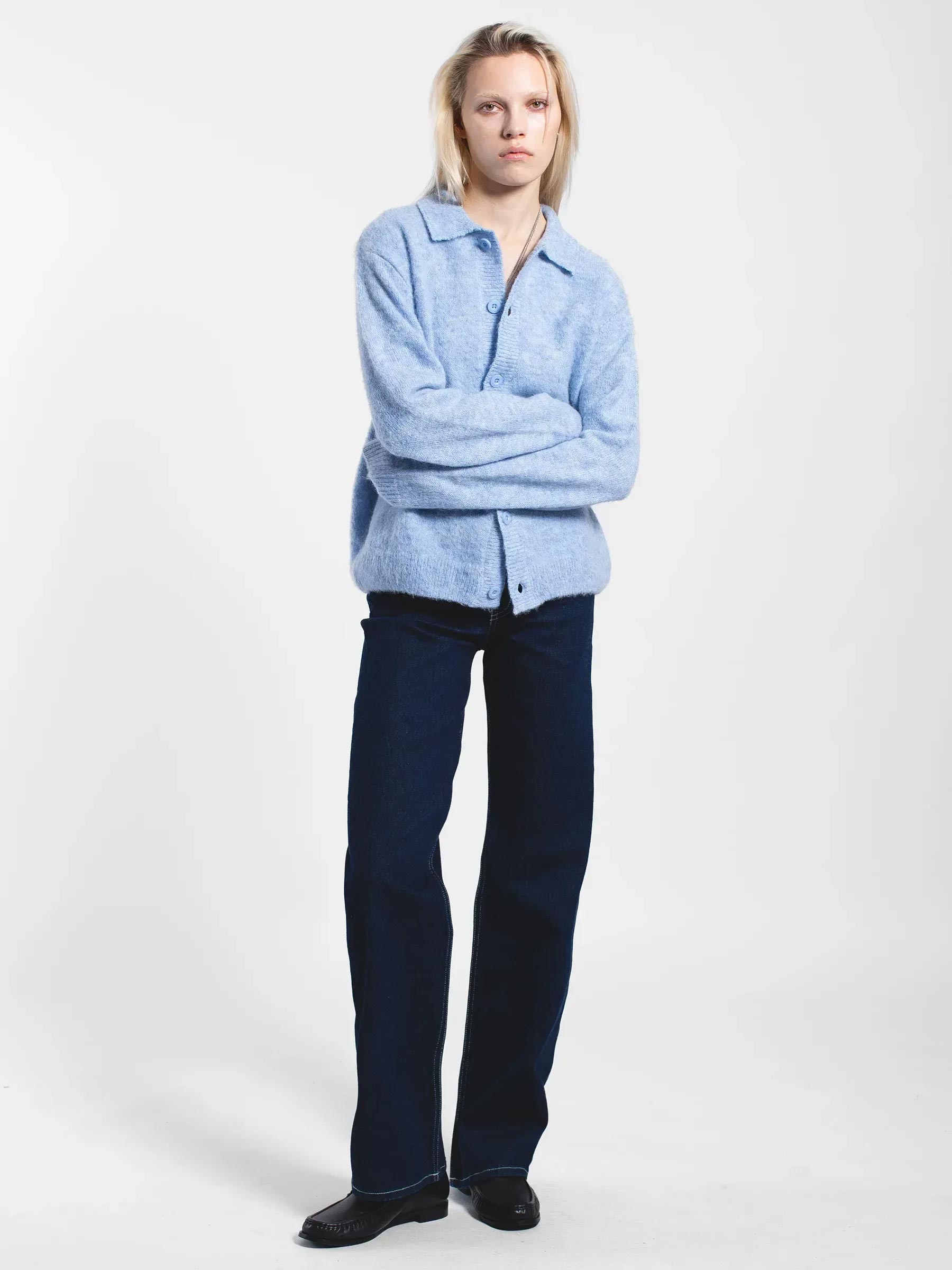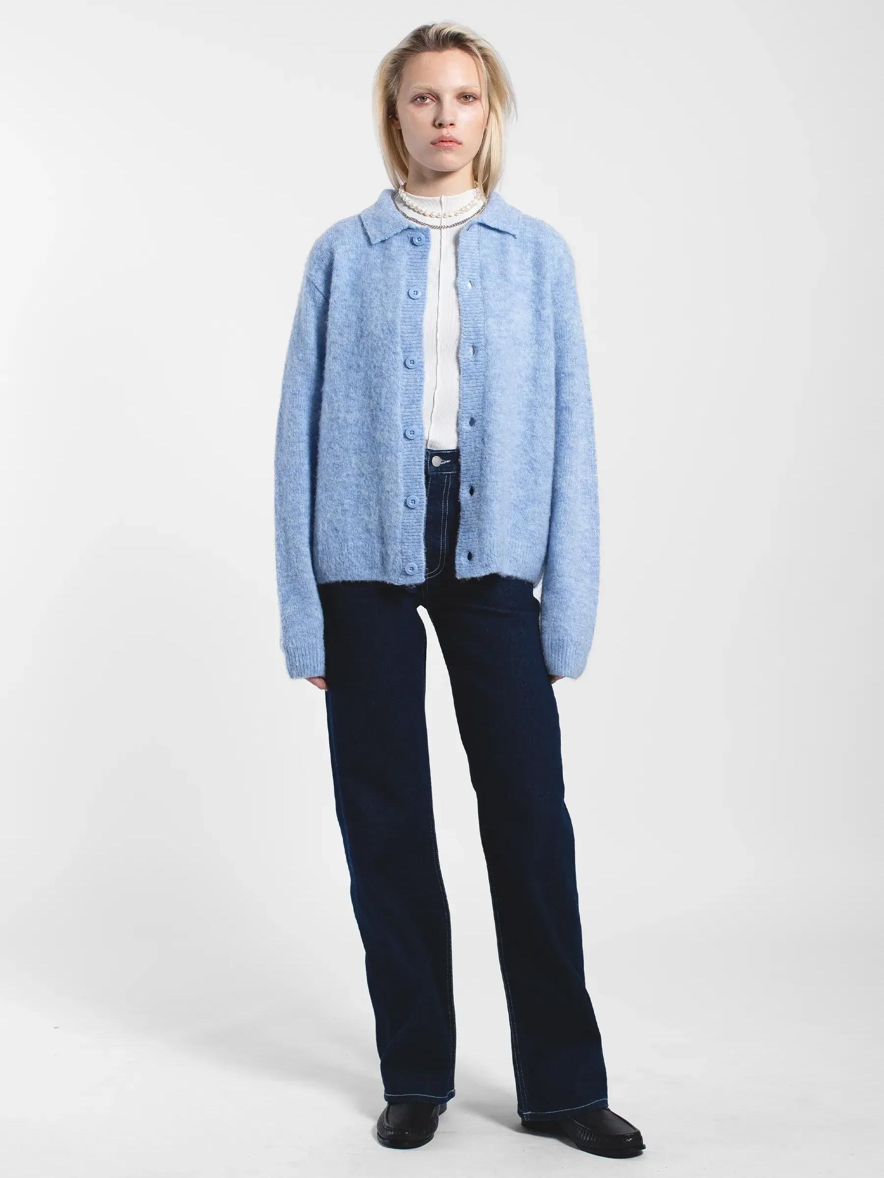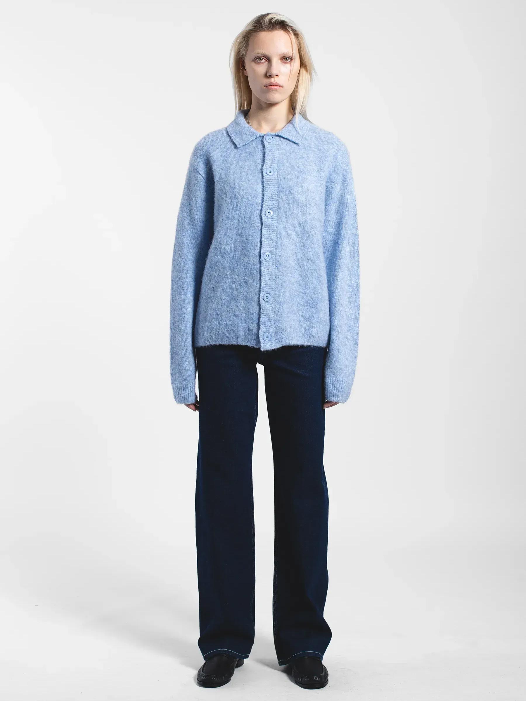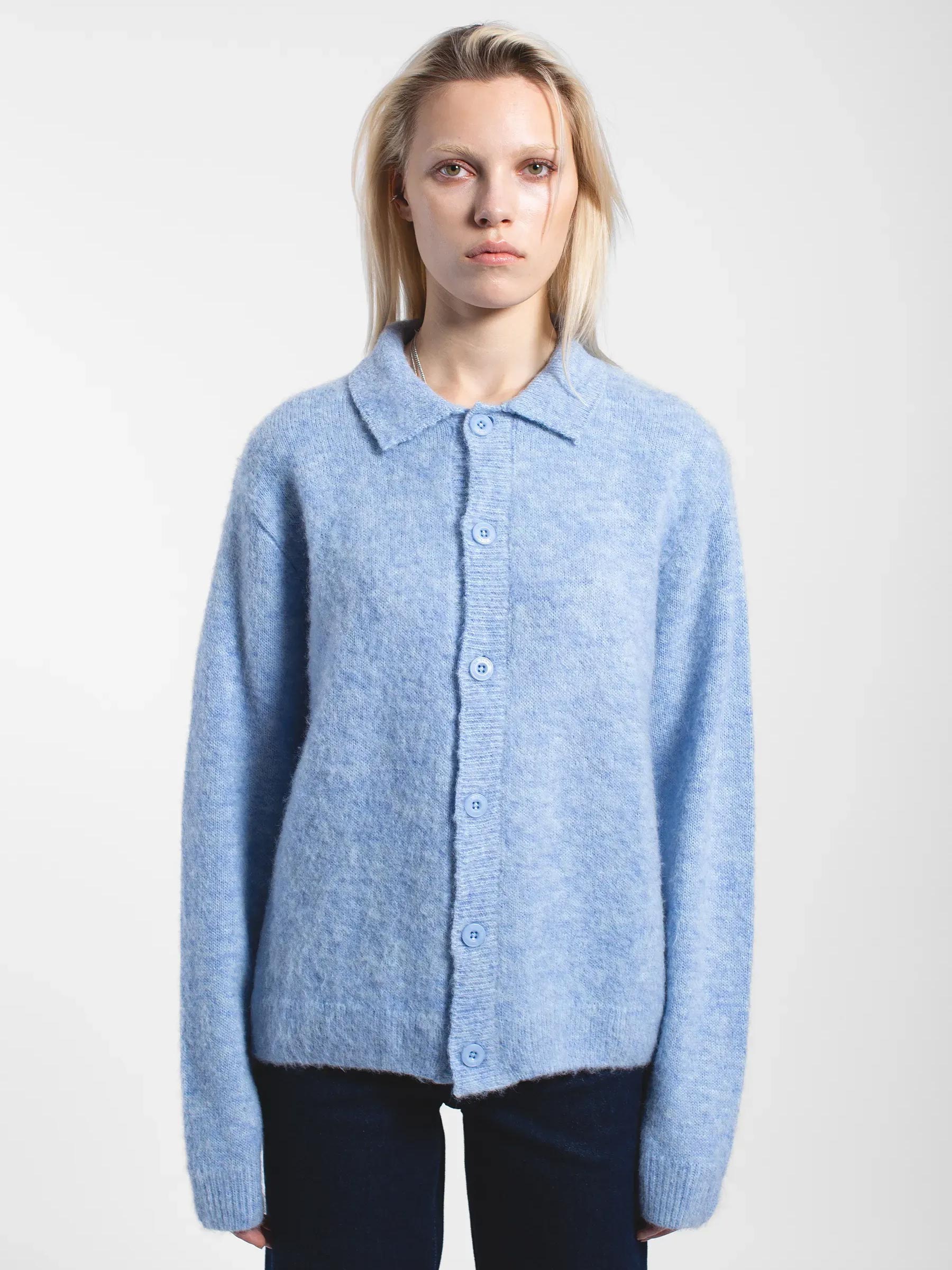 Dit lichtblauwe vest van Dr. Denim is zacht, warm en heeft die nonchalante look waar je meteen blij van wordt. De wollen blend zorgt voor een comfy feel, en de knoopsluiting en kraag geven ‘m een klassieke touch. Draag ‘m open over een basic top of dicht als trui, allebei even fijn.