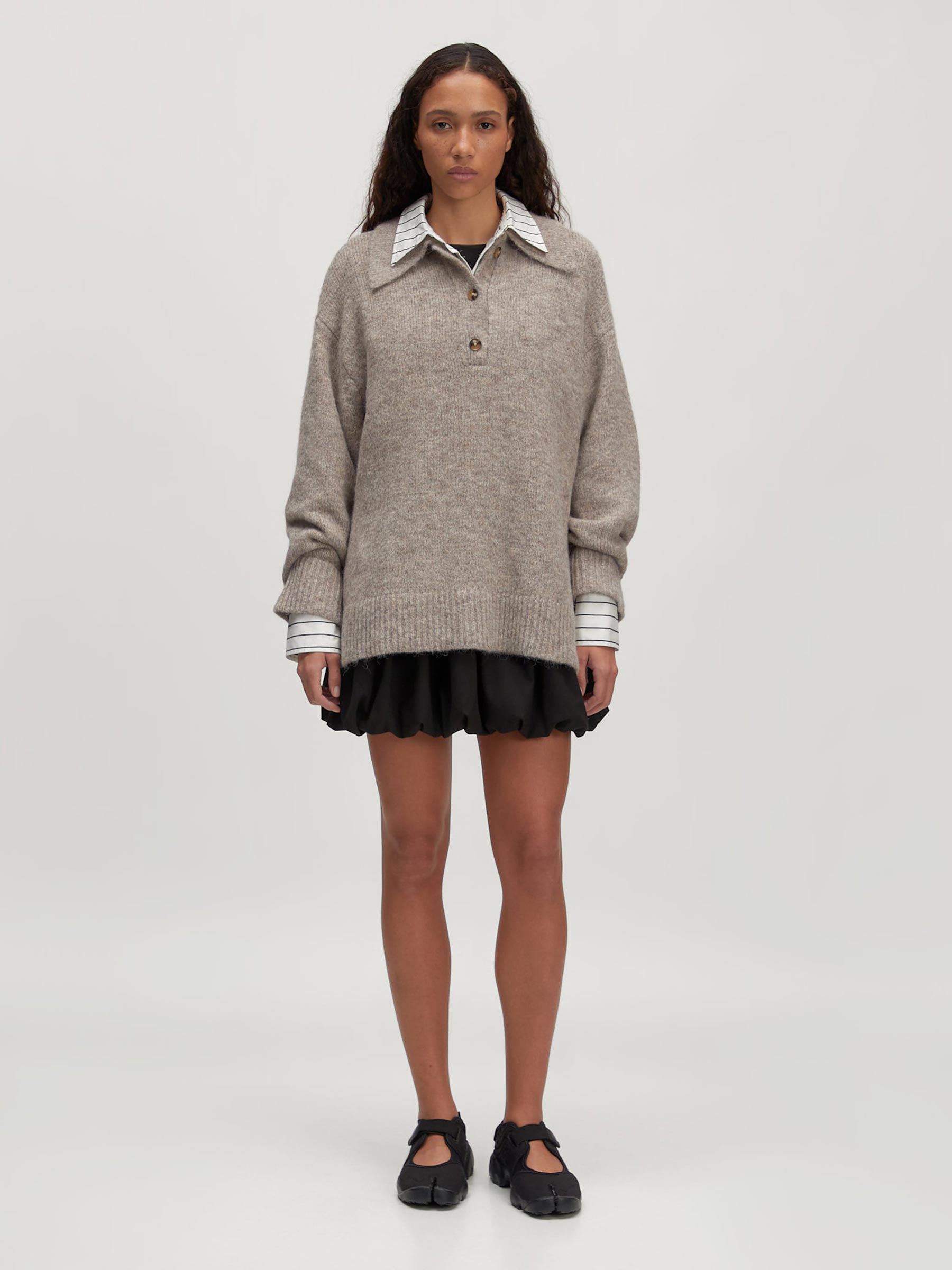 Deze taupekleurige trui van Co’Couture is zo’n item waar je in wilt wonen. De losse pasvorm en brede kraag geven een relaxed gevoel, terwijl de knoopsluiting zorgt voor net dat beetje extra. Perfect over een blouse of met een rok voor een zachte, cozy look.