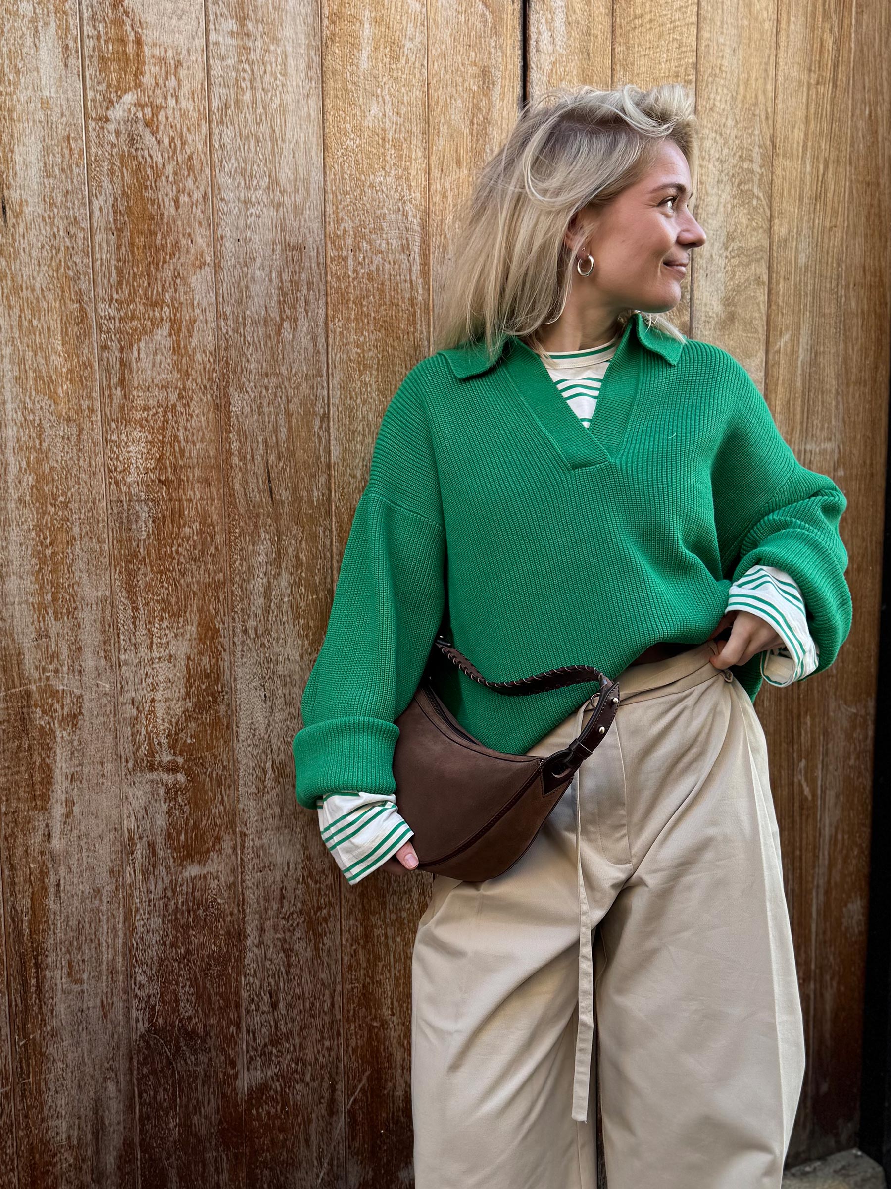 Layer de Taria over een gestreept shirt en laat de mouwen en kraag zichtbaar. Combineer met een beige pantalon of wide leg jeans en zilveren sneakers voor een look die kleur en rust mooi in balans houdt.