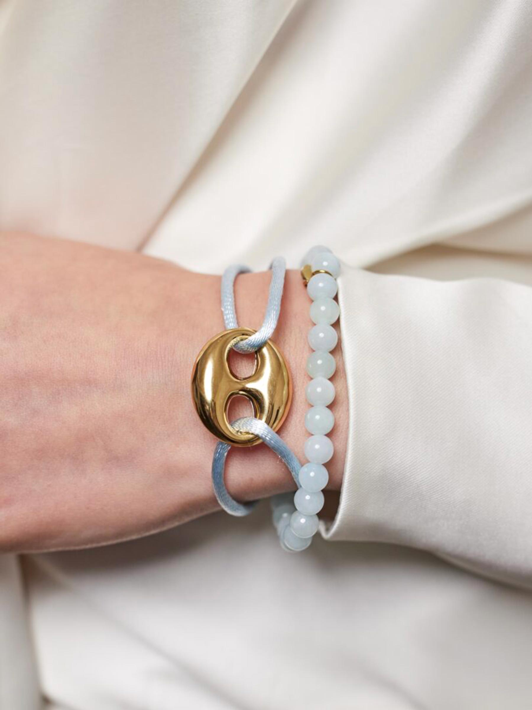 Het lichtblauwe gemstone armbandje van Ellen Beekmans is zo'n stukje sieraad dat je eigenlijk altijd om kan. De zachte, bijna doorschijnende blauwe steentjes geven het een rustige, frisse uitstraling die zowel op vakantie als op kantoor werkt. Sinds 2010 maakt Ellen Beekmans sieraden die opvallen door kleur en vrouwelijkheid, dit armbandje is daar een mooi voorbeeld van.