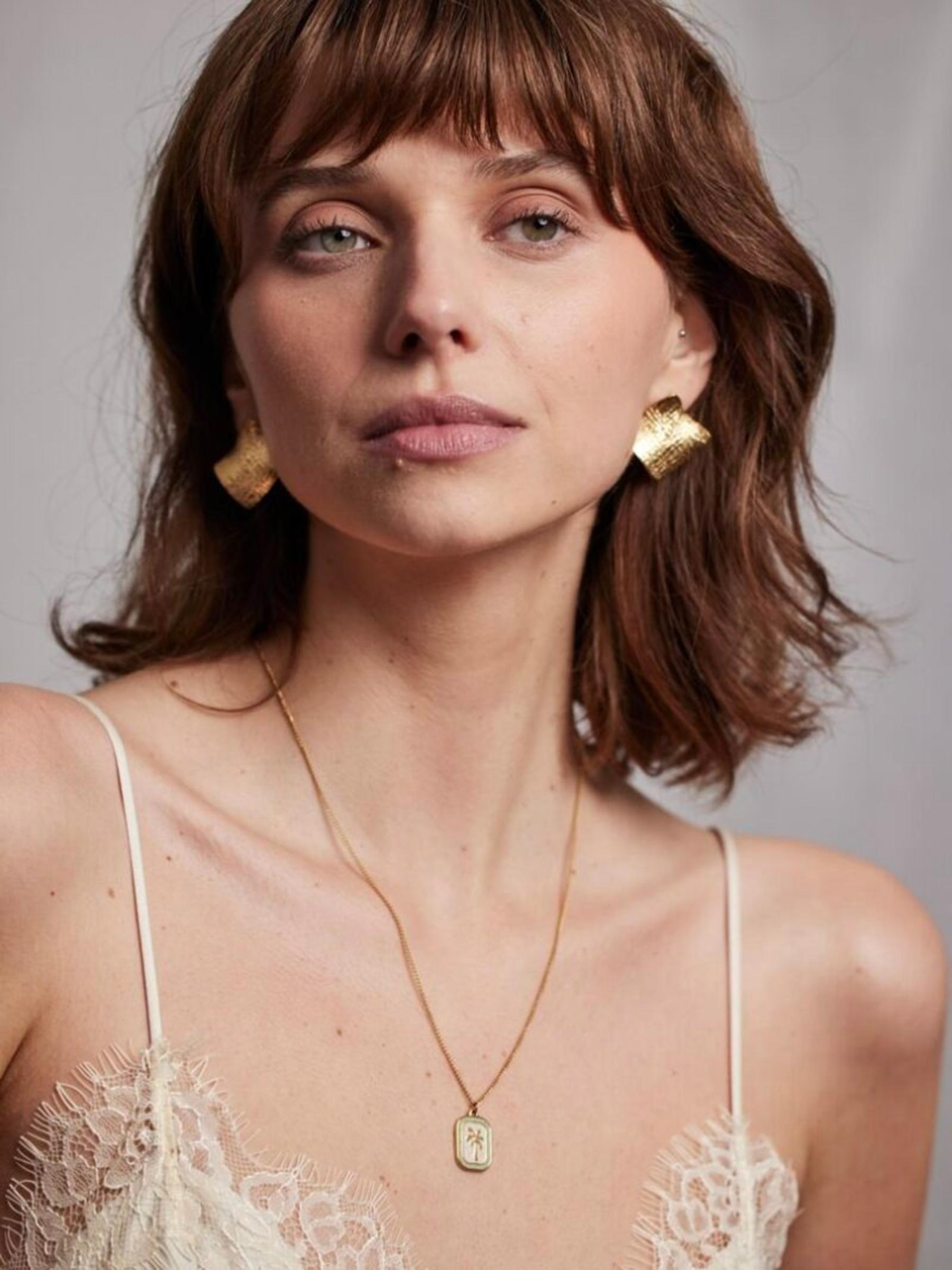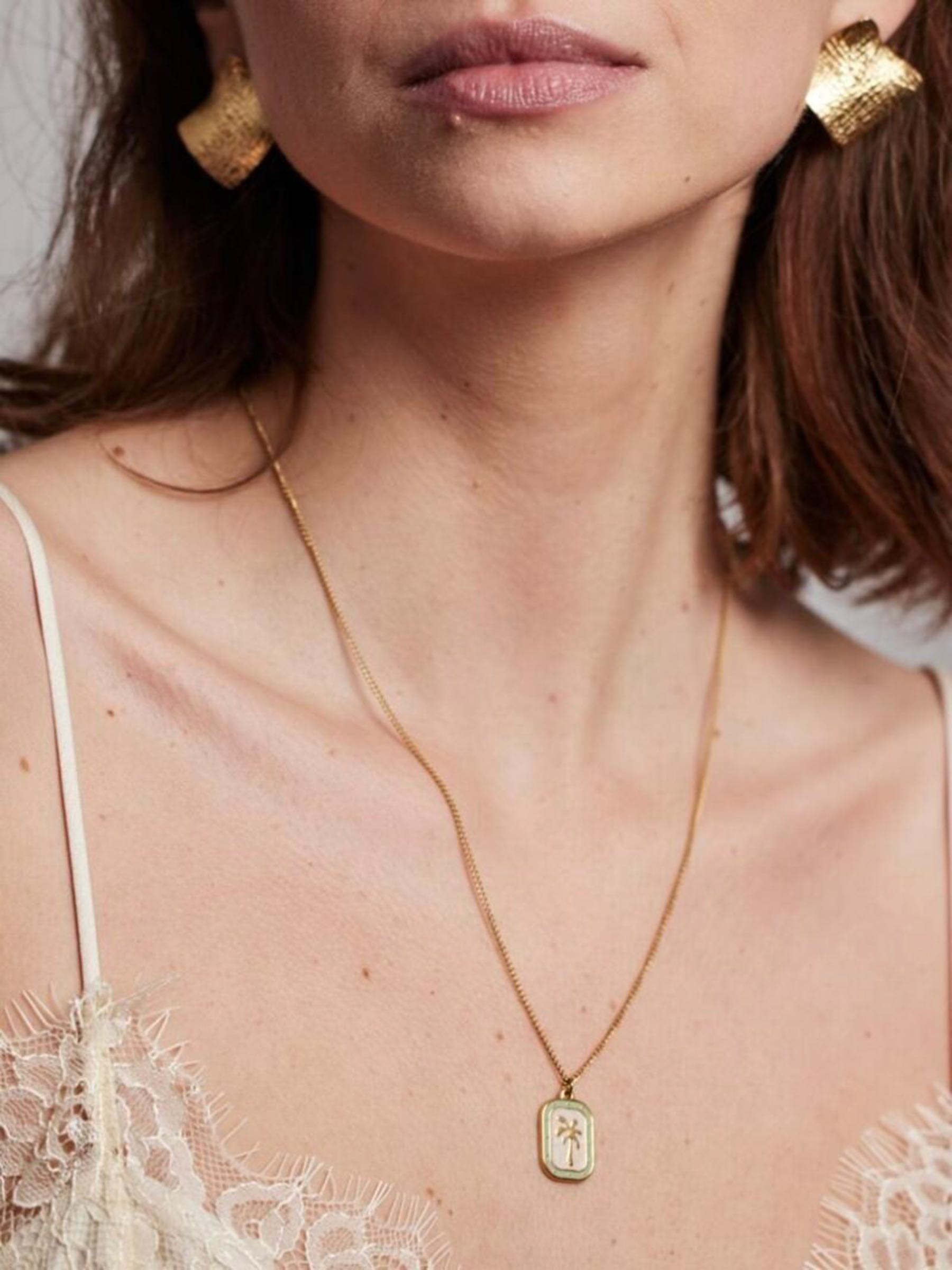 De ketting met palm hanger van Ellen Beekmans heeft een speelse rechthoekige hanger met een palmboom in zachte groene en roze pasteltinten. Het is precies zo'n stuk dat je de hele zomer aan wil houden. Ellen Beekmans maakt haar sieraden in een eigen atelier in Hilversum en combineert originele details met goede kwaliteit.
