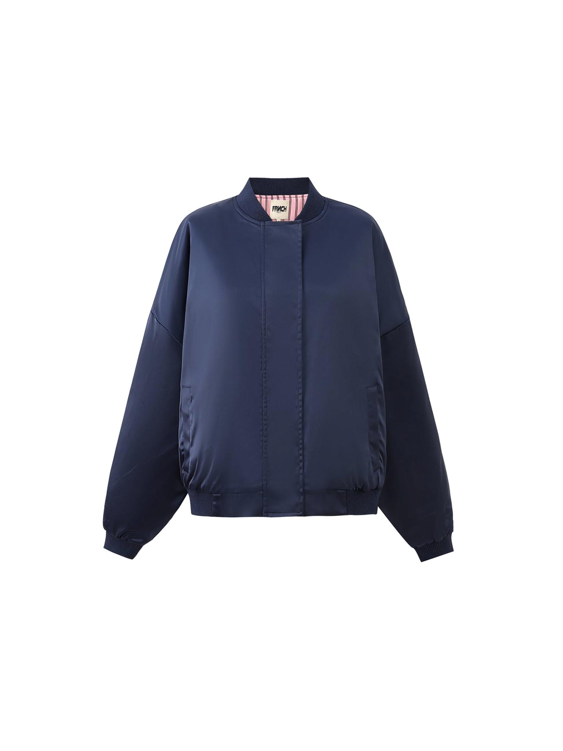 Dit blauwe bomberjack van FRNCH geeft elke outfit een stoere, moderne touch. De glanzende satijnlook en relaxed fit maken hem perfect voor een casual dag of als contrast op een vrouwelijke look. Draag over een jumpsuit of jeans met trui om je outfit compleet te maken.