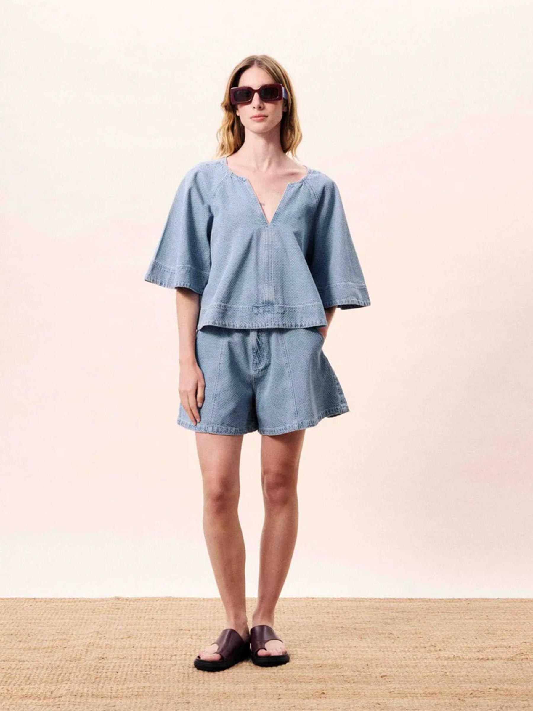 Draag deze blouse op de bijpassende denim short voor een complete set, of combineer hem met een witte linnen broek voor een rustiger contrast. Maak je outfit af met een paar sandalen en een zonnebril voor die ultieme vakantie-vibe.