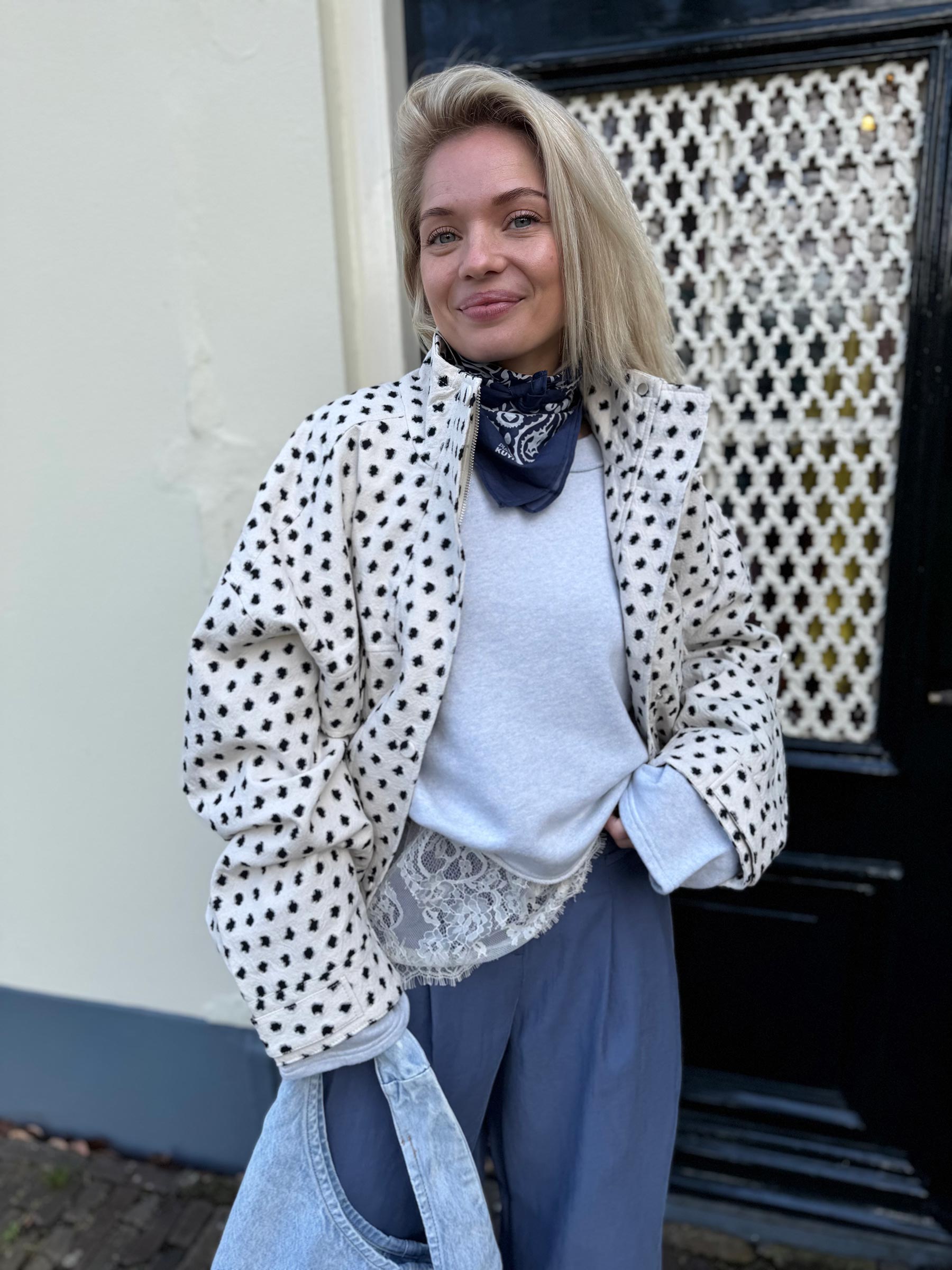 Het crème jasje Neree van Frnch is het perfect voor de lent!. Het zwarte geometrische patroon op de ecru achtergrond is hetzelfde als op de bijpassende Isolde broek, waardoor je er moeiteloos een complete set van maakt. Frnch, het Parijse merk dat speelse prints en draagbaar design combineert.