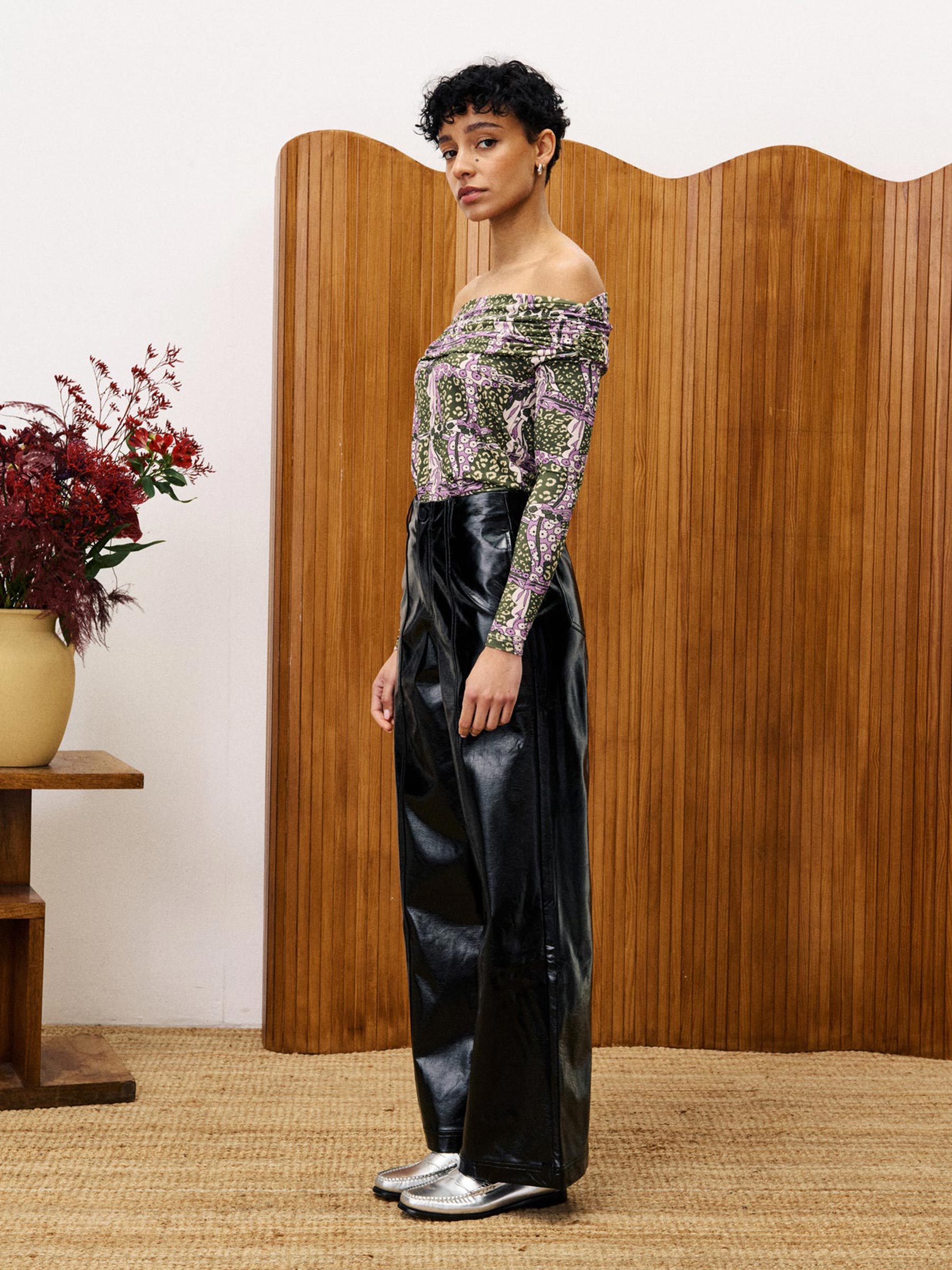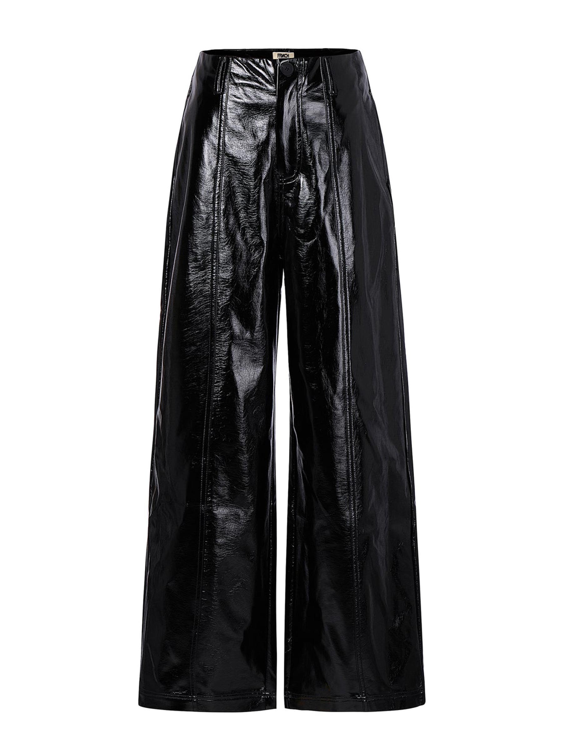 Deze zwarte lakbroek van FRNCH is gemaakt om te shinen. De high waist en wijde pijpen geven ‘m een krachtige uitstraling, terwijl het glanzende materiaal zorgt voor die edgy city vibe. Combineer met een knit of juist een strak topje voor een spannende mix van texturen.