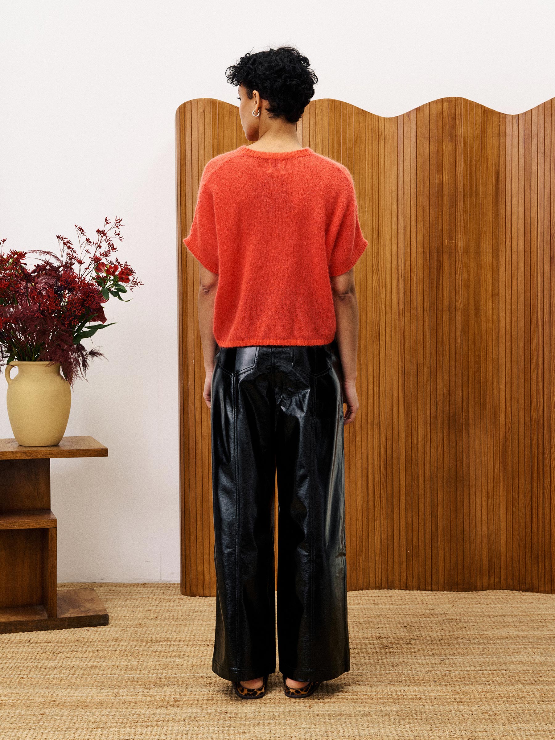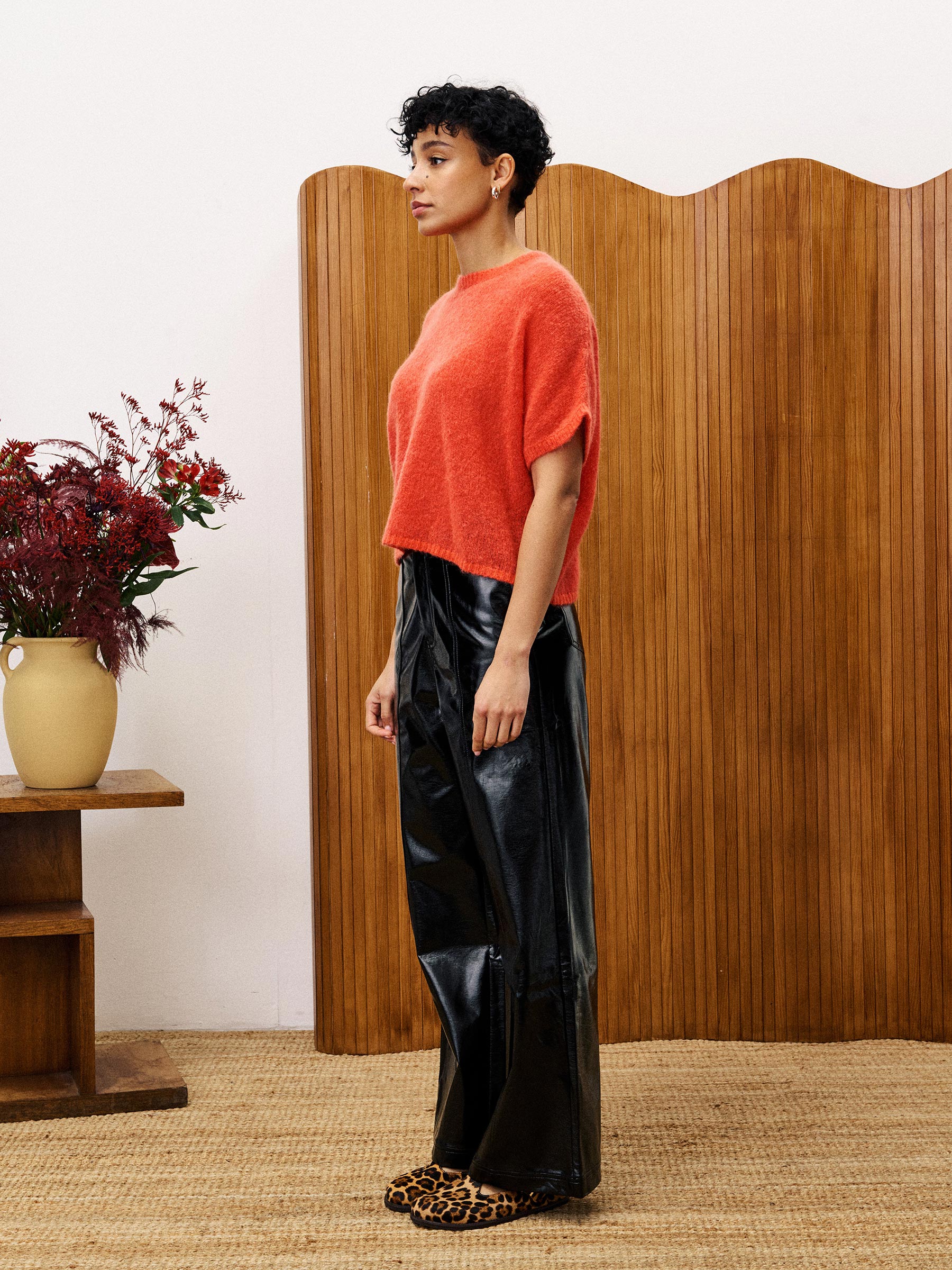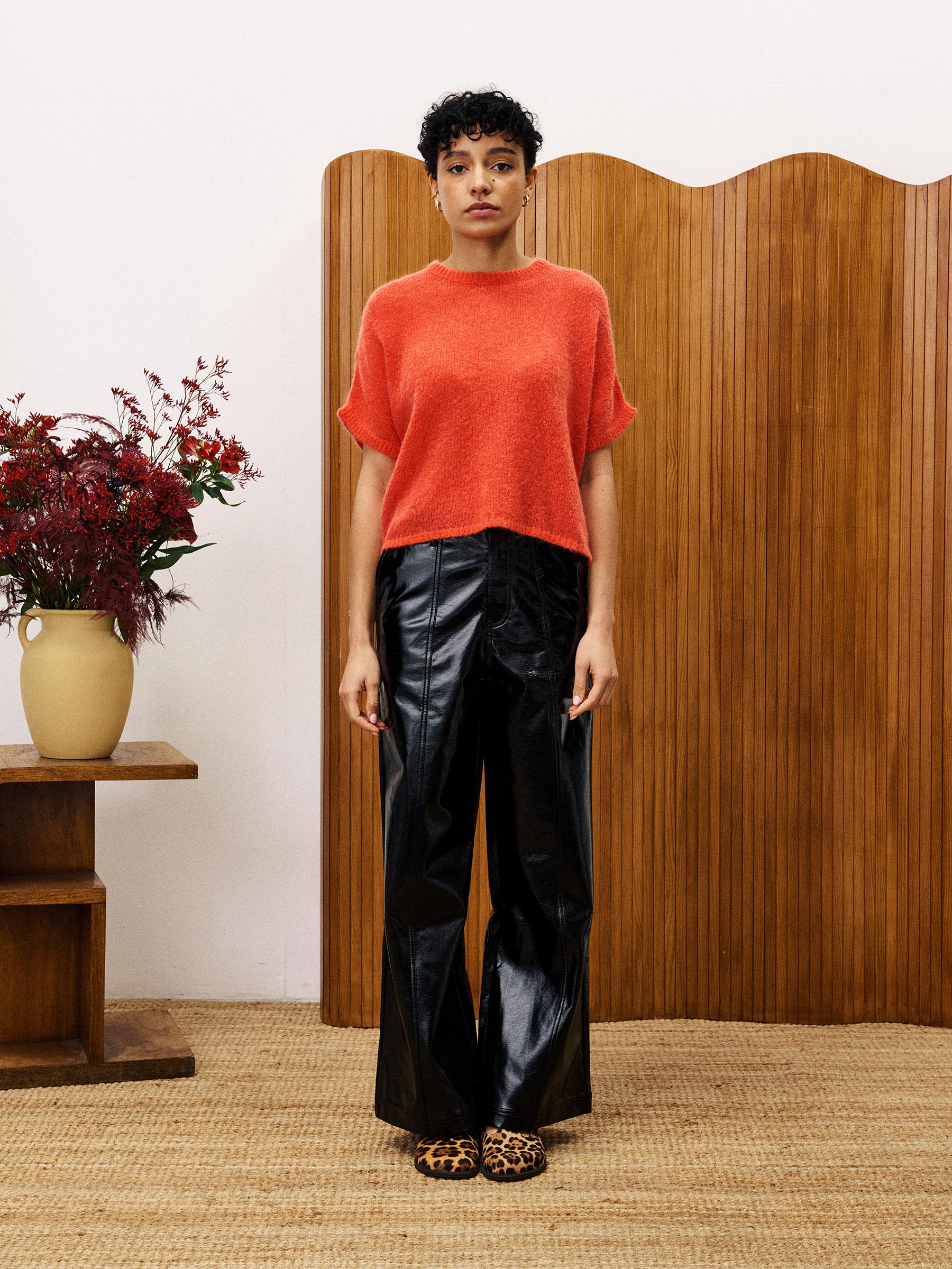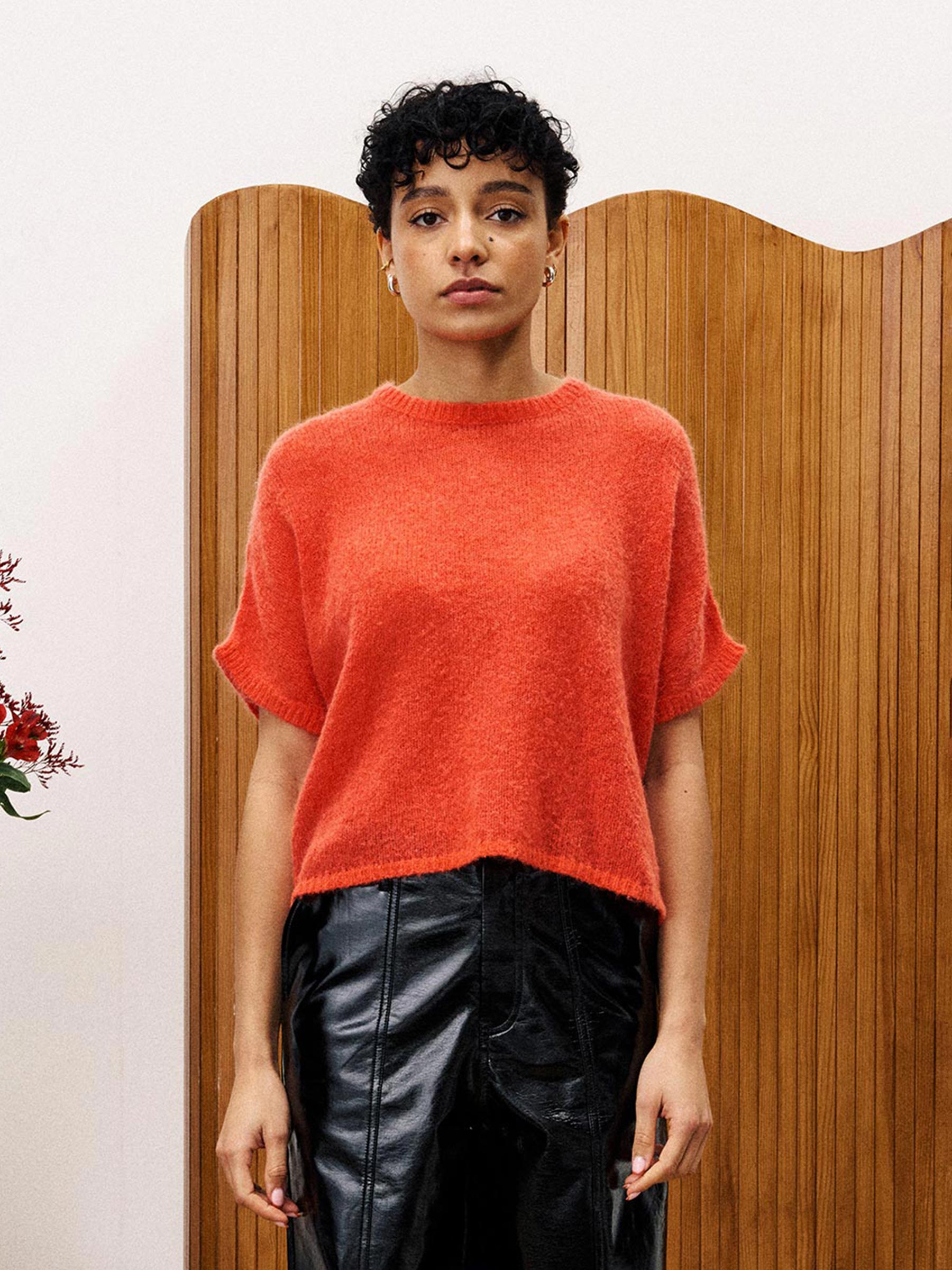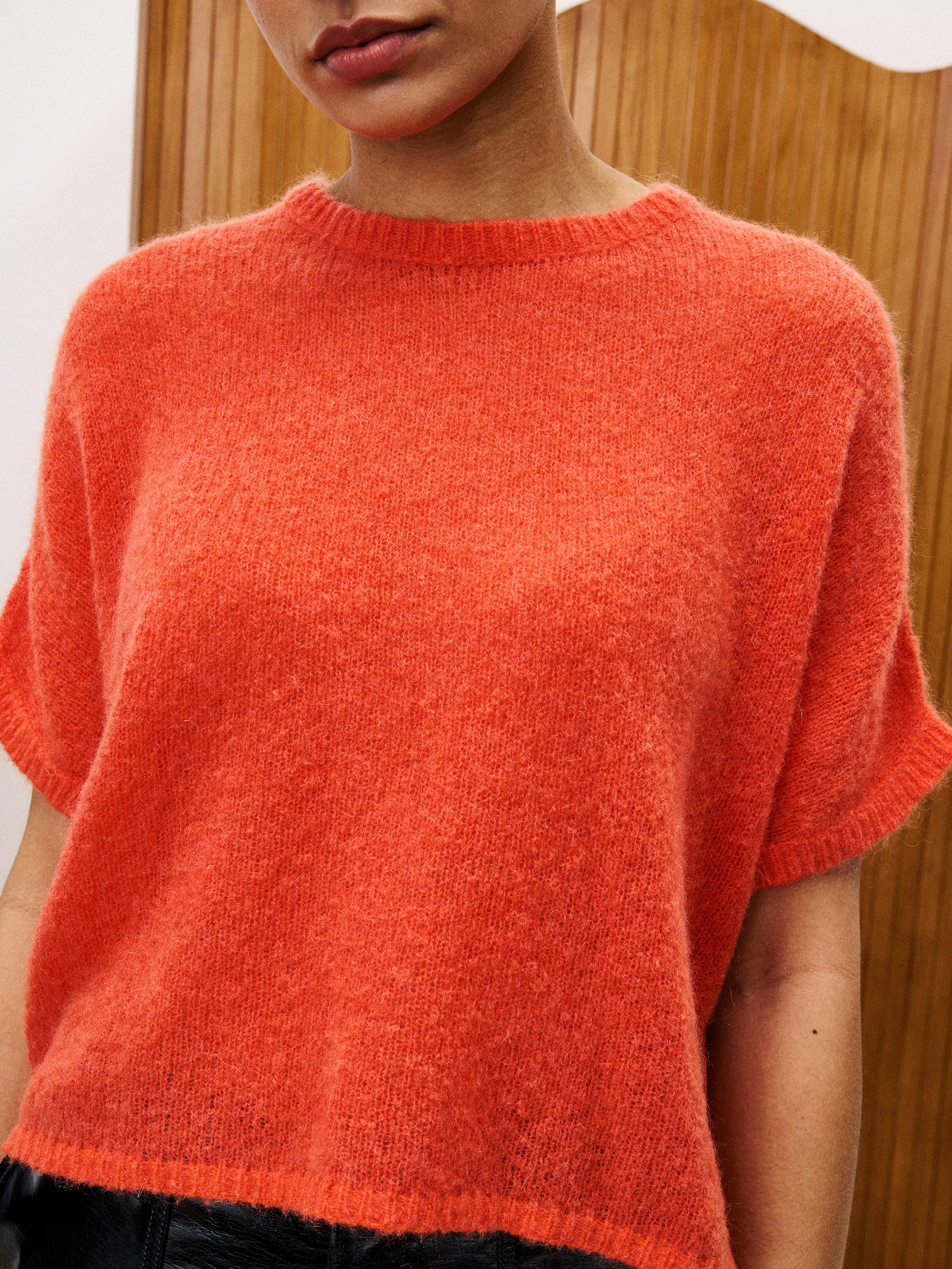 Deze oranje trui van FRNCH heeft korte mouwen en een boxy fit die zorgt voor een frisse, eigentijdse look. De zachte wolmix voelt comfortabel aan en maakt dit item ideaal om te dragen in het tussenseizoen of als kleurrijke laag in je outfit.