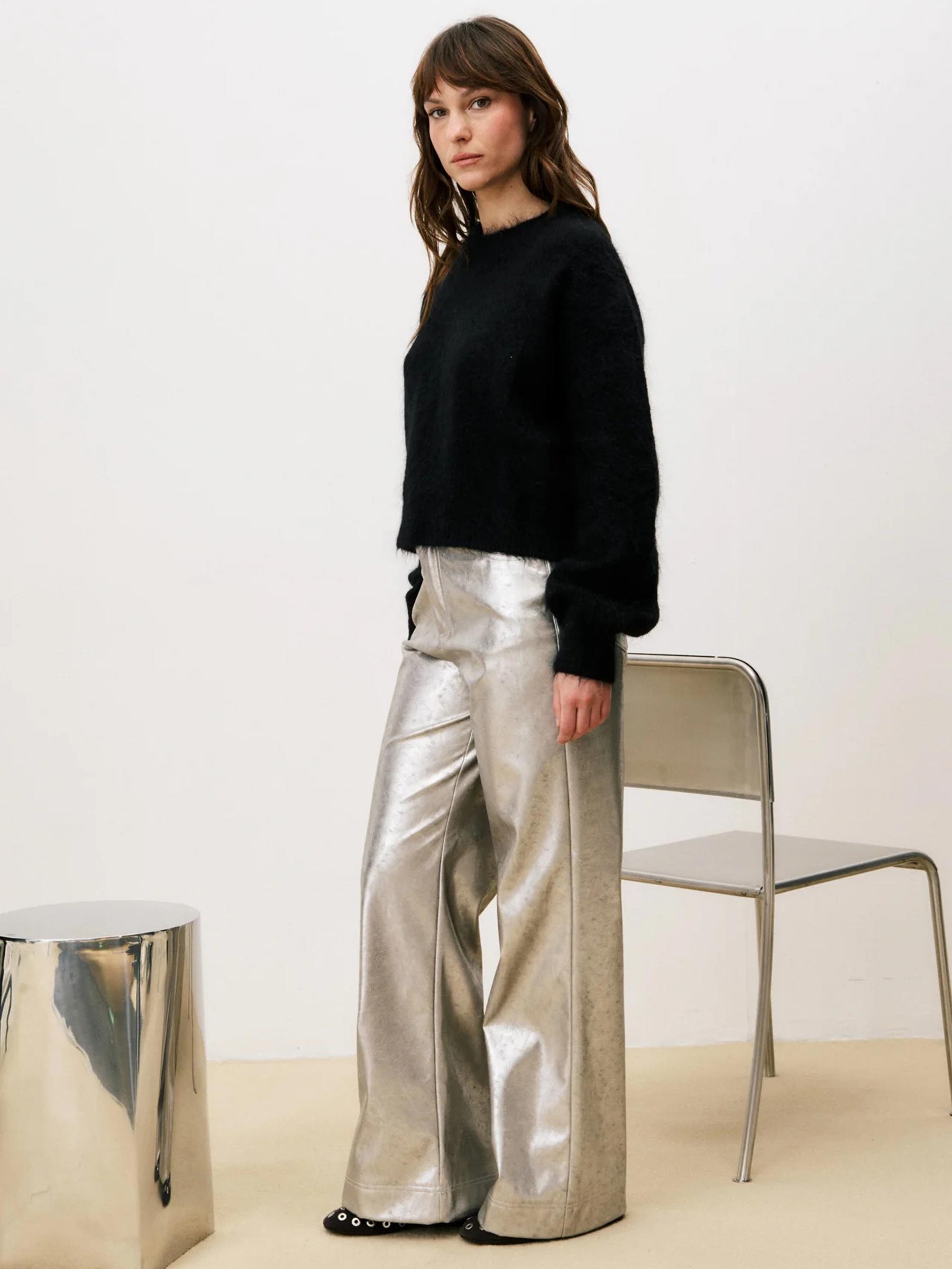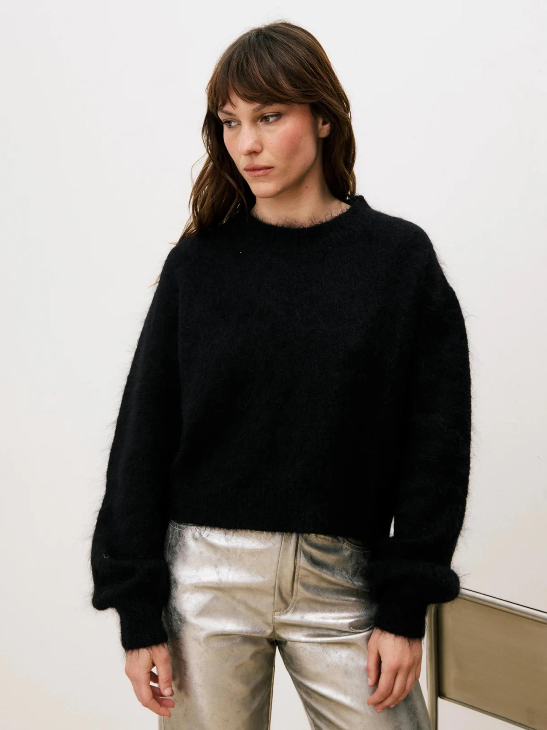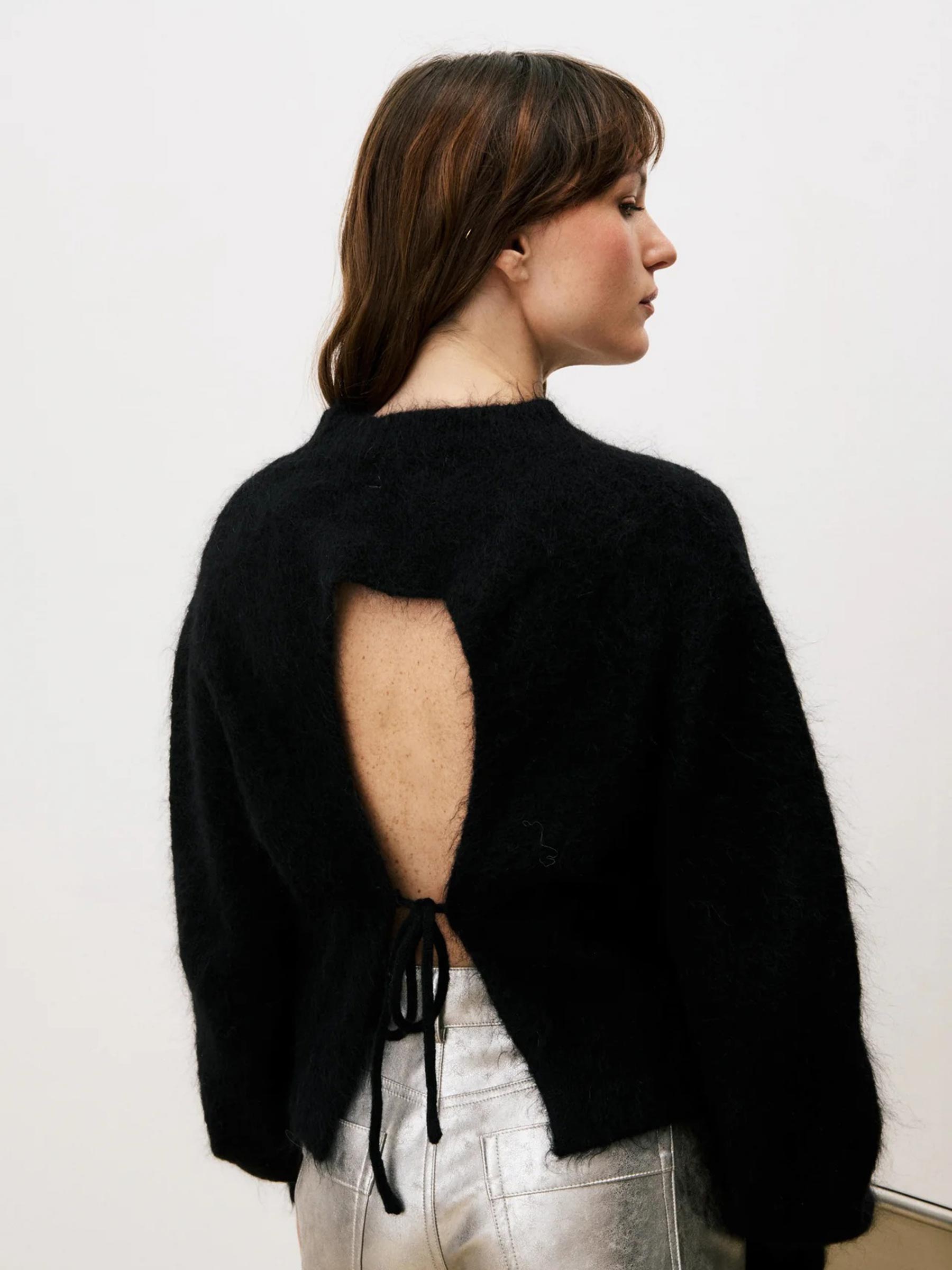 Deze zwarte trui van FRNCH is zacht, warm en heeft een bijzondere detail met open rug. De losse pasvorm en fluffy textuur maken hem ideaal voor cozy dagen en feestelijke avonden. Combineer met deze zilveren broek uit de collectie.