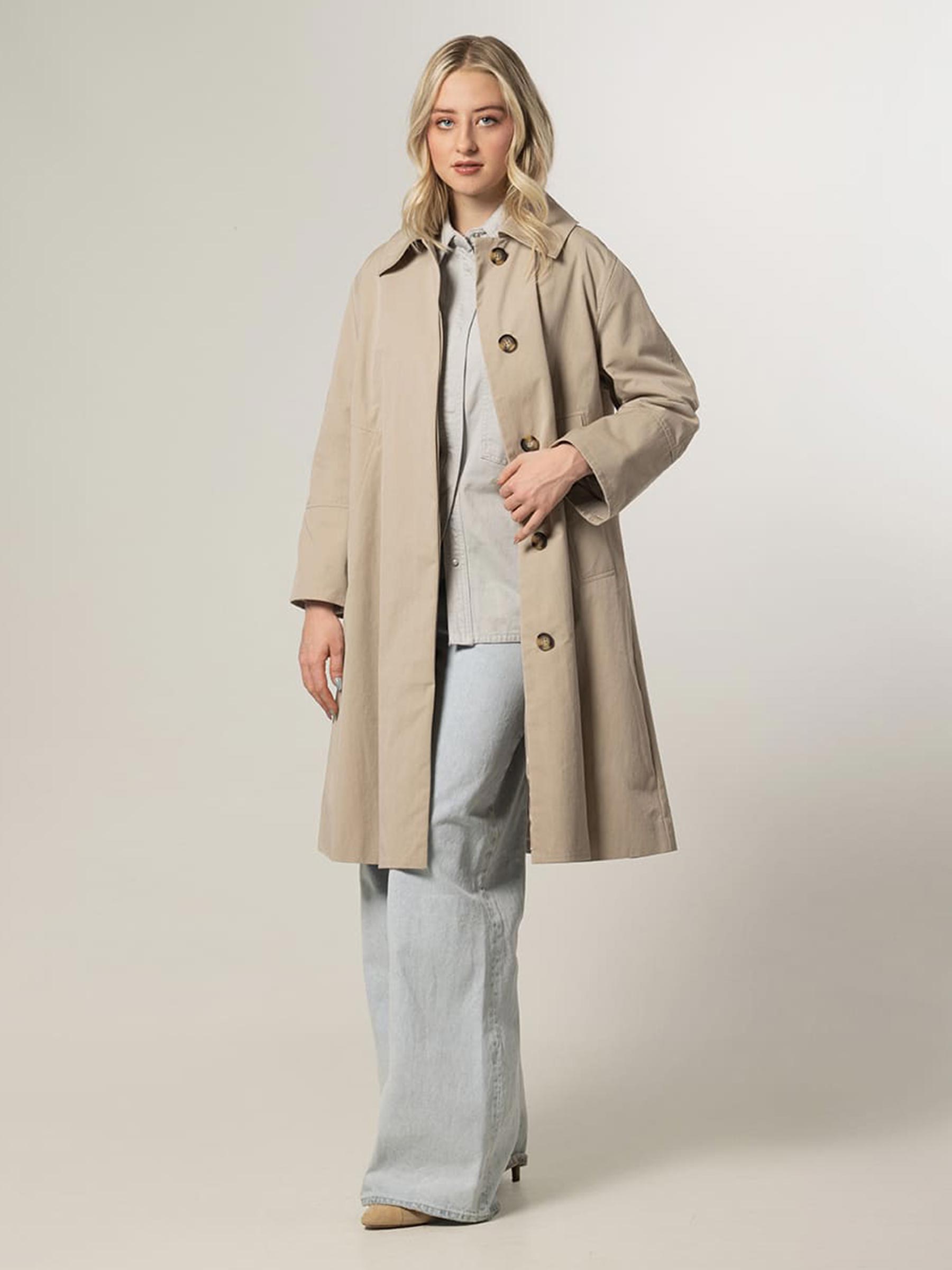 Deze prachtige beige jas van Giacomo is een echte mooie basic. De micro twill stof valt mooi, heeft een lichte glans en beweegt soepel, precies wat je wil bij een zomerjas. De staande kraag en de subtiele A-lijn geven hem een tijdloze uitstraling die overal bij past.