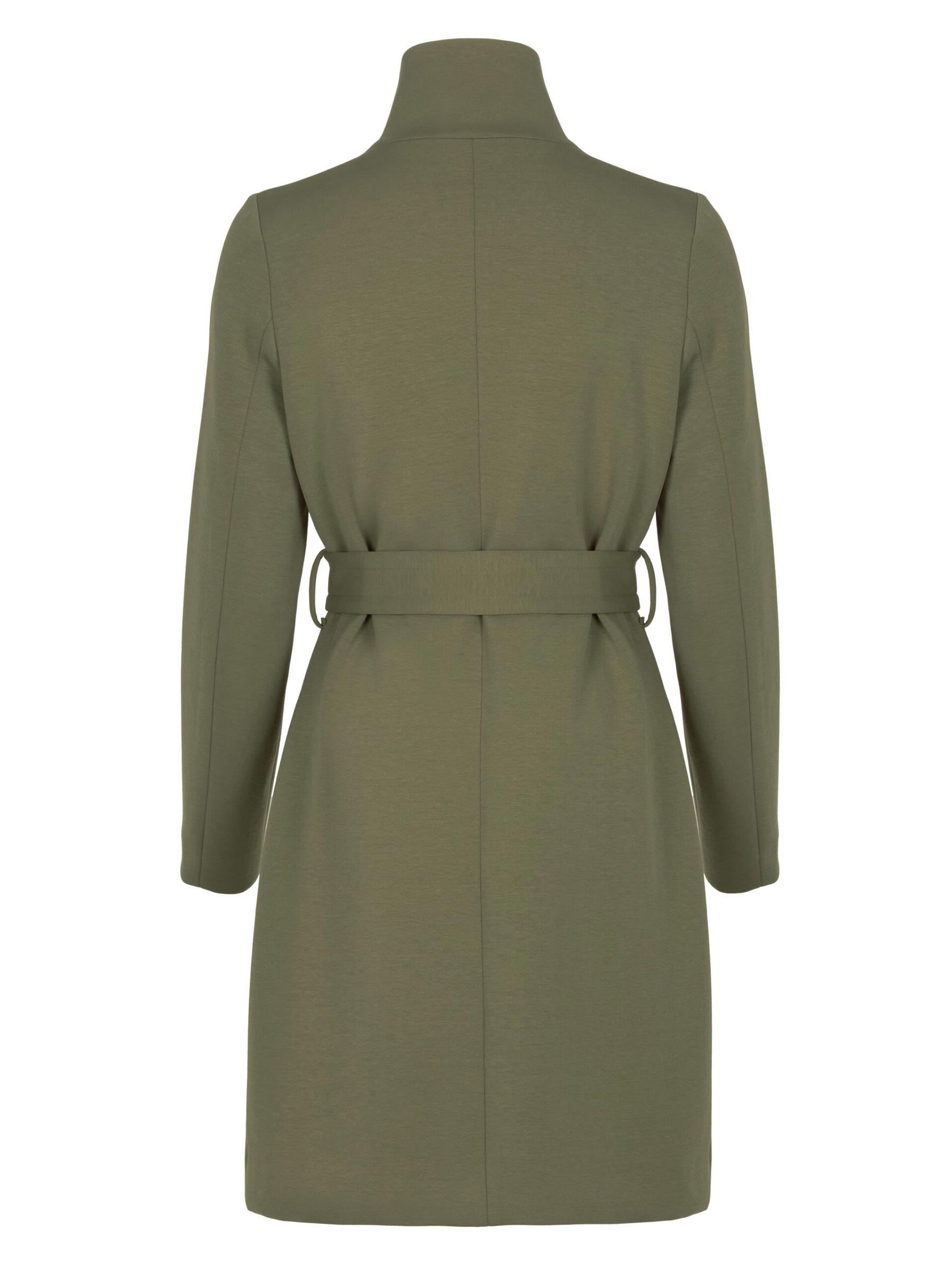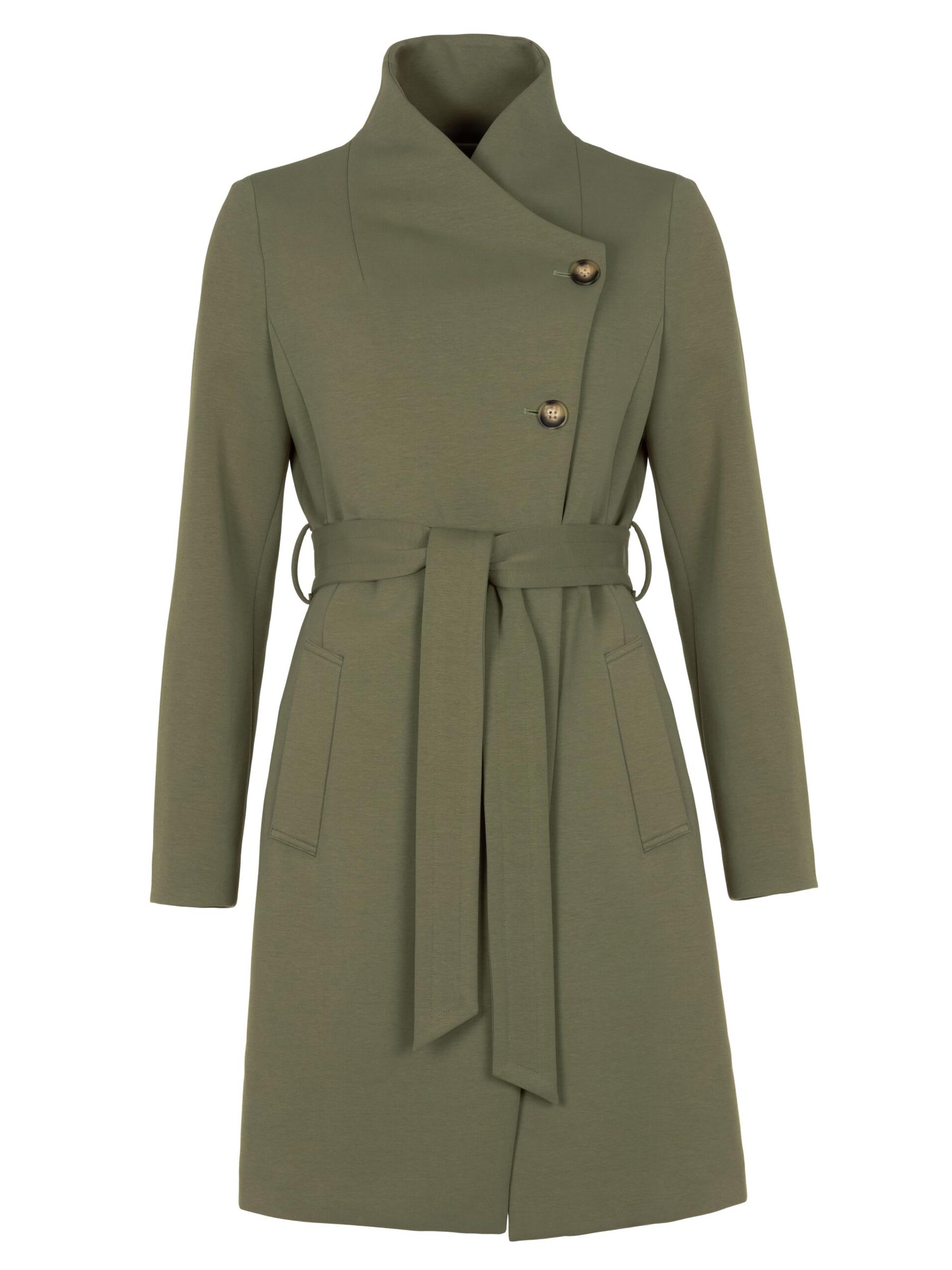 Deze groene jas van Giacomo is zo'n jas die je meteen herkent als goed gemaakt: de brede revers, de overlappende sluiting en de bijpassende ceintuur geven hem een tijdloze, tailored uitstraling. De bonded jersey stof valt soepel en beweegt mee, zonder dat hij kreukelt of zijn vorm verliest.