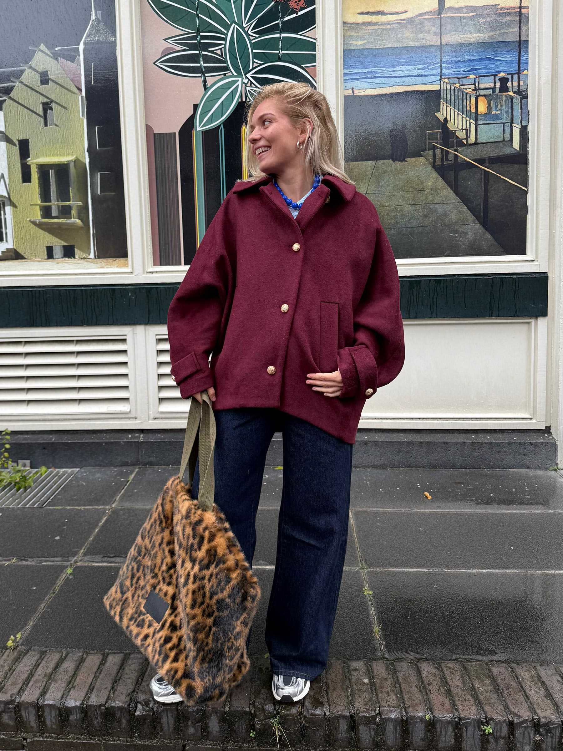 Deze bordeauxrode jas van het merk Giacomo the Jacket is een echte eyecatcher voor het nieuwe seizoen. Met de goudkleurige knopen en de subtiele manchetbanden krijgt je look meteen een luxe upgrade. Perfect om zowel casual als wat chiquer te dragen.
