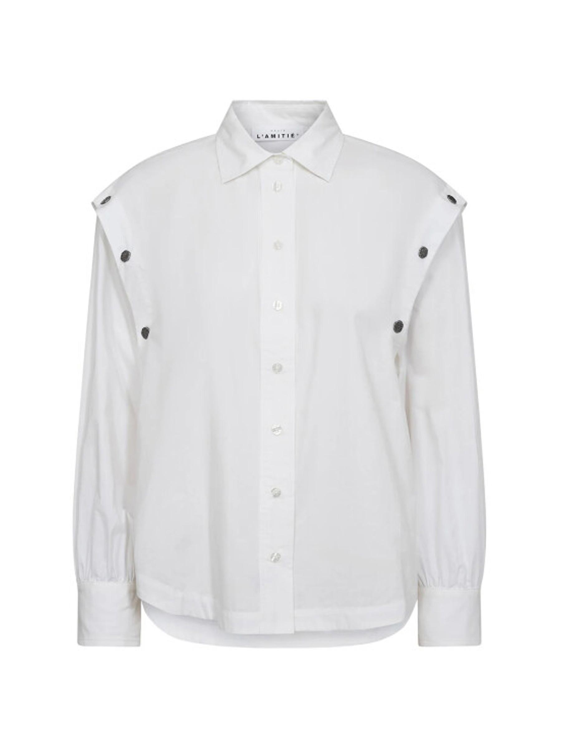 Deze witte blouse van Haute L’Amitié is een echte statement piece. Dankzij de afneembare mouwen verander je hem moeiteloos van blouse naar top, ideaal voor dagen waarop je look met je mee mag bewegen. De knoopdetails geven een moderne, stoere touch aan deze tijdloze klassieker.