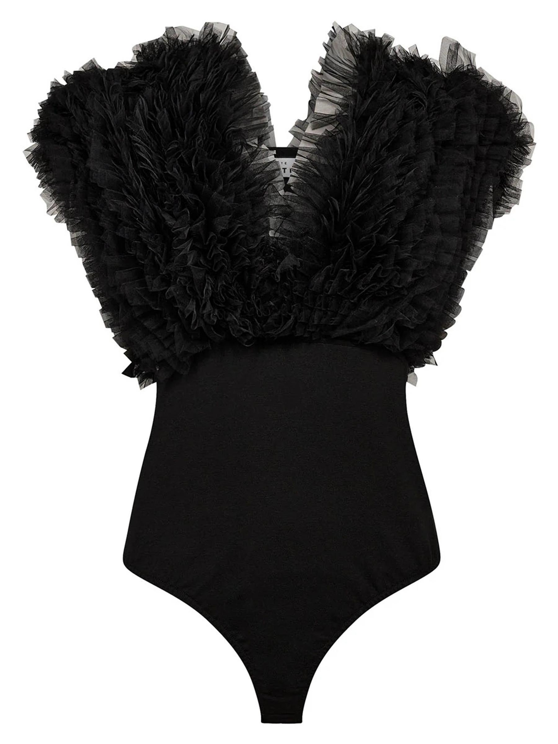 Deze zwarte bodysuit van Haute L’Amitié is een echte blikvanger voor avonden waarop je outfit net wat extra mag doen. De diepe V-hals is afgewerkt met volumineuze ruches en geeft meteen een uitgesproken look. Combineer met een high waist jeans of pantalon en je bent klaar om te gaan.