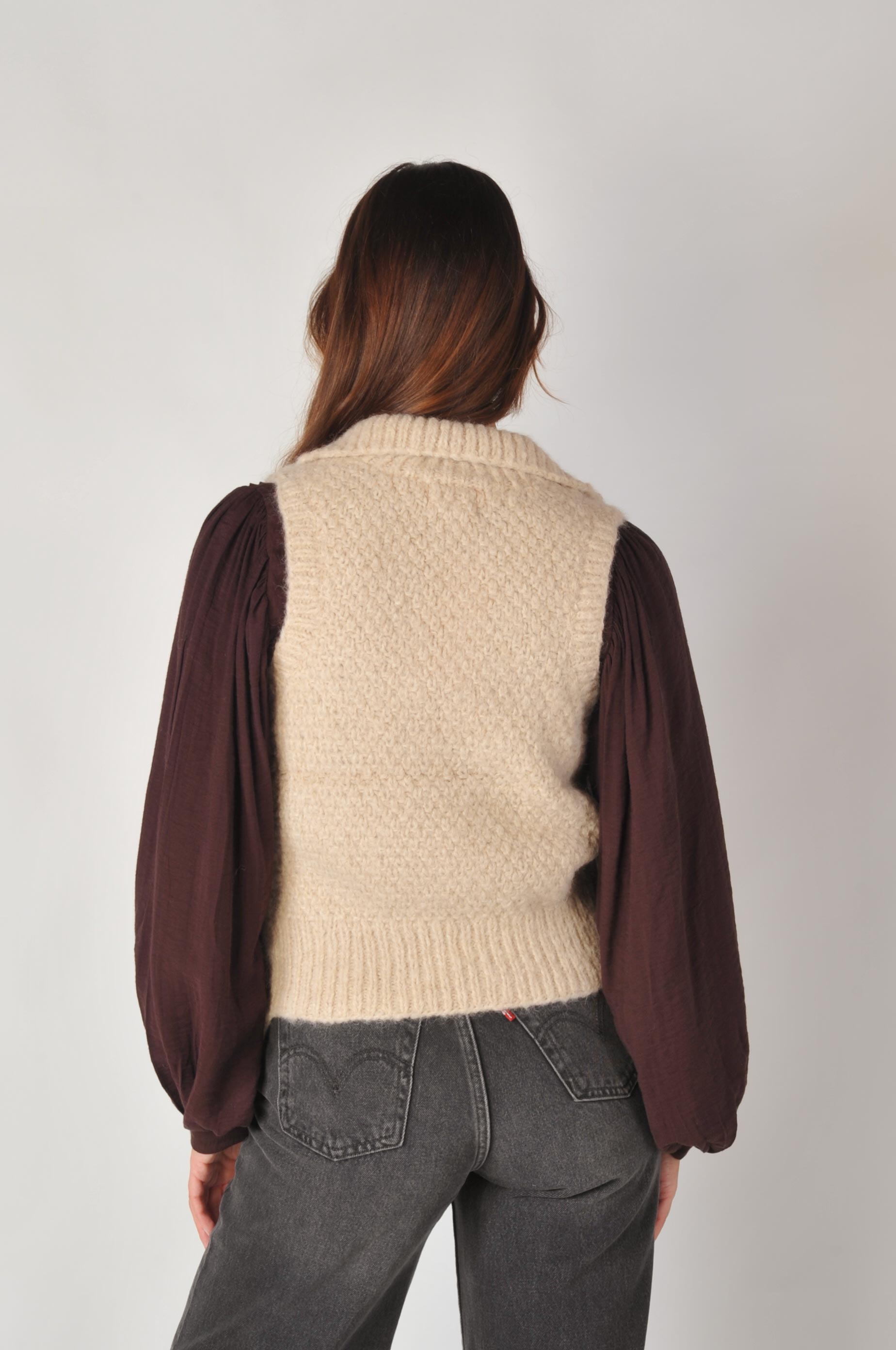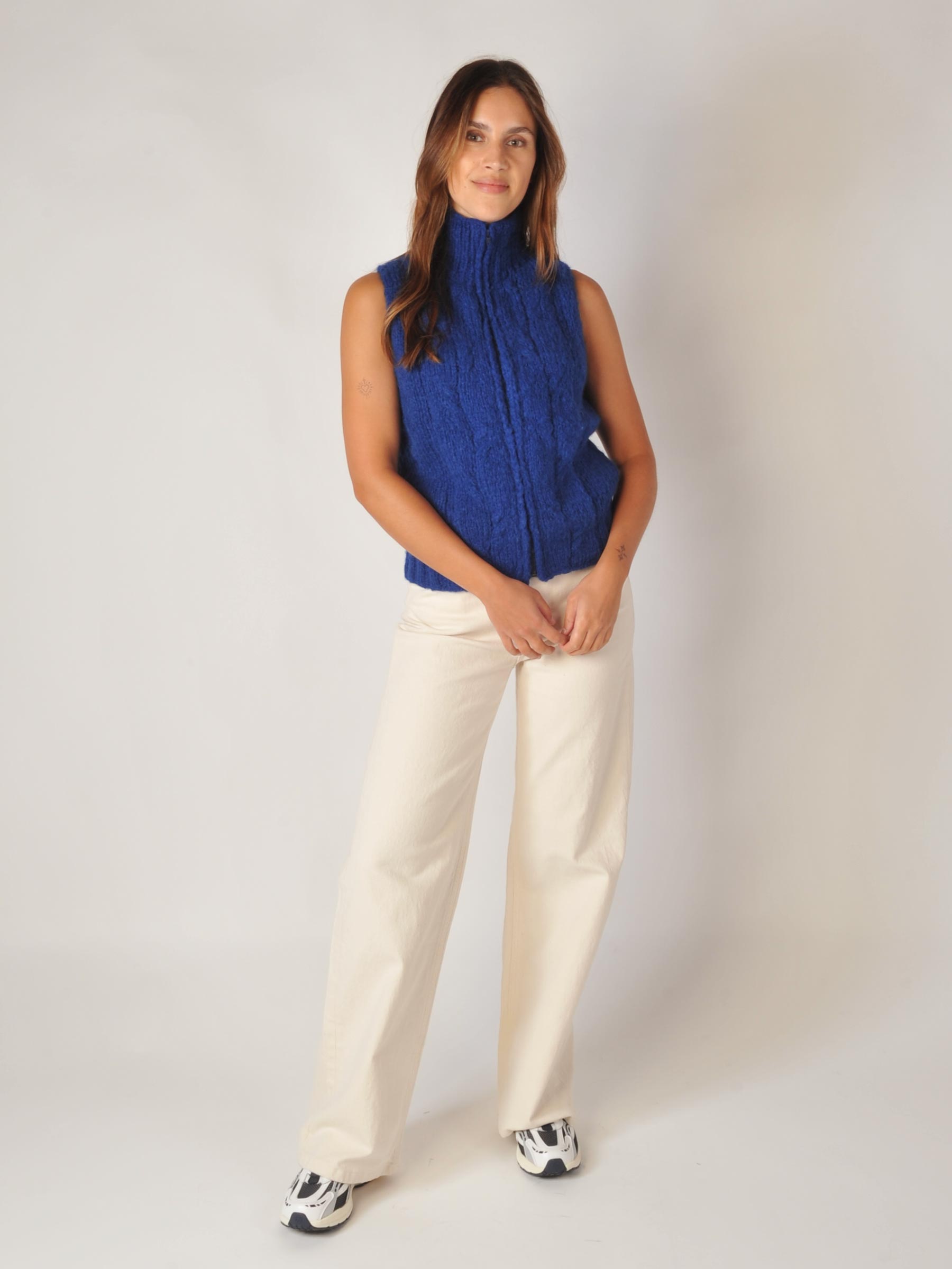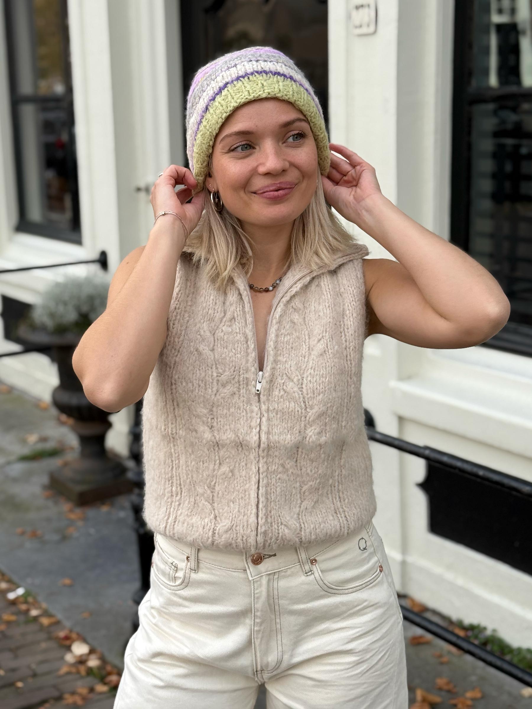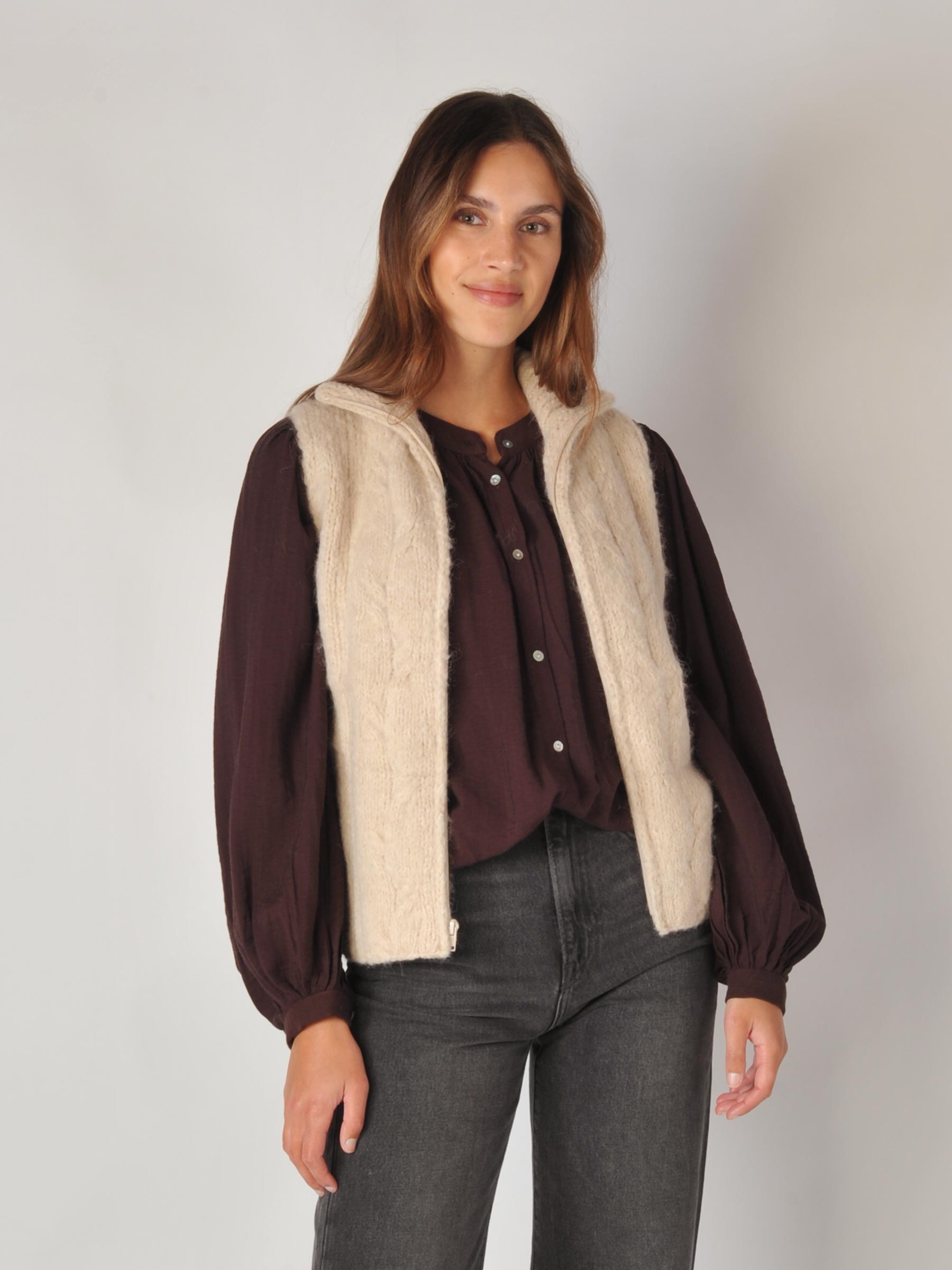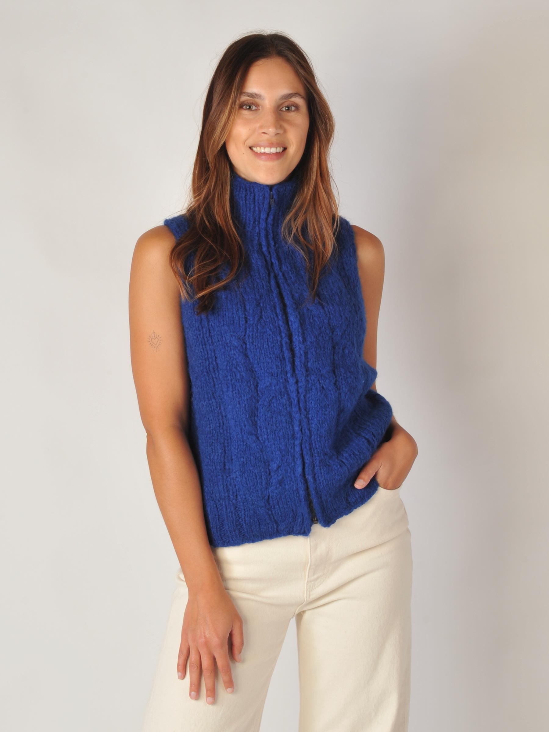 Een uniek stuk van Inti: dit alpaca gilet is handgebreid in Ecuador en zit vol karakter. Het kabelbreisel geeft extra structuur en de super zachte wol voelt warm en comfortabel. Met de ritssluiting en opstaande kraag is dit gilet perfect om te layeren over een blouse of longsleeve.