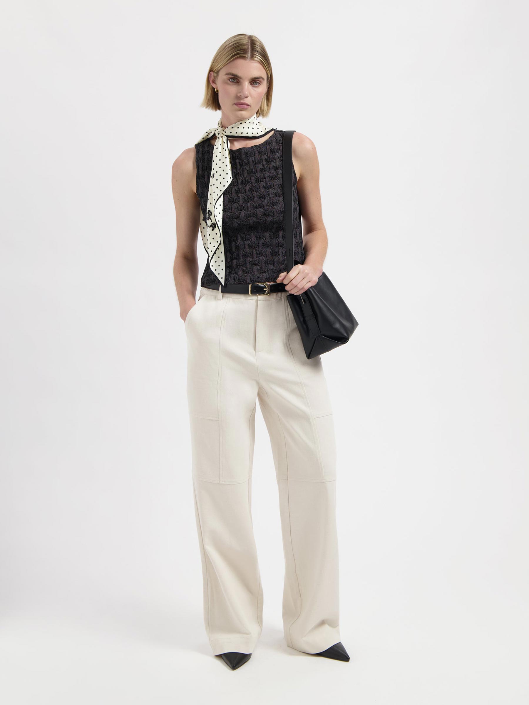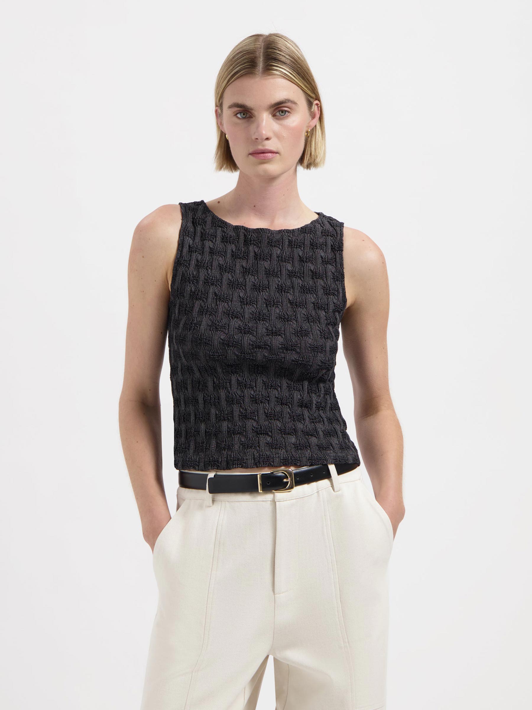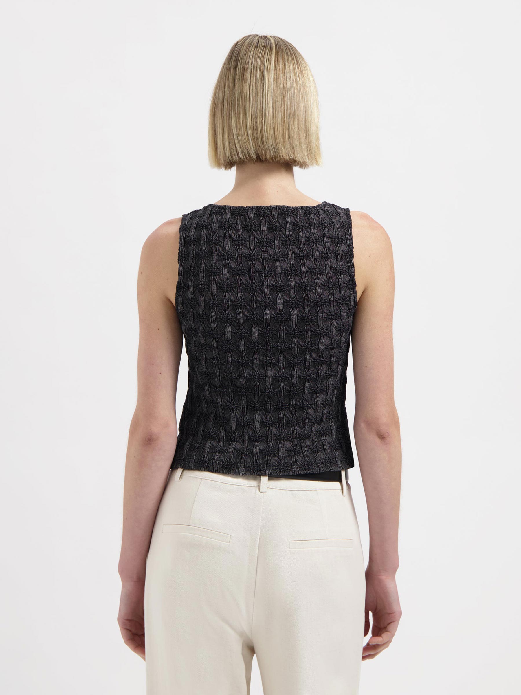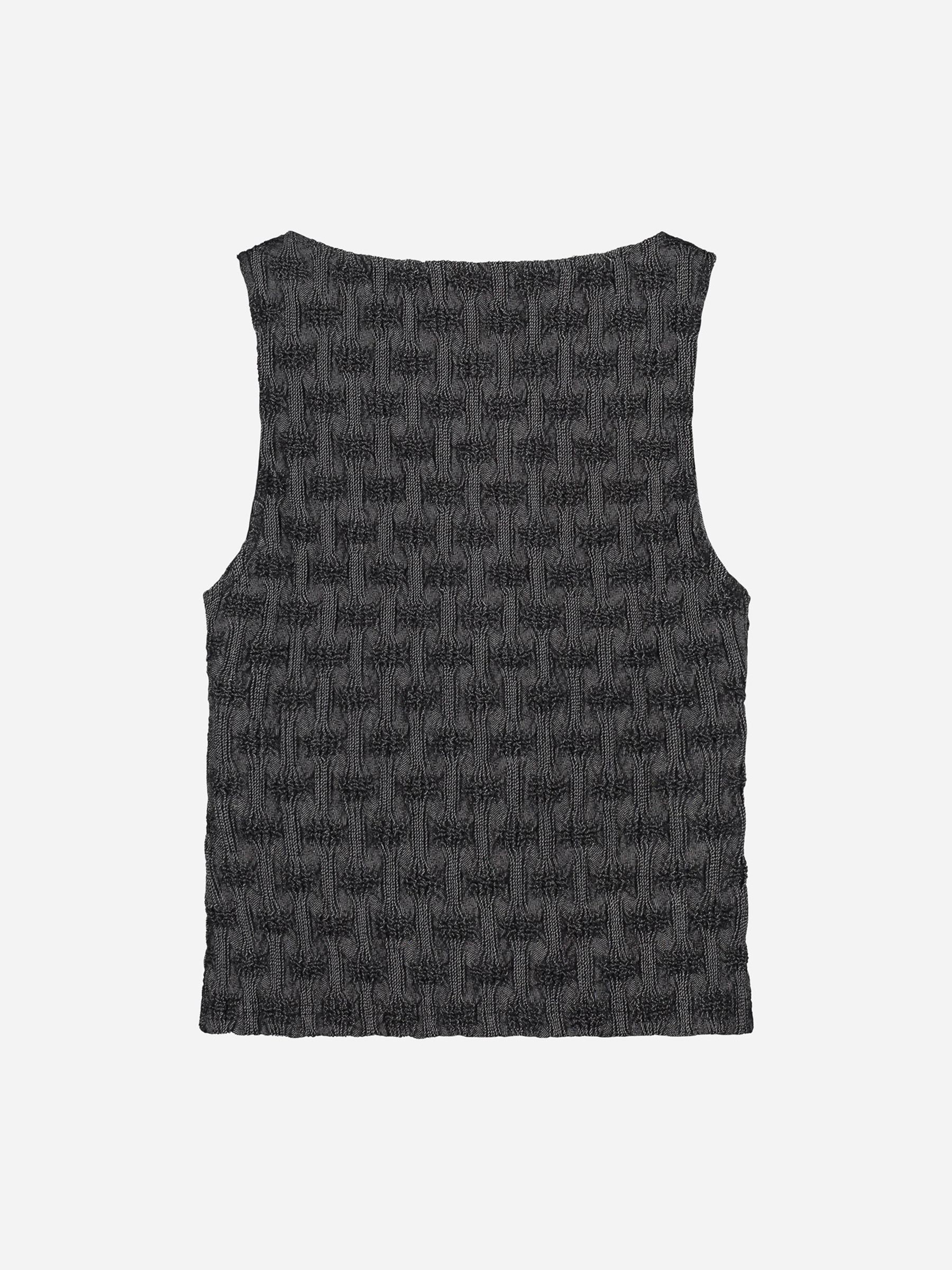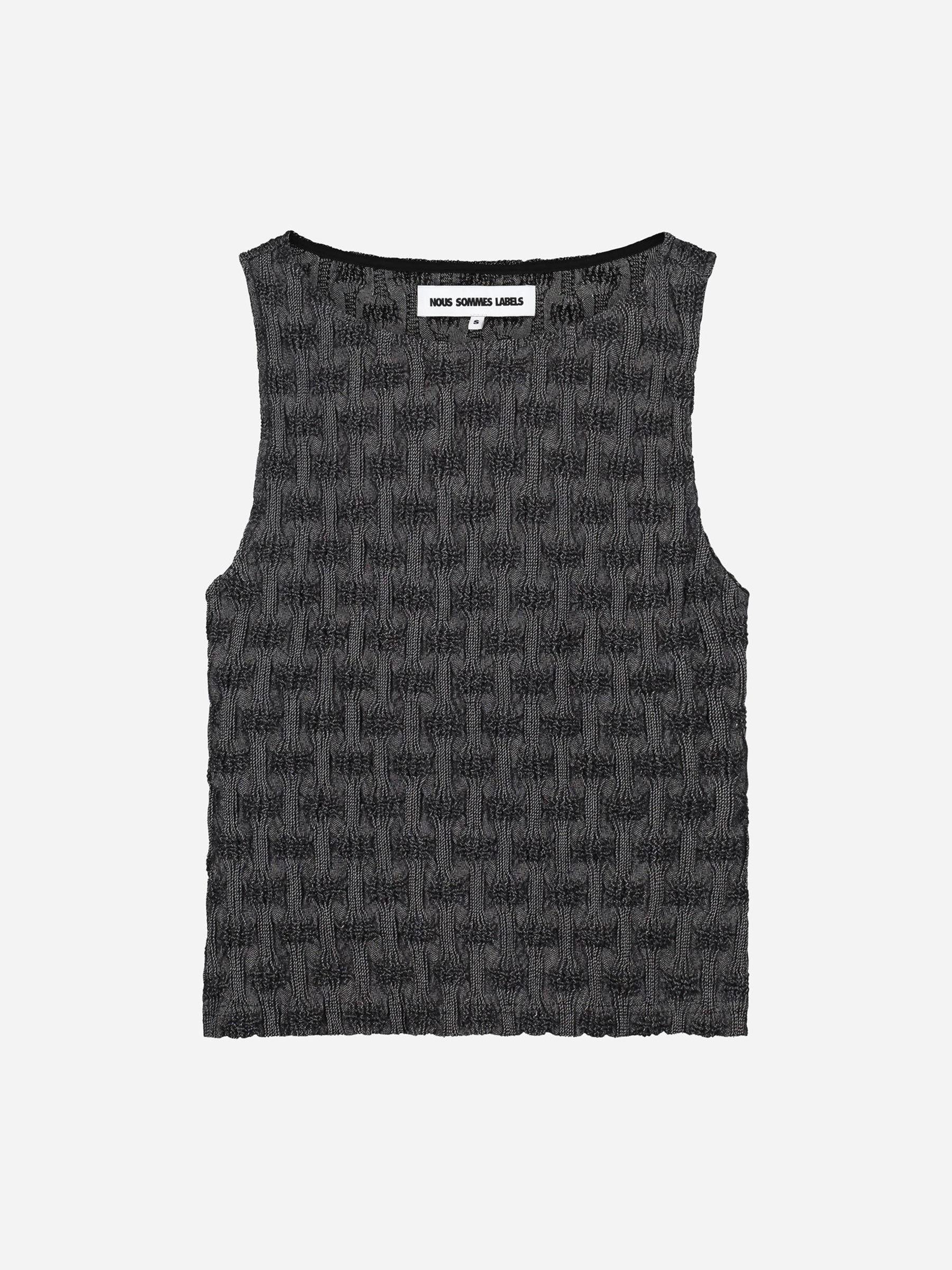 Deze donkergrijze top van Nous Sommes Labels laat meteen zien hoe sterk een simpele basis kan zijn. De structuurstof en aansluitende pasvorm zorgen voor een mooi silhouet en maken deze top perfect om solo te dragen of als laagje onder een blazer of vest.