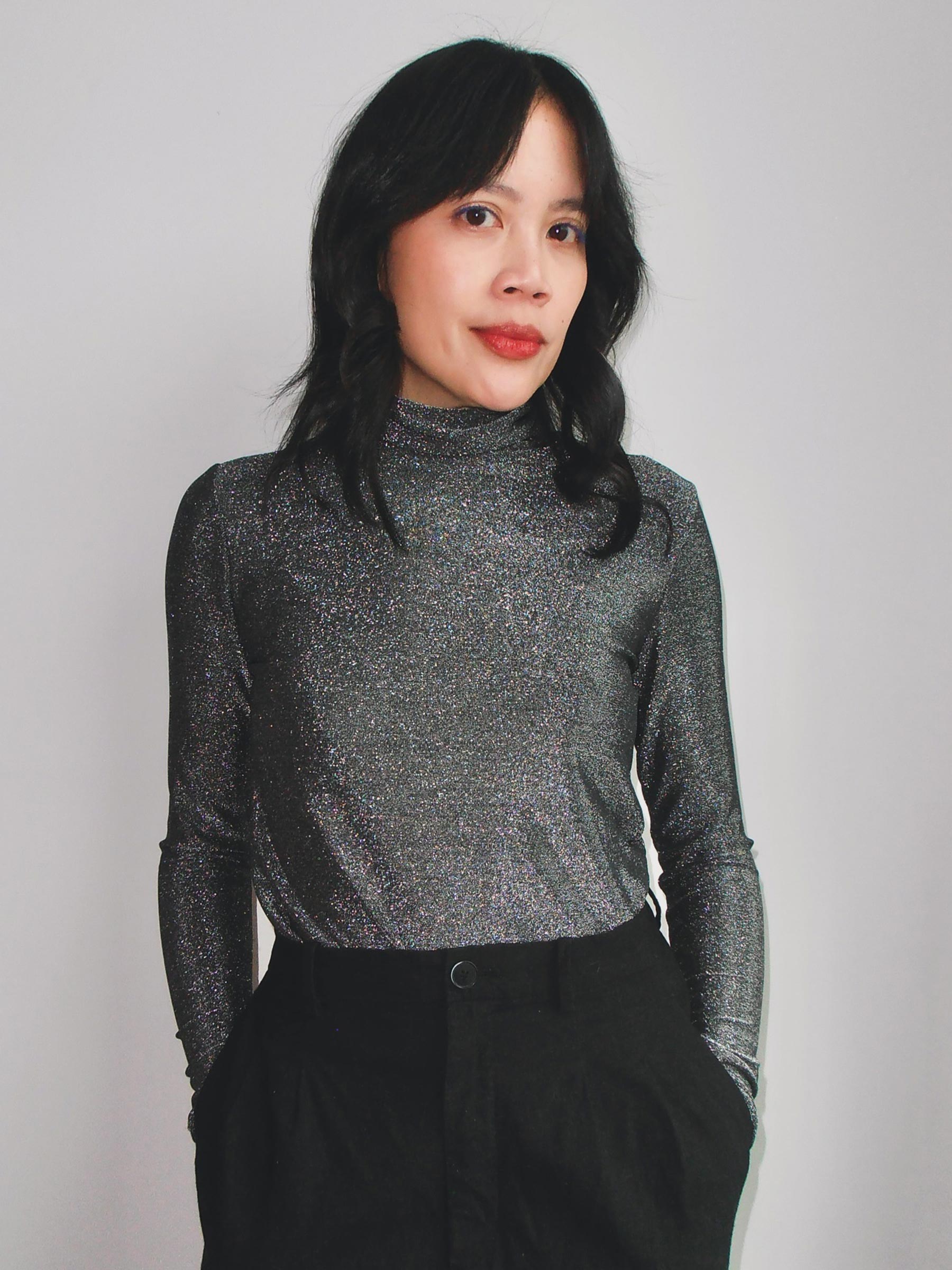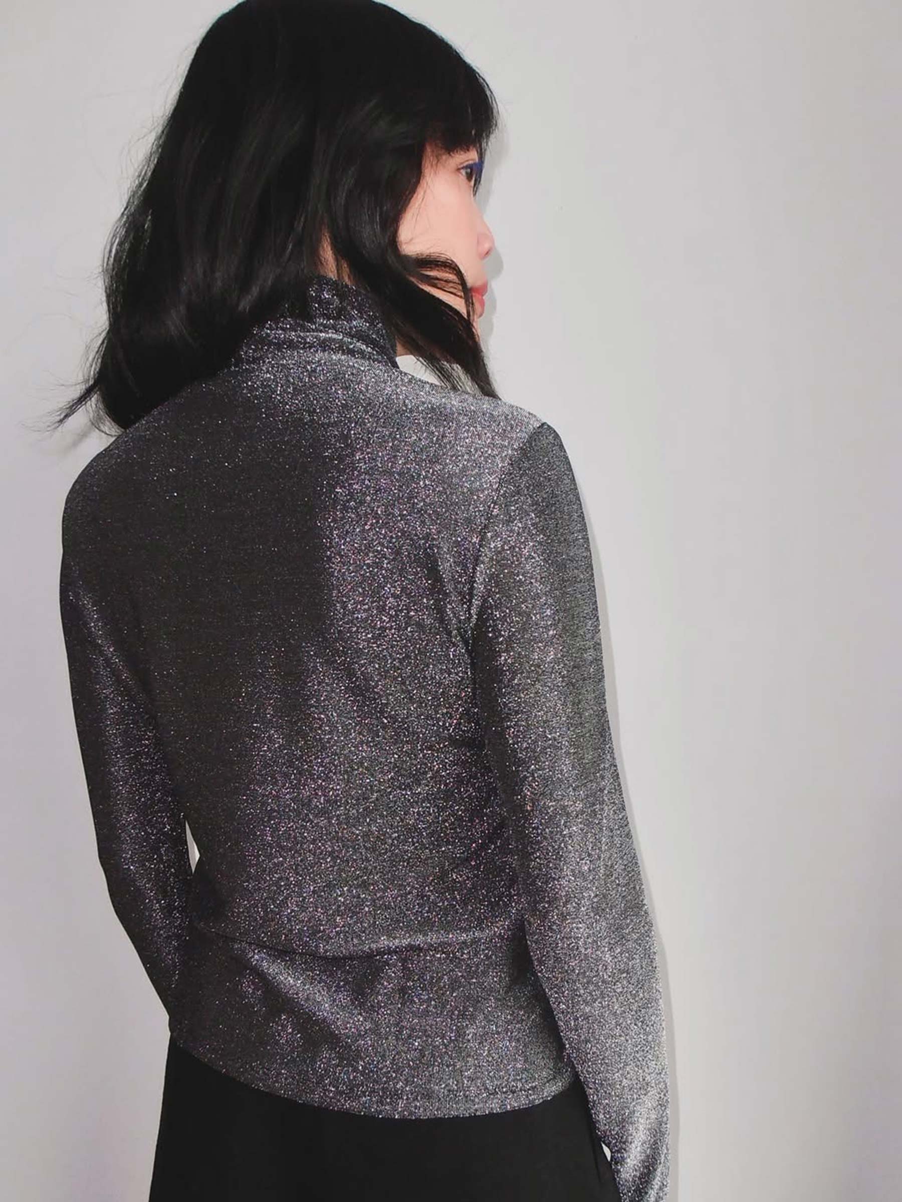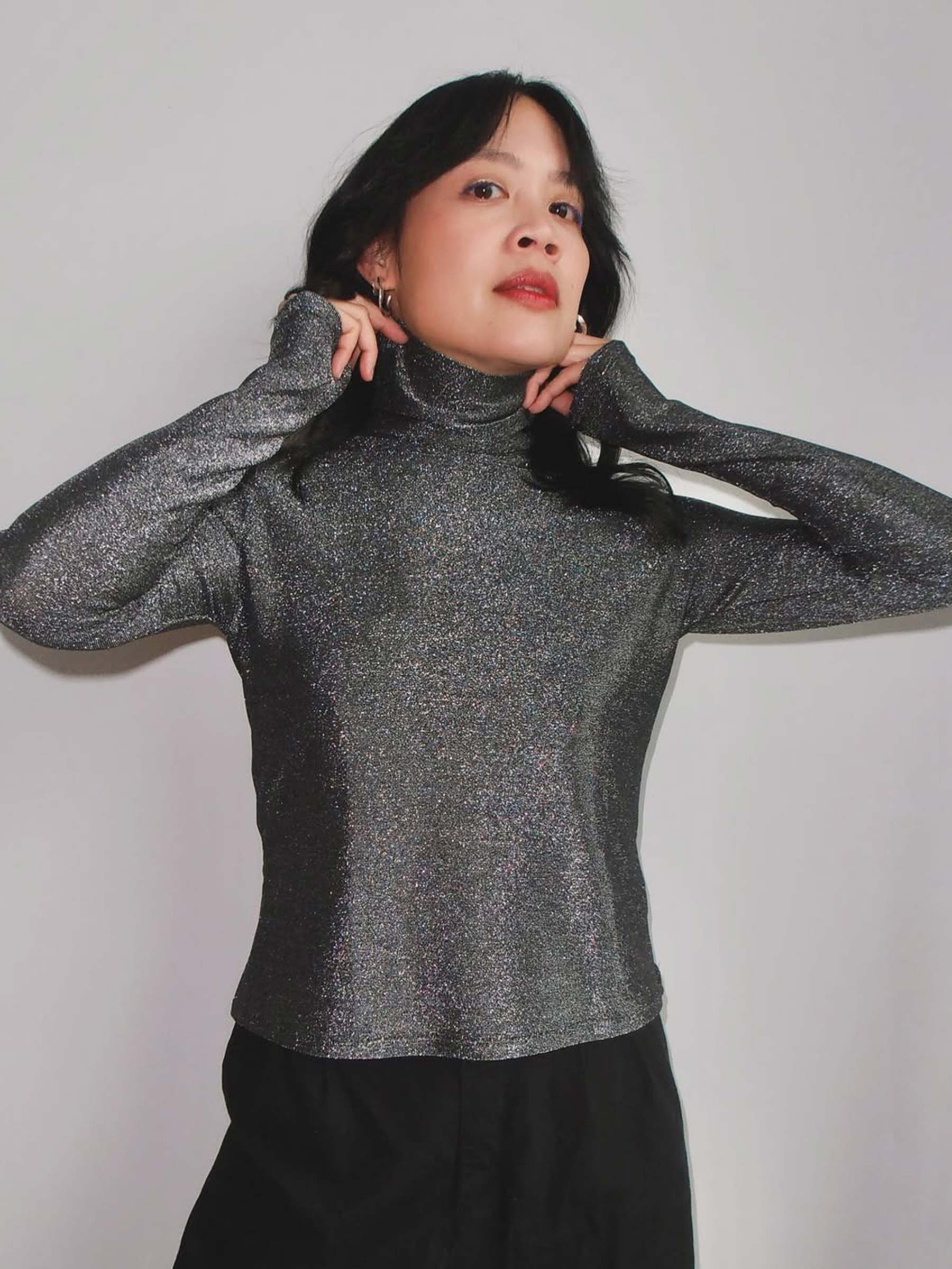 Deze grijze glitter coltrui van Kiki.Fox Amsterdam is gemaakt om te shinen! De stretchende glitterstof zit lekker aangesloten en is perfect om zo te dragen of juist als laagje onder een blazer of vest. Extra fijn idee: dit item is gemaakt van zorgvuldig gekozen deadstock stof.