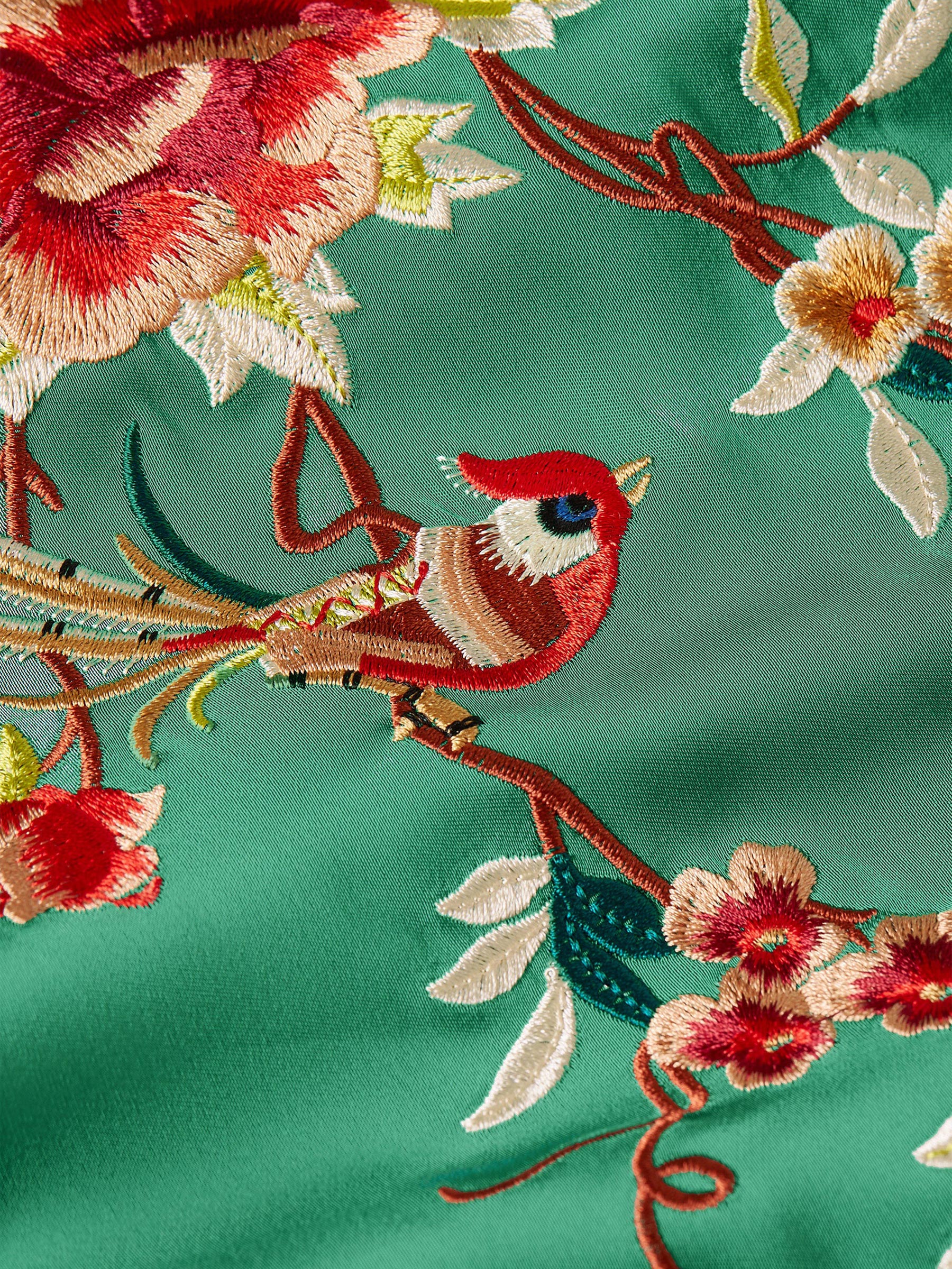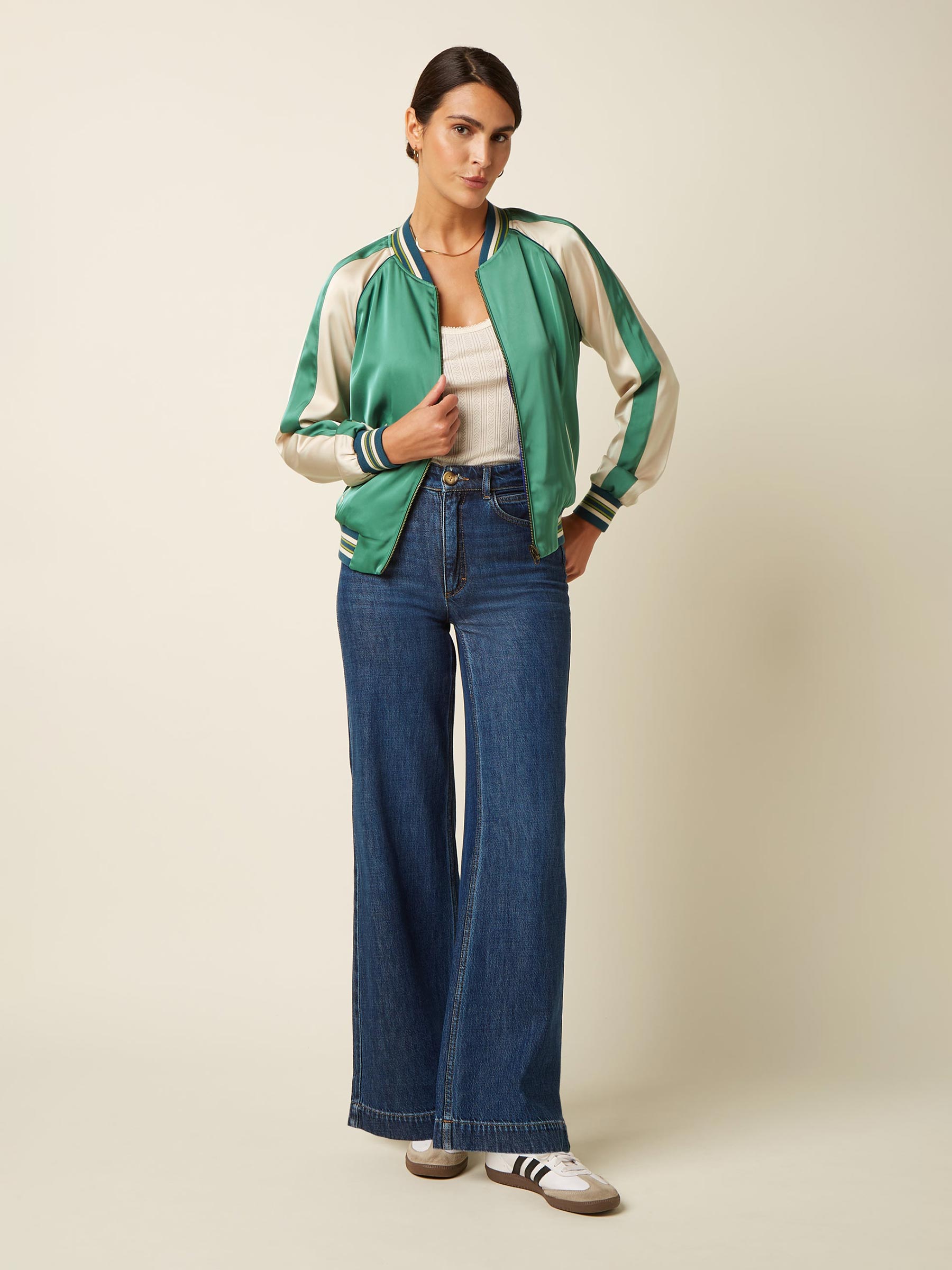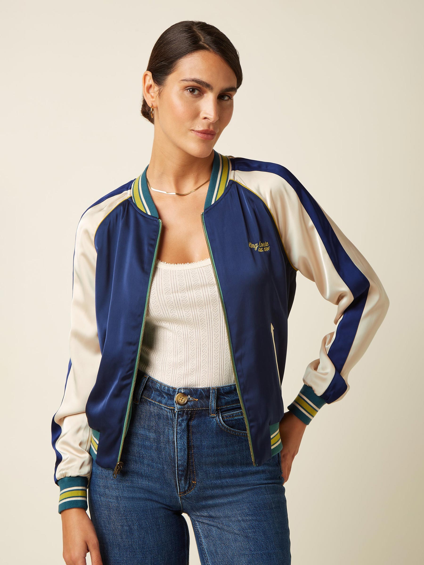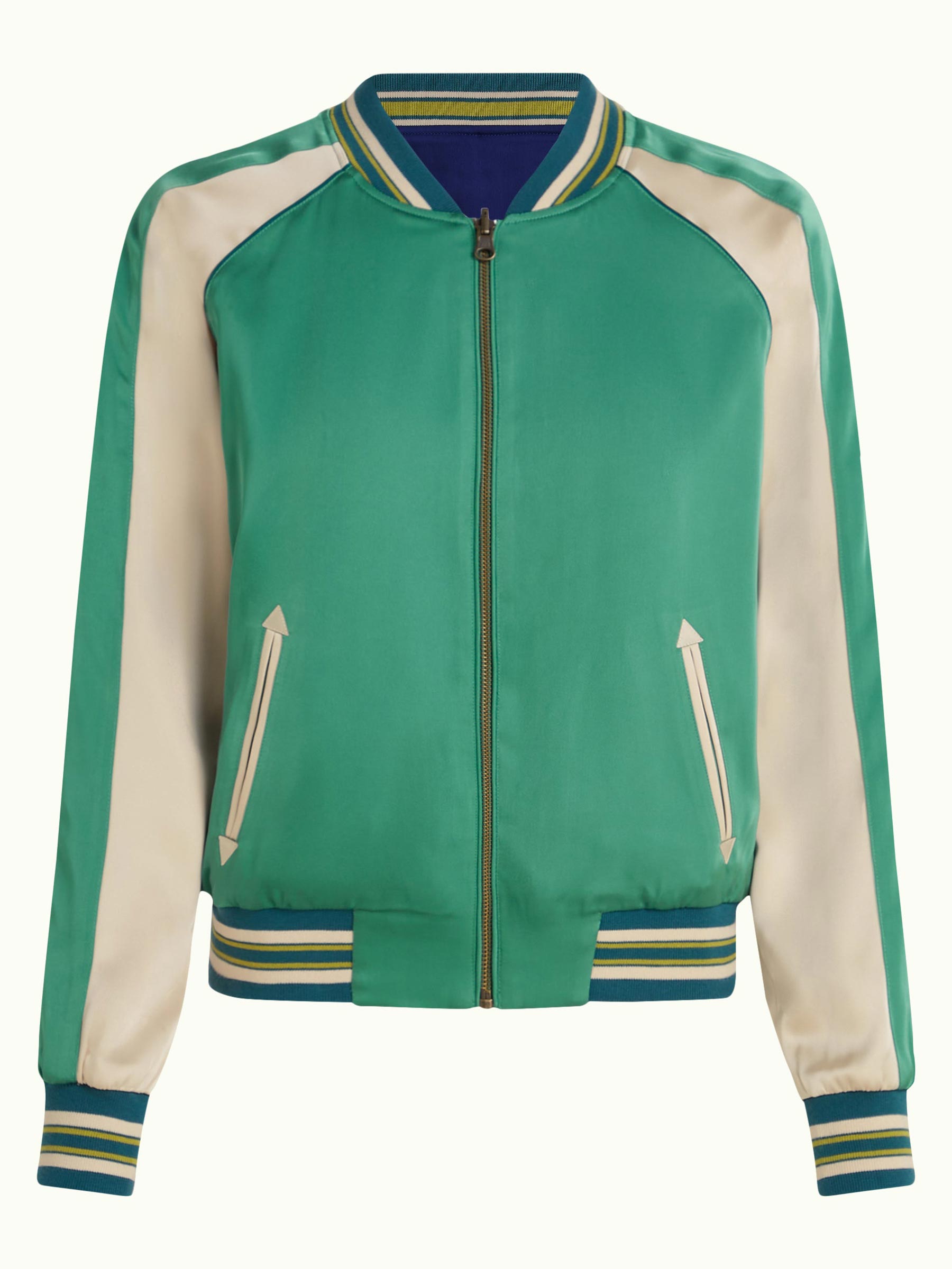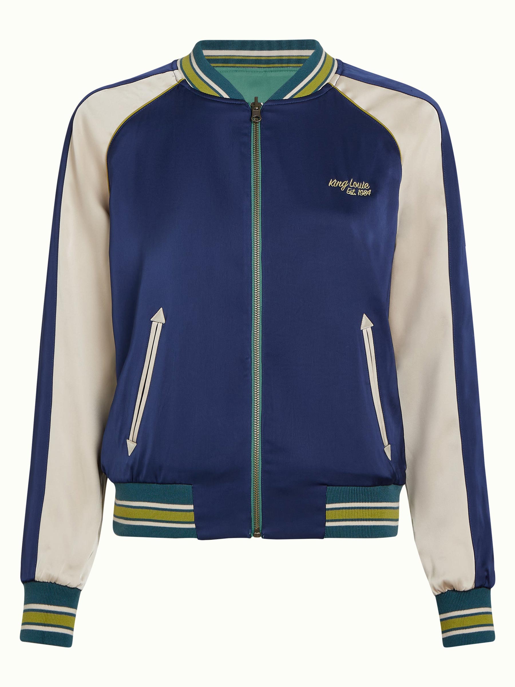 Twee jackets in één, dat is precies wat deze bomber Jacket van King Louie je geeft. De groene kant heeft een satijnachtige glans met crèmekleurige raglanmouwen en prachtig geborduurde bloemen en vogels op de rug. Draai de jacket binnenstebuiten en je hebt een volledig andere look: donkerblauw met speelse contrasterende strepen op de ribboorden.